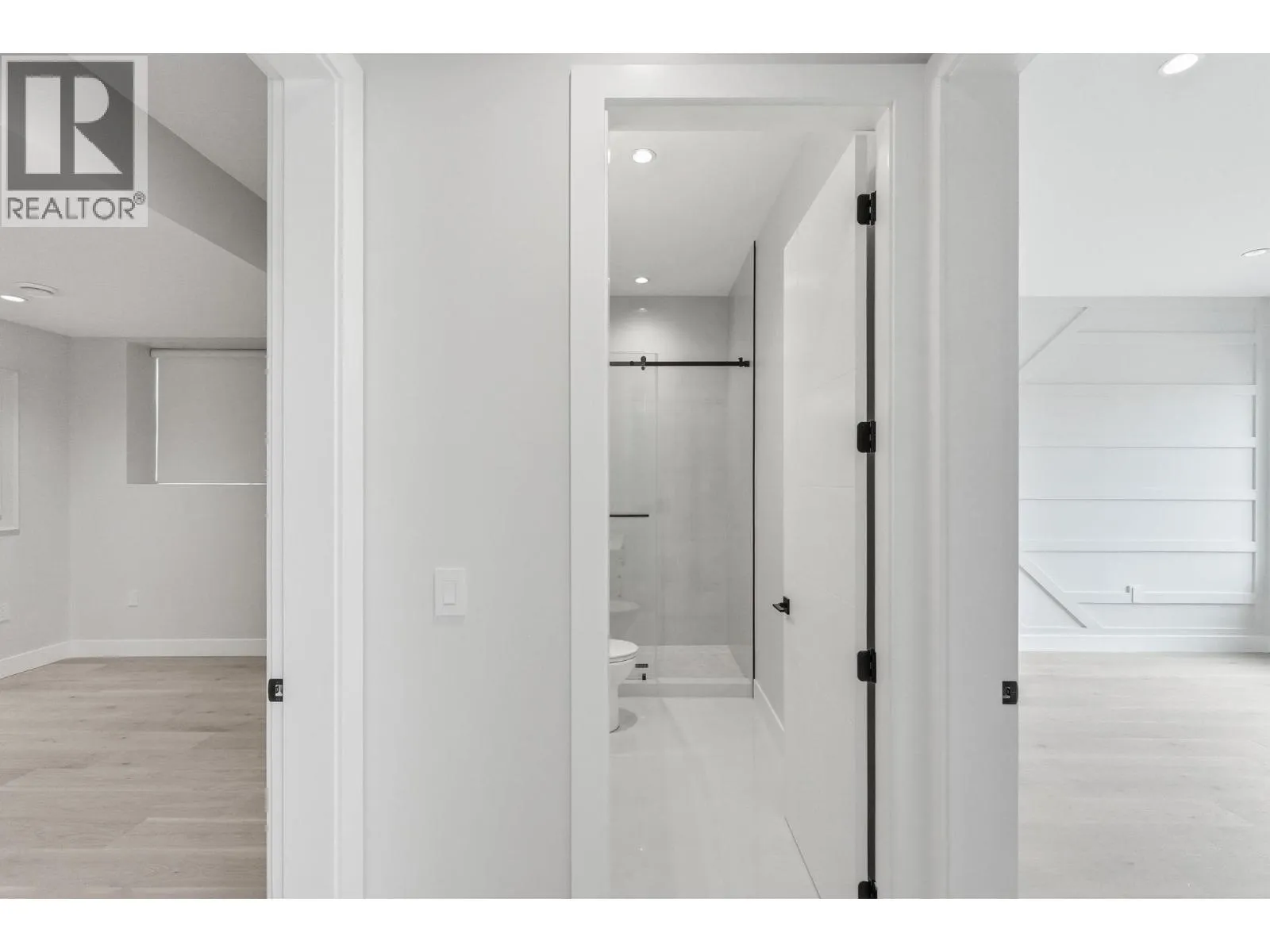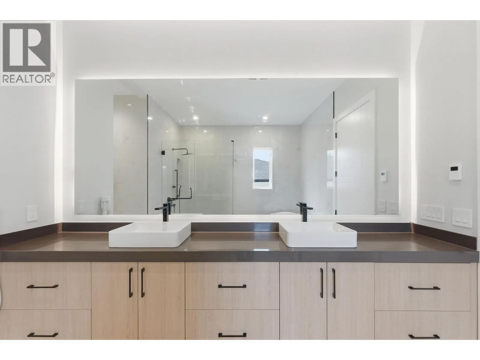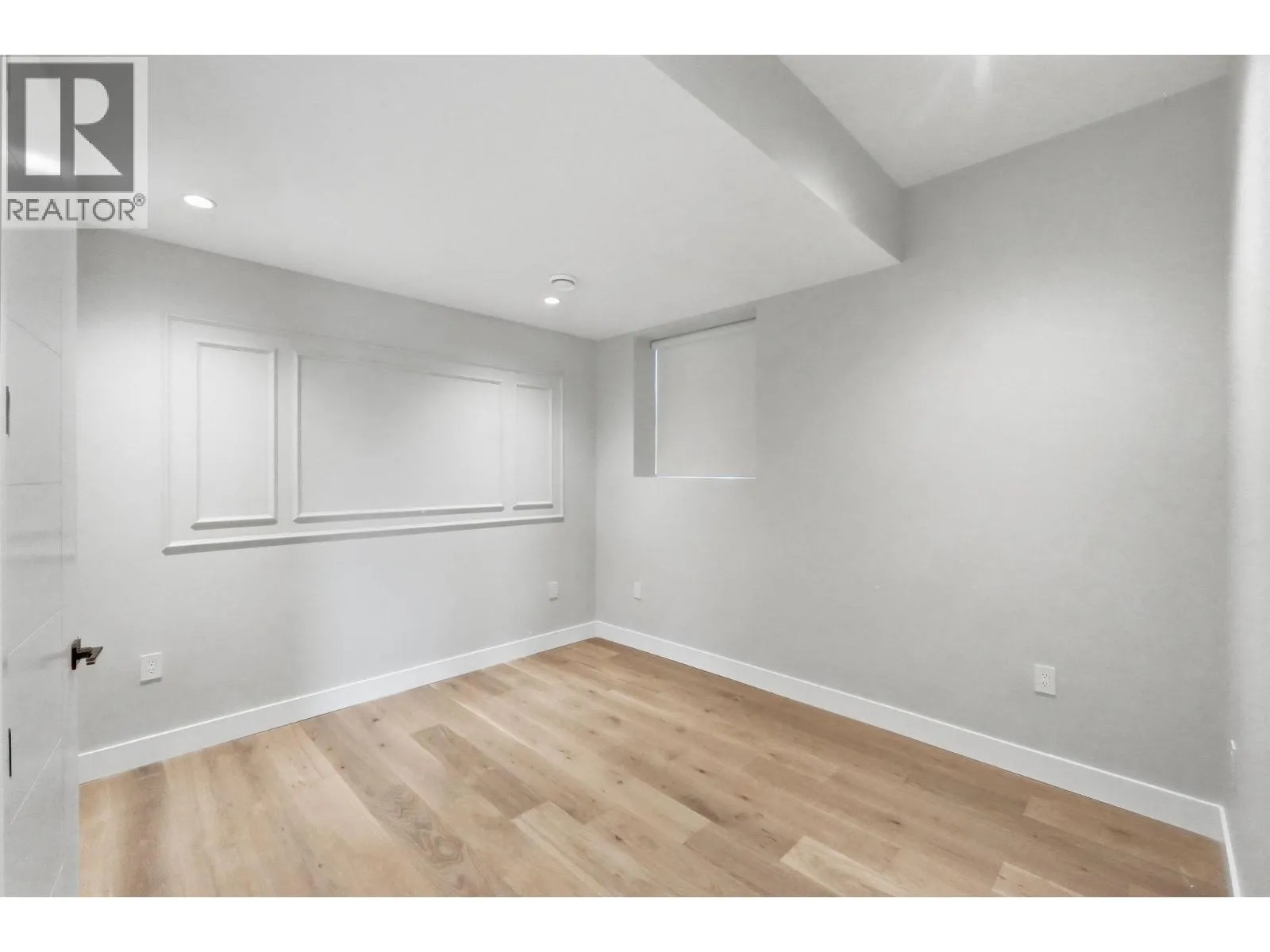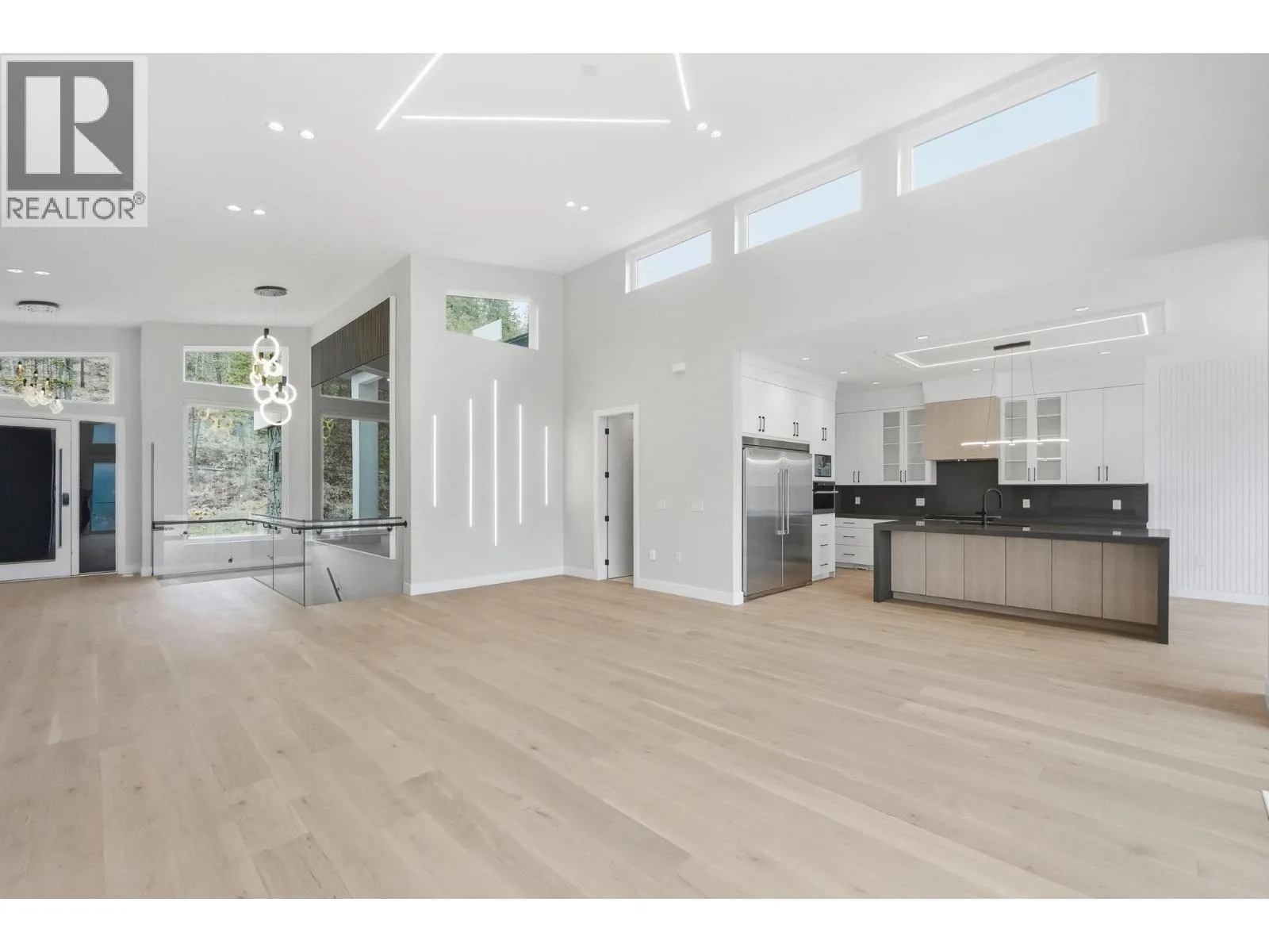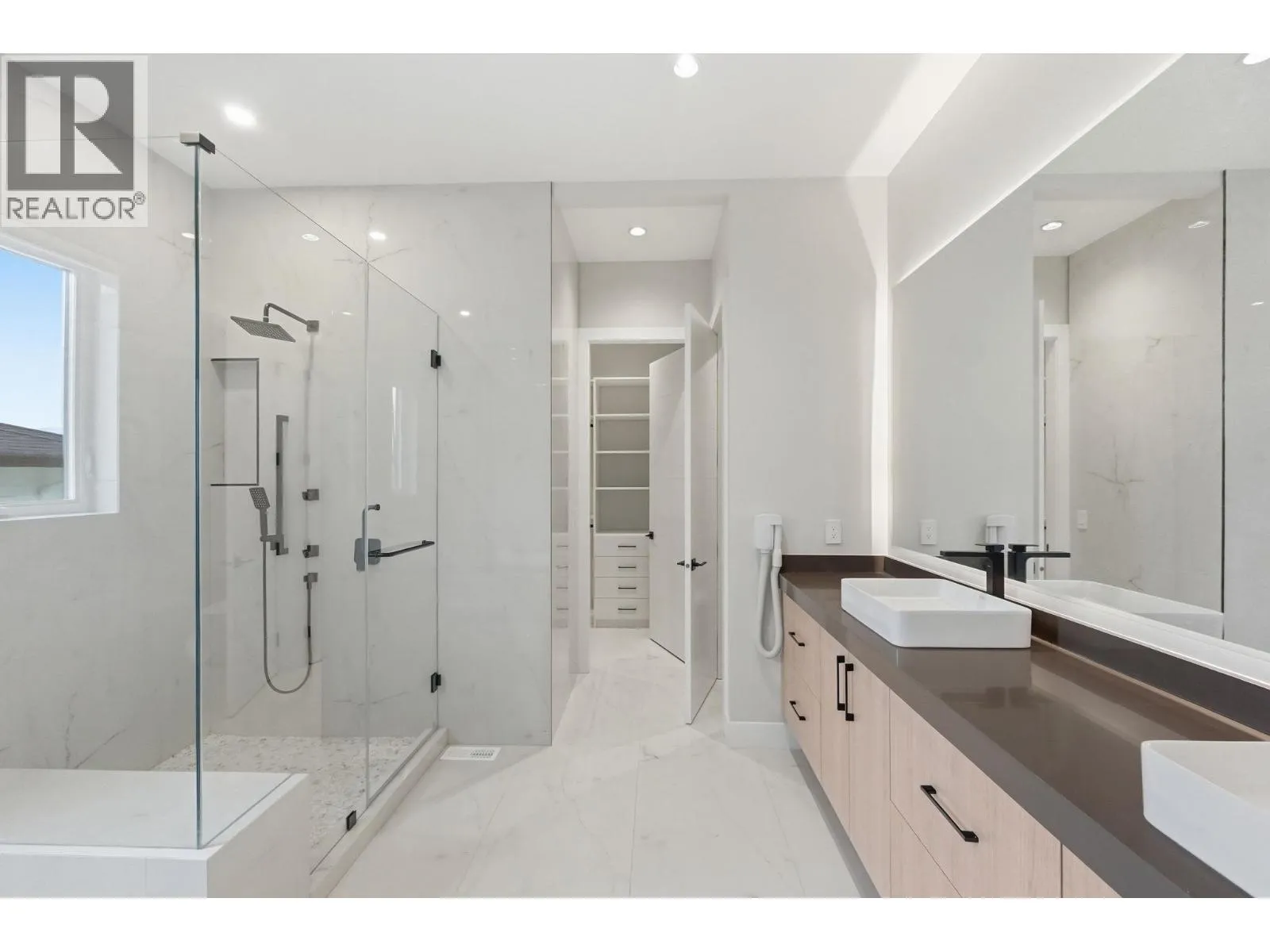 Perched on the hillside in desirable Black Mountain, this exceptional 6-bedroom, 4-bathroom residence offers stunning valley views, thoughtful design, and modern luxury throughout. Expansive windows flood the home with natural light, complemented by elegant lighting selections that allow you to set the perfect atmosphere day or night. The main living area features engineered hardwood flooring and a beautifully designed chefâs kitchen equipped with premium Electrolux appliances, a gas range, and an oversized chefâs refrigerator. A fully equipped spice kitchen provides additional space for cooking and entertaining while keeping the main kitchen pristine. Upon entry, a striking custom glass display above the staircase, crafted with a single joint, creates a dramatic focal point and enhances the homeâs open feel. The layout flows seamlessly from the kitchen and living area onto a balcony with its own fireplace which is perfect for enjoying Okanagan evenings. Downstairs offers a spacious second living area, two additional bedrooms, and an impressive 23 ft x 23â6â theatre room complete with a built-in bar. The property also includes a private 2-bedroom suite currently rented for $2,000 per month, positioned along the side of the home to maximize privacy. Additional features include a double garage with epoxy flooring, irrigated landscaping, a generous backyard, and the added benefit of GST being paid by the seller. (id:27476)
