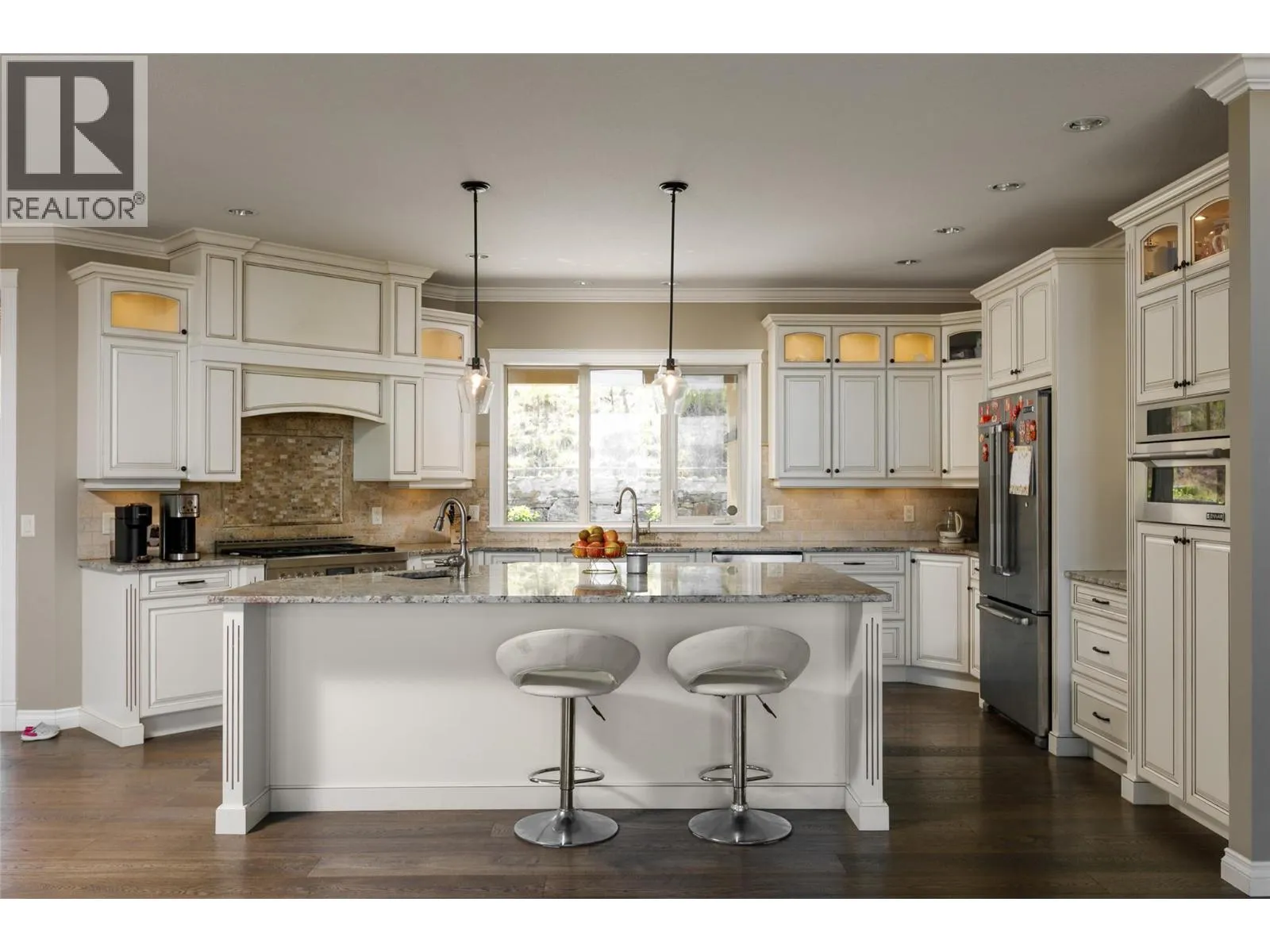 Looking for both luxury and value? This stunning custom home offers the best of both worlds plus valley, mountain and lake views beyond all in the sought-after Highlands Kettle Valley neighborhood! Built with incredible attention to detail, this 4 bedroom, 4 bathroom home showcases quality finishings throughout. The main floor features an open concept layout with soaring ceilings, oversized windows and glass doors that capture the breathtaking views and lead to spacious sundecks and a covered deck perfect for sunset watching and BBQs. The chefâs kitchen is designed for entertaining with gorgeous granite countertops, a large flat island with bonus prep sink, and premium Jenn-Air appliances including a 6-burner gas range. The luxurious primary suite offers a spa-inspired 5-piece ensuite with heated floors, travertine tile, glass rain shower, soaker tub and a large walk-in closet with built-in organizers. A second main floor bedroom includes patio access and its own ensuite. The lower level is ideal for family living with a large rec room, games room, media room with wet bar, two additional bedrooms, a full bathroom, storage and a mud room. The triple car garage features a double bay plus an extended single bay with EV hookup and space for a workshop and all your toys. Spacious room sizes throughout! Perfect for your growing family or empty nester looking for a great property to call home and entertain friends and family alike! (id:27476)