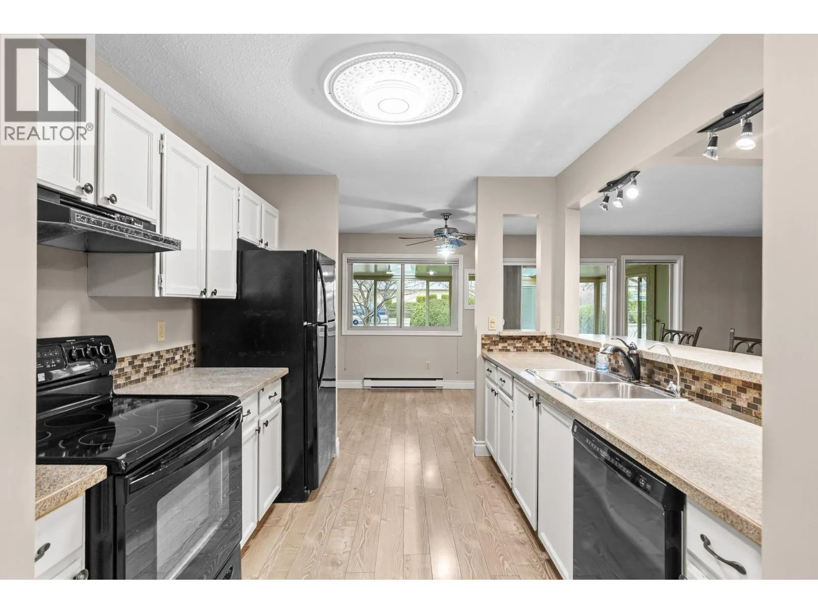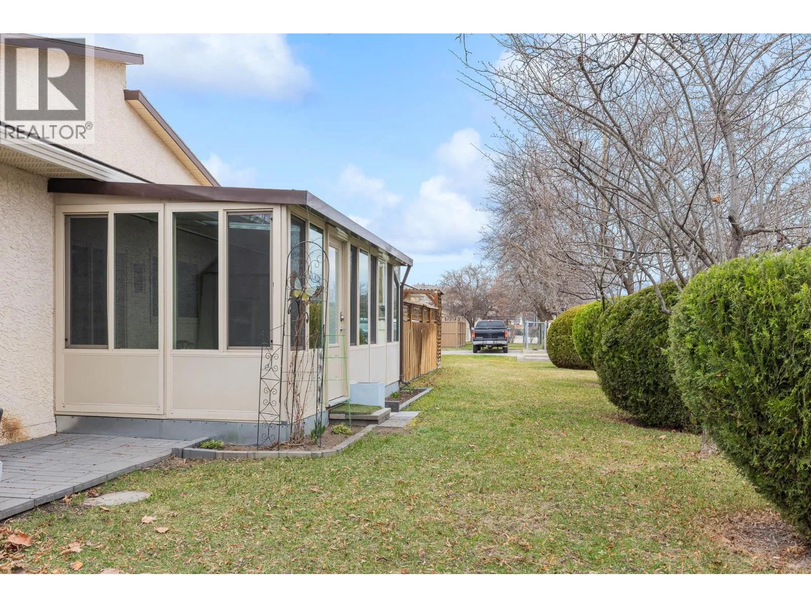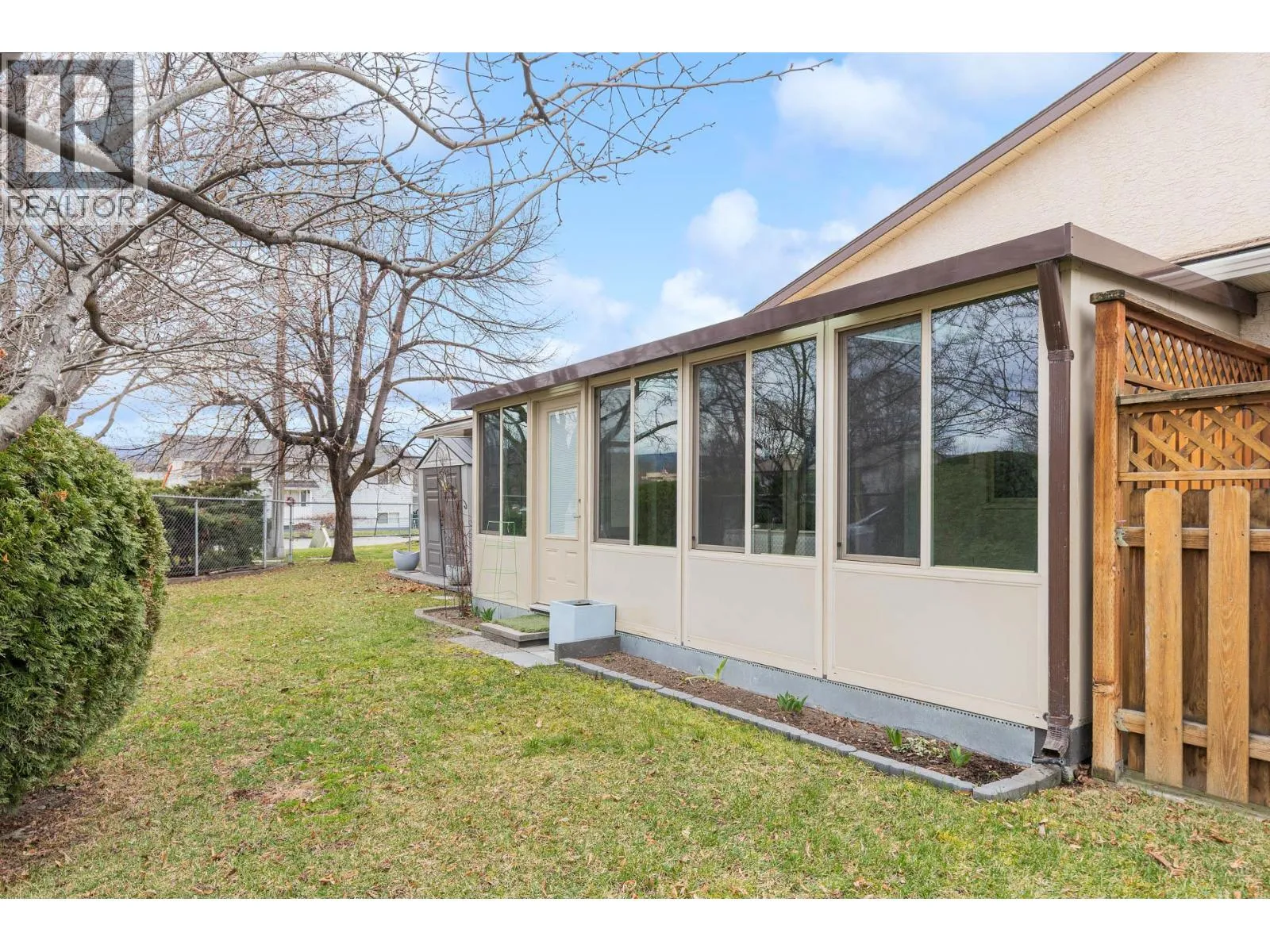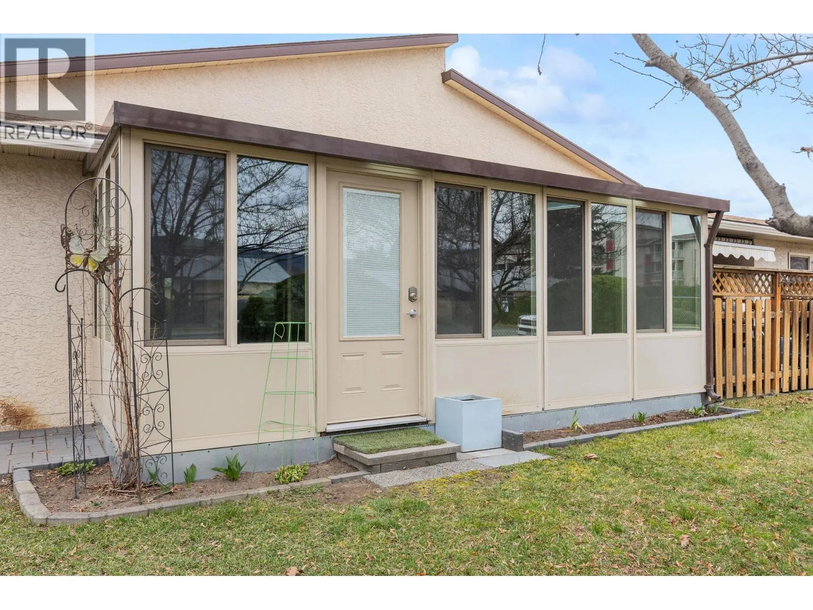 OPEN HOUSE Saturday the 28th 2pm-4pm....Beautifully Updated Rancher Townhome â A True Gem! Bright end unit offering exceptional privacy and natural light, this spacious 2 bedroom, 2 bathroom level-entry, one-story 55+ adult-oriented townhome offers approximately 1,400 sq. ft. of living space including the sunroomâone level living like this is so rare to find! Ideally located within walking distance to shopping, transit, and the Mission Creek Greenway, with a convenient bus route nearby. This home features a hard-to-find open floor plan, laminate flooring, updated trim, newer windows, a newer roof, no Poly B plumbing, and a newer hot water tank, with sunny south-facing exposure perfect for relaxing or entertaining. An absolutely amazing 300 sq. ft. quality-built sunroom adds exceptional living space and includes access to a crawl space and storage area, plus a door leading to the adjacent storage unit complete with a seating area. The updated kitchen showcases black appliances, while the expansive living and dining area offers a sliding glass door to the outdoor space. Enjoy two generous bedrooms, including a king-sized primary with walk-in closet and 3-piece ensuite, a full 4-piece main bathroom with skylight, a separate laundry and storage room off the entry, and covered parking, plus tons of visitor parking including a convenient space right at your door. Such a unique and special opportunity in a well-maintained community. PET RESTRICTIONS: 1 cat or 1 dog under 16'! (id:27476)