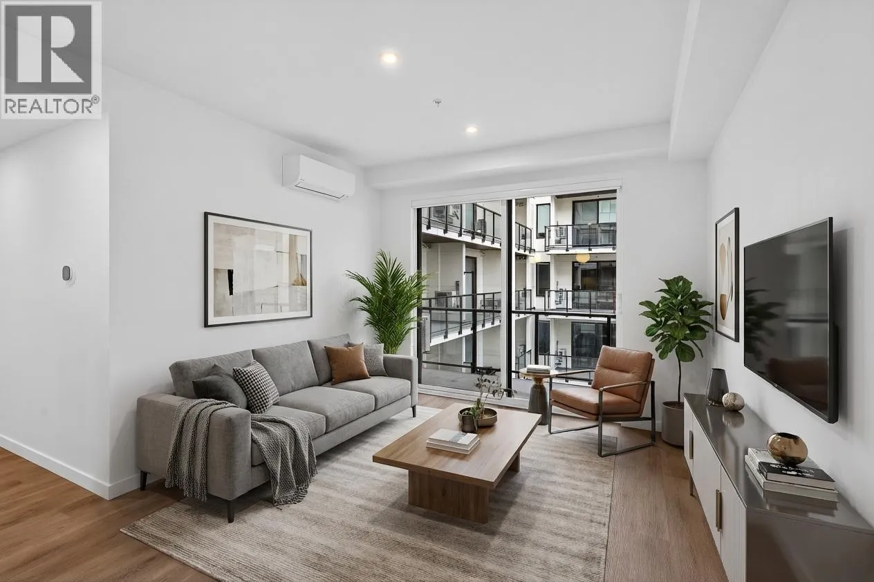Welcome to Five Crossingsâone of Kelownaâs most amenity-rich and lifestyle-focused communities. This bright 1 bedroom inside unit offers a smart, efficient layout and a quiet outlook toward the landscaped courtyard, creating a peaceful retreat in the heart of the city. Thoughtfully designed for modern living, the home features contemporary finishes, a sleek kitchen with built-in appliances, and efficient heating and cooling for year-round comfort. Five Crossings offers an incredible collection of lifestyle amenities. Residents enjoy a fully equipped fitness centre, yoga and zen lounge, co-working space, bike storage and repair station, and a convenient dog wash. The stylish residentsâ lounge is perfect for gathering with friends and features a full kitchen, golf simulator, pool table, projection screen, and fireplace. The sixth-floor rooftop is a standout feature, with expansive terraces, BBQs, covered outdoor dining with a fireplace, and multiple cozy fire pit areas to relax and take in the city and mountain views. Ground-level amenities include a bocce court, dog run, shared garden plots, MODO car share, and EV charging stations. This home also includes TWO storage lockersâan exceptional amount of space, a rare bonus! Located just steps from Capri Shopping Centre, restaurants, parks, and transit, Five Crossings offers convenient urban living with incredible amenities. (id:27476)