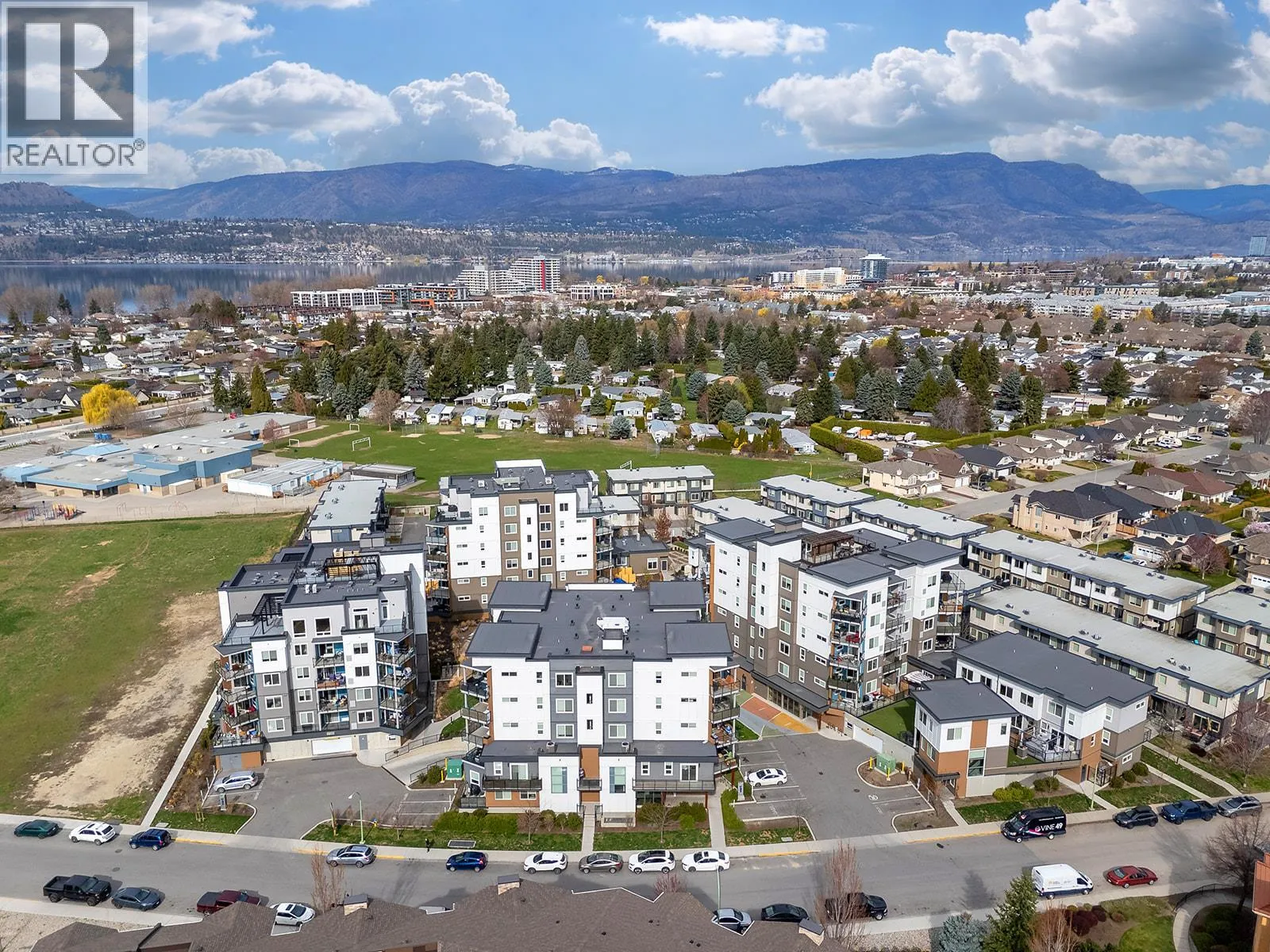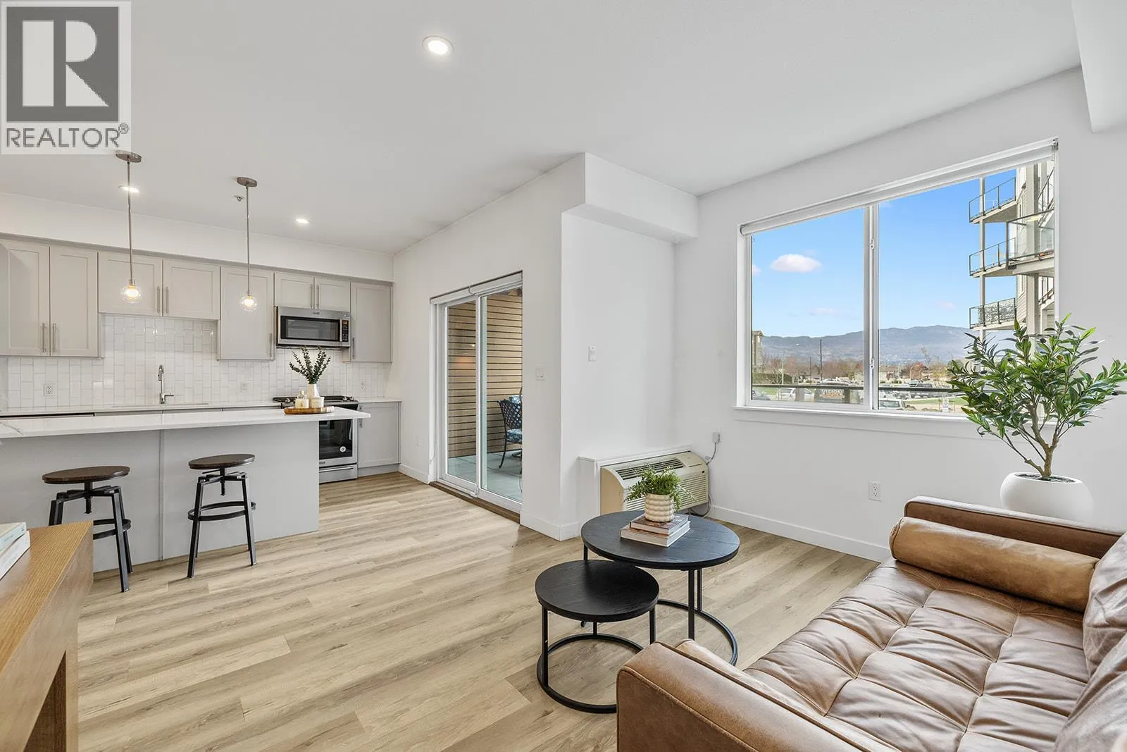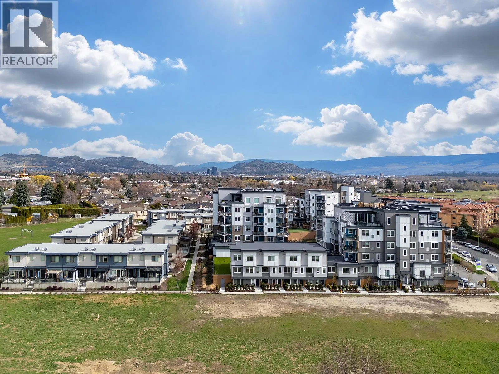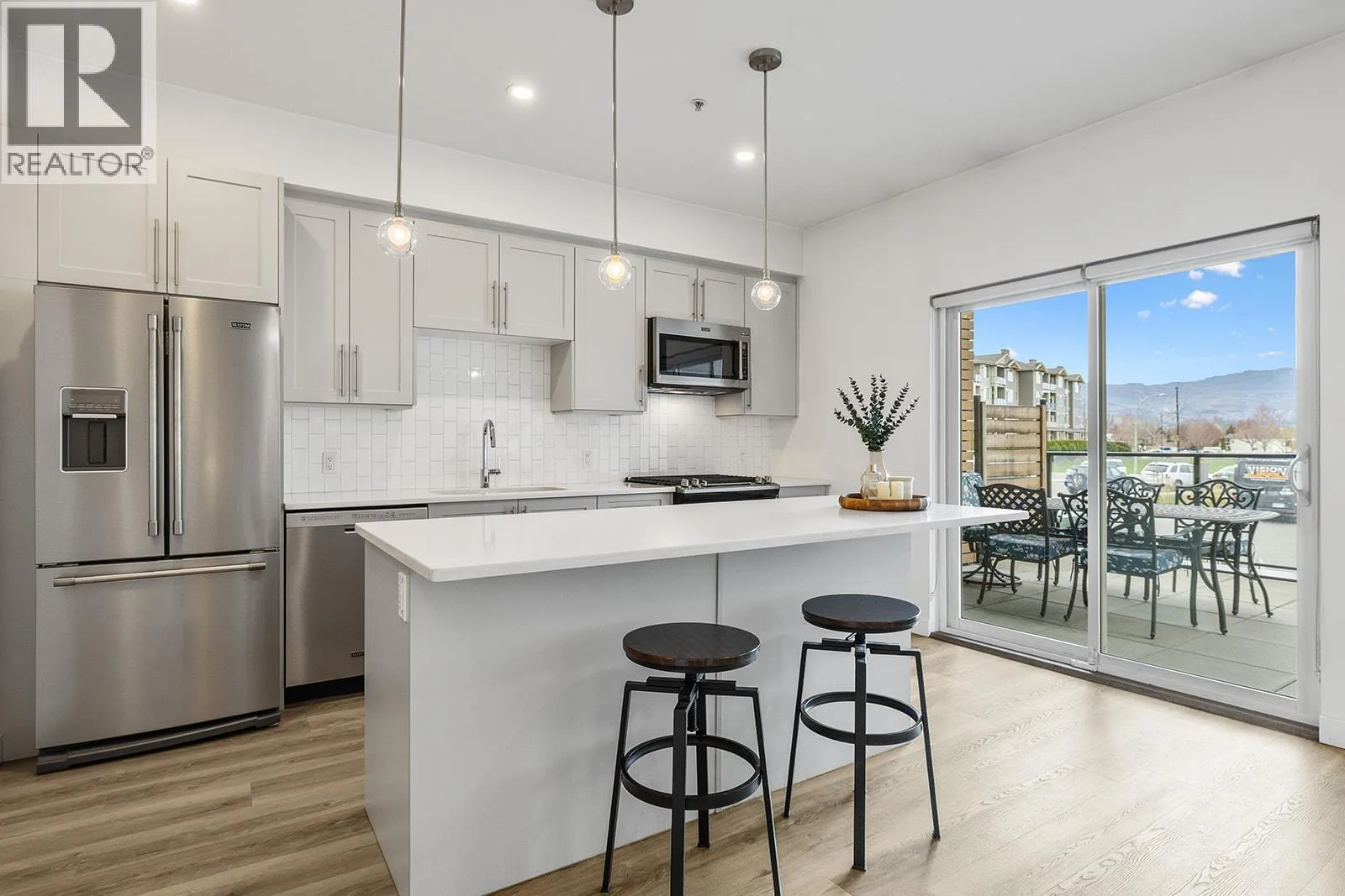 Immaculate 2 bed, 1 bath condo in Green Square, perfectly positioned in the heart of the Lower Mission. This lightly lived-in home shows like new and offers outstanding value for first-time buyers, professionals, or investors. Located just steps to schools, parks, beaches, and the future Casorso Park, and close proximity to Okanagan College and H2O Adventure + Fitness Centre, shopping, and restaurants. The modern kitchen features a large island with quartz countertops, upgraded Maytag stainless steel appliances, and sleek soft-close cabinetry. The open-concept layout flows seamlessly into the living space, leading to a massive partially covered deck complete with natural gas BBQ hookup, glass railings, and beautiful mountain views. Both bedrooms have large closets and sliding barn doors, offering flexibility for privacy or an open feel. The second bedroom easily functions as a home office or guest space. Green Square offers a full range of amenities including a fitness centre, rooftop patio with BBQ area, community garden, childrenâs playground, and a convenient dog wash station. Pet-friendly living at its best with 2 dogs (no vicious breeds), 2 cats or 1 of each allowed! Vacant and move-in readyâan exceptional opportunity in one of Kelownaâs most sought-after neighbourhoods. (id:27476)