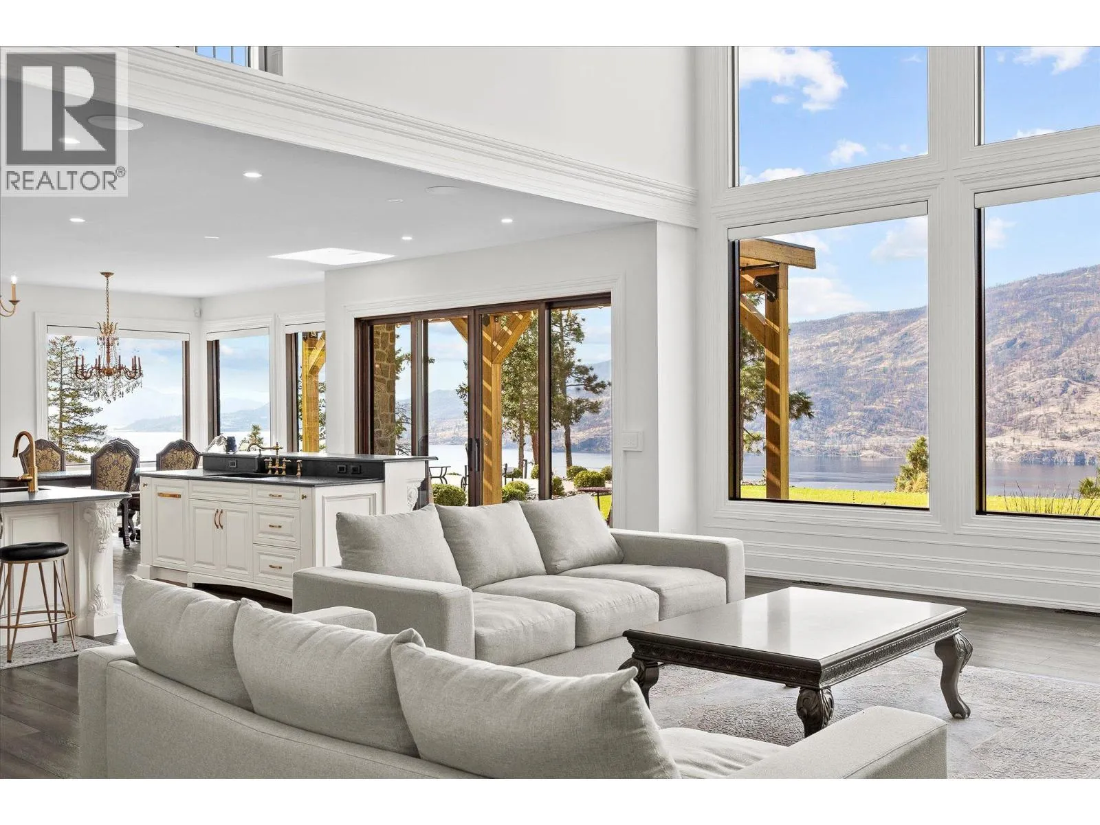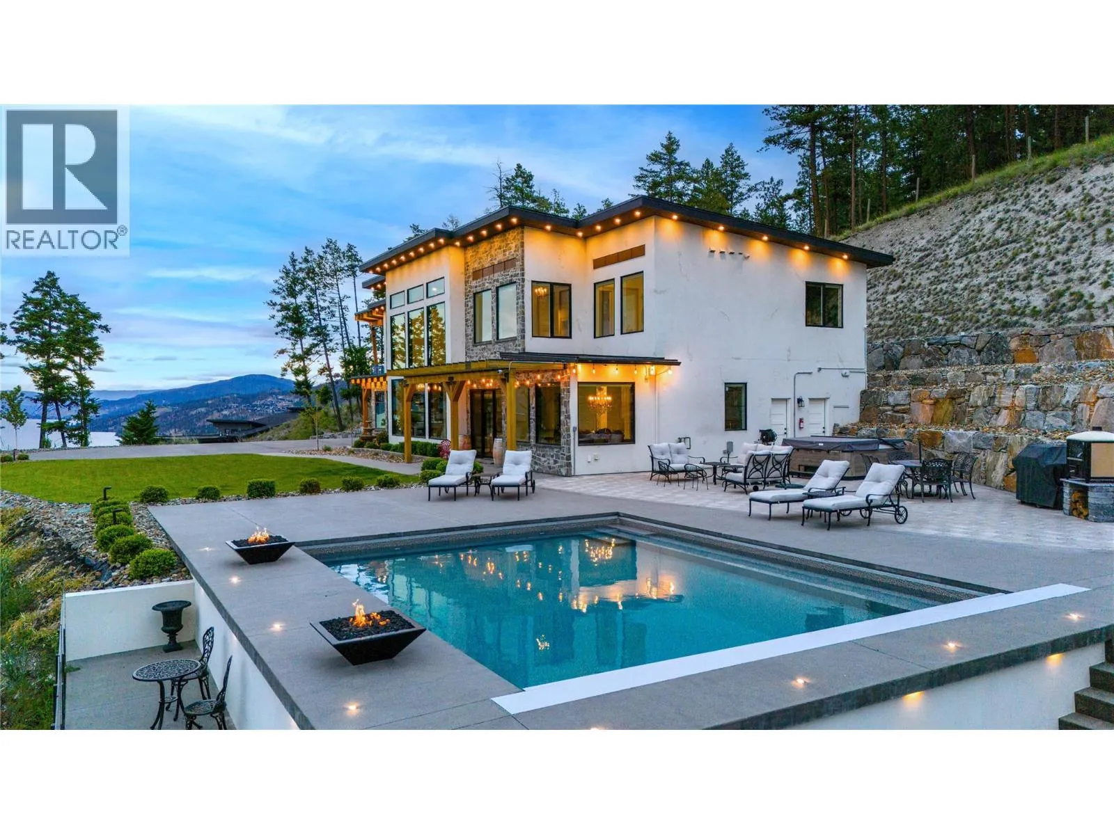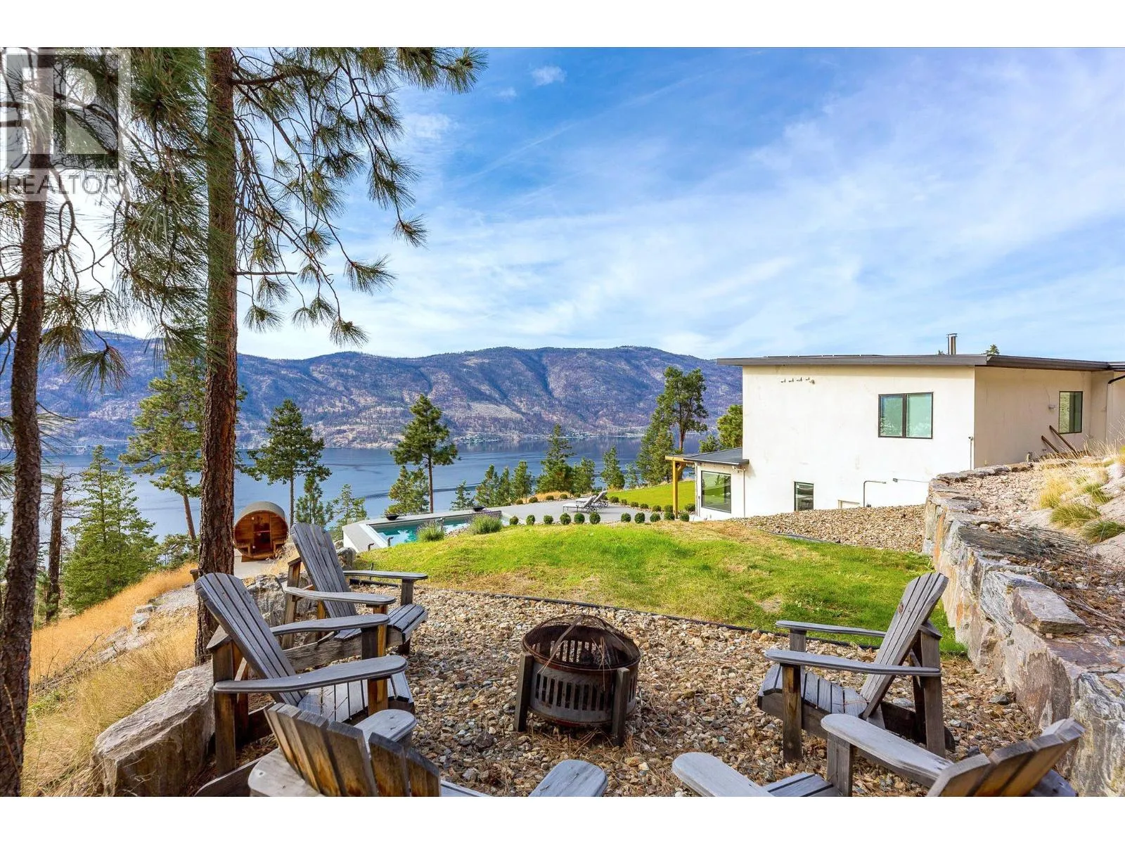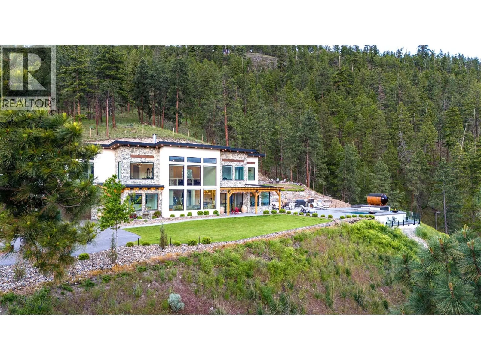 Experience Okanagan living on this remarkable 2.89 acre, gated estate in McKinley Landing. Built in 2018, this custom masterpiece offers breathtaking, unobstructed panoramic views of Okanagan Lake and spans nearly 5,000 square feet with six bedrooms and five bathrooms. At the heart of the home, a dramatic double height great room showcases floor to ceiling windows and a grand stone fireplace. The elevated kitchen boasts sleek custom cabinetry, premium integrated appliances, two islands and separate prep kitchen and is open to the dining room. An office, powder room, and theatre room finish off this level creating thoughtful spaces for relaxing and entertaining. The upper level features a sprawling primary suite complete with a private patio, a coffee bar, a spa like ensuite where a copper clawfoot tub overlooks the lake. The luxurious walk in closet and dressing room Is a dream, with custom cabinetry and centre island. The upper levels features three additional bedrooms and a sitting room. Step outside to enjoy sun soaked days by the pool and hot tub, or unwind in the sauna while taking in the sweeping lake views. The meticulously landscaped grounds feature a timber framed pergola and several lounging areas, offering exceptional privacy and tranquility. Additional highlights include high end finishes throughout, an oversized garage, and close proximity to Kelownaâs renowned wineries and beaches. This is a unique opportunity to own a gated estate in one of Kelownaâs most sought after settings. (id:27476)