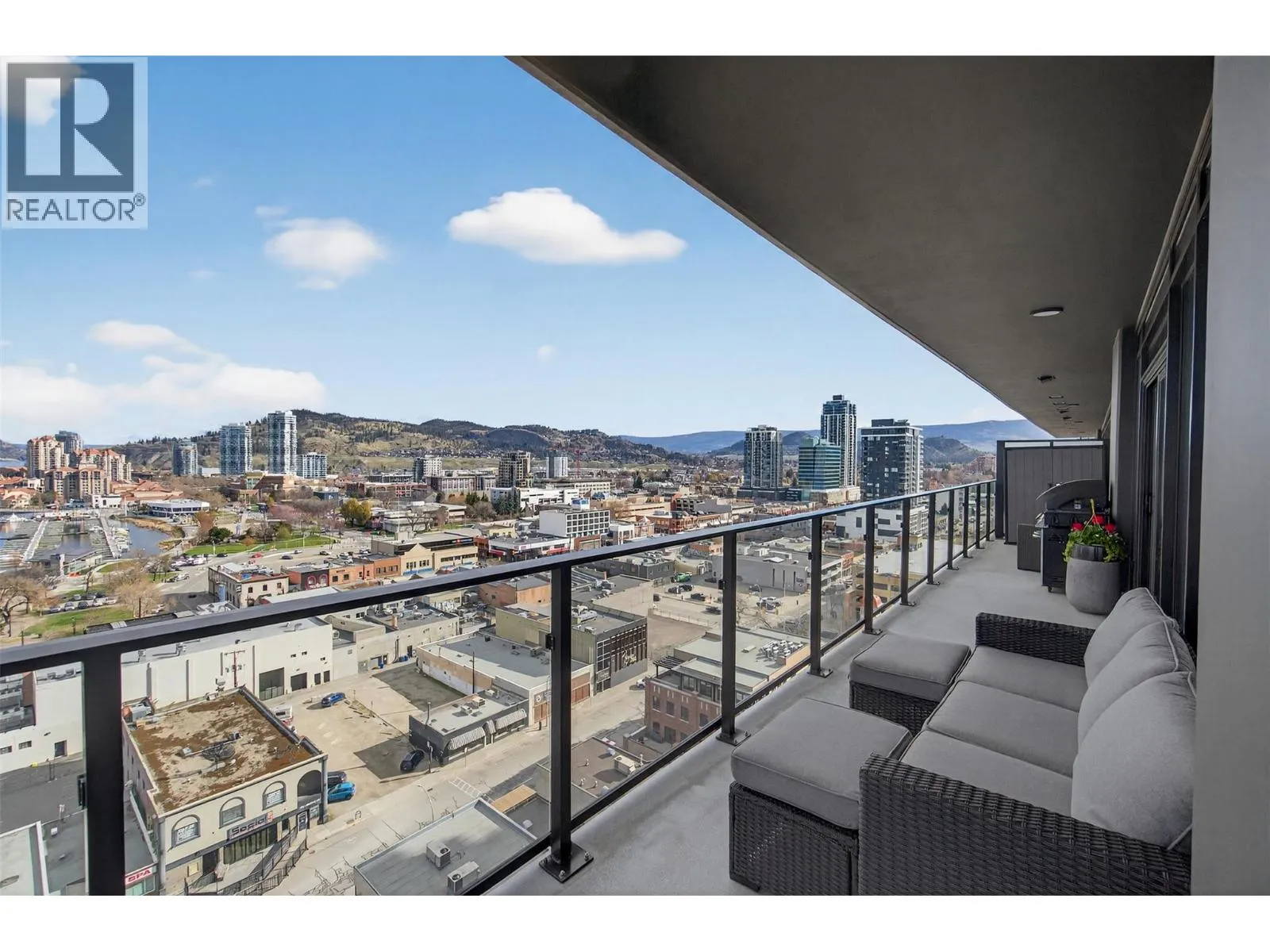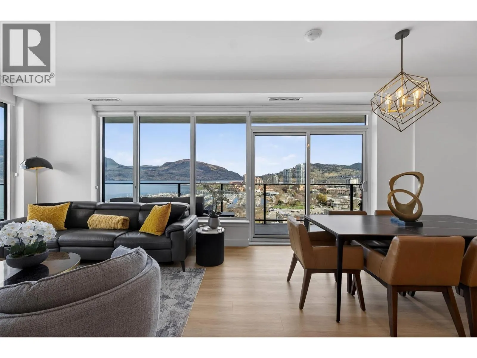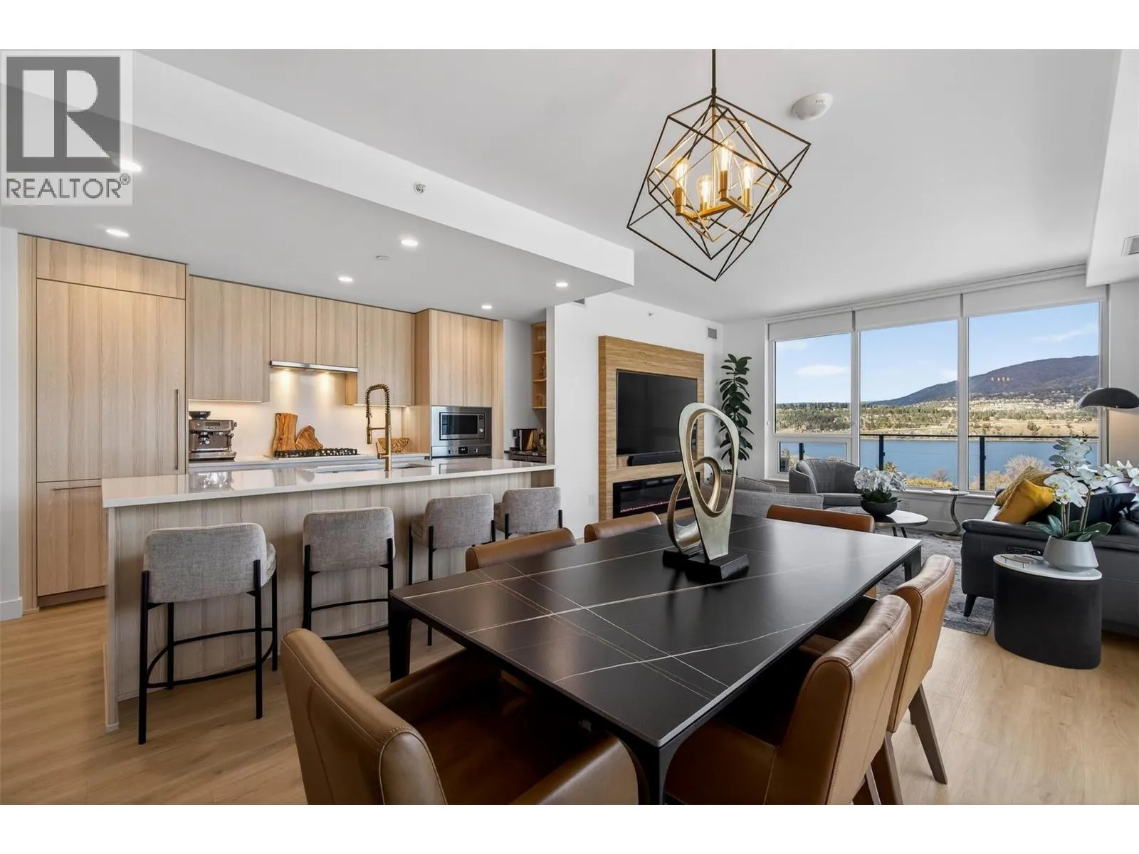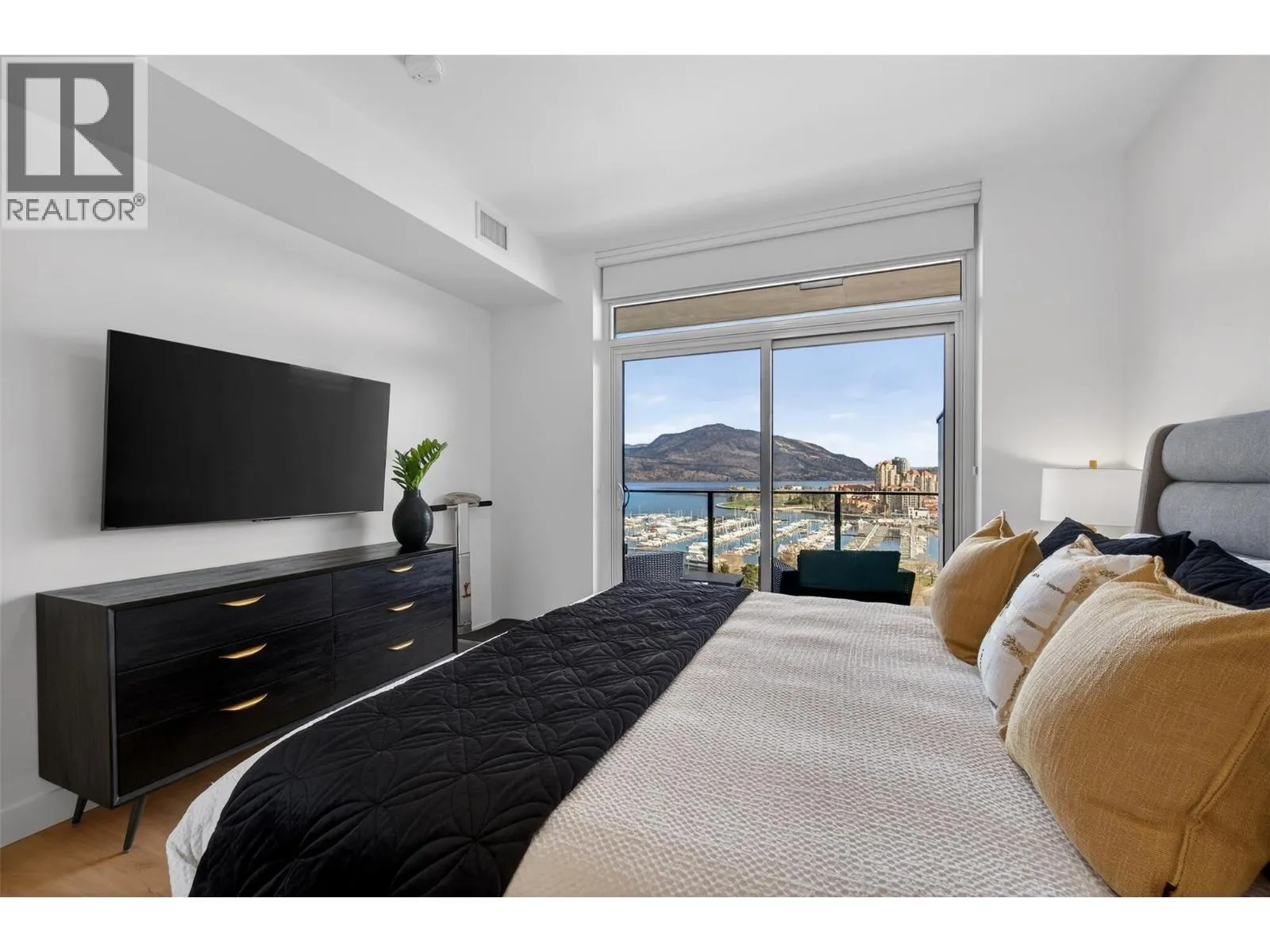 Stunning 2025, 3 bedroom + den condo in the heart of downtown Kelowna. This is a large corner unit with breathtaking views of Okanagan Lake, City Park, Kelowna Yacht Club, Bennett Bridge, as well as sparkling city lights on both sides of the lake. This unit is located on the quiet side of the building (NW corner) and has an excellent split-plan layout & offers lots of upgrades which include beverage center, entertainment center, closet & storage improvements, etc.. It also has a panoramic wraparound balcony, c/w natural gas BBQ hookup. All rooms have spectacular views; currently, the 2nd bedroom is set up as a guest bedroom, the 3rd bedroom is set up as an office & the den is set up as an additional bedroom - lots of flexibility with basically 4 bedrooms. The living room features a built-in 75"" TV & 72"" electric fireplace. Resort-like amenities include large outdoor pool, hot-tubs, games room, golf simulator, putting green, sauna, steam, party rms & more. This is an exceptional condo and the location is 2nd to none - short walk to shops, restaurants, Safeway, coffee shops, lakefront boardwalk, water sports rental facilities, the community theater, Prospera Place & City Park which gives immediate access to tennis courts, beautiful beach, walking & bike trails, dog park & more. Included in price are 2 side-by-side, heated, indoor parking stalls in a premium location & a storage locker. Additional storage capacity is provided with 2 large deck boxes. Turnkey option available! (id:27476)