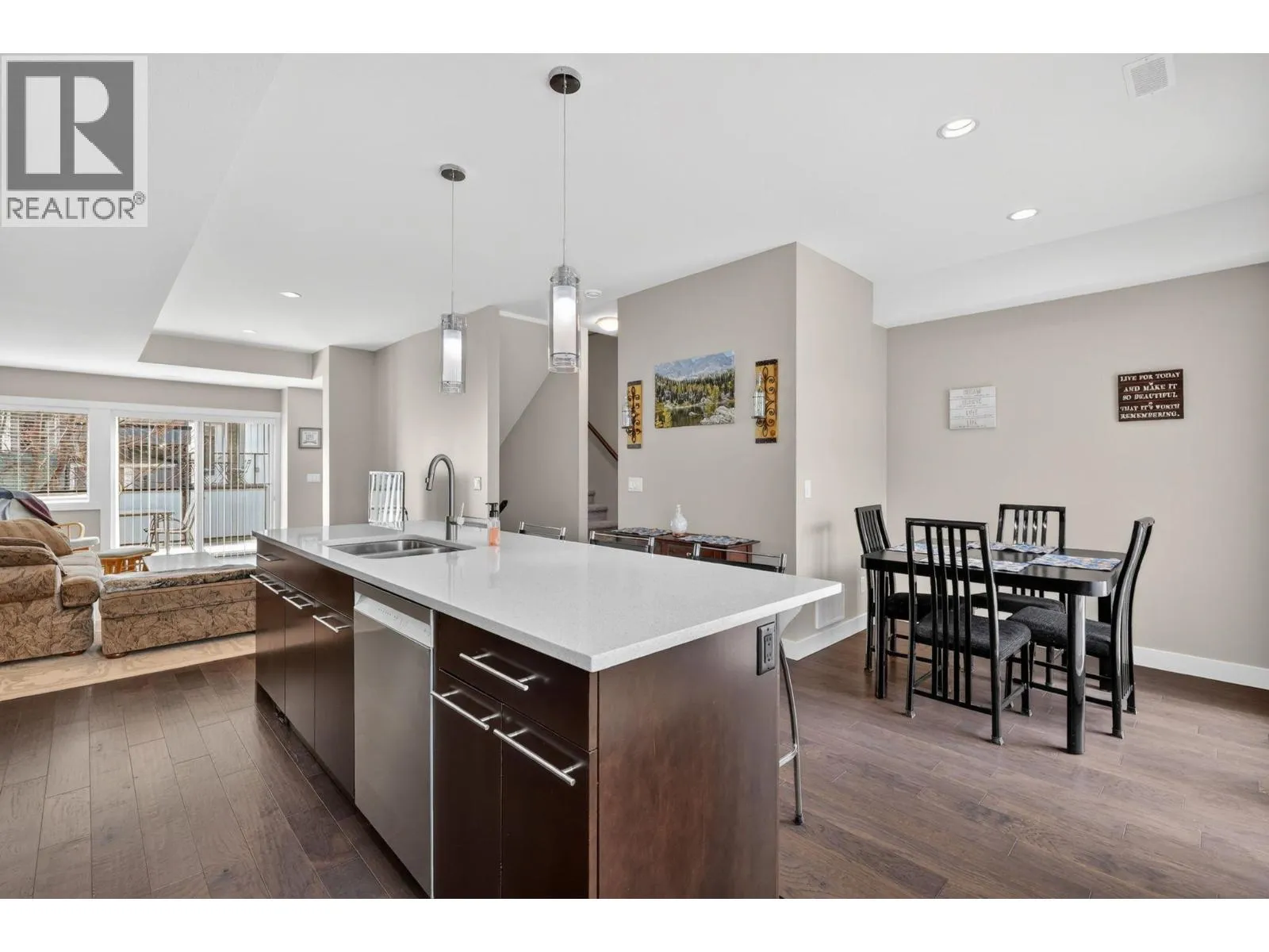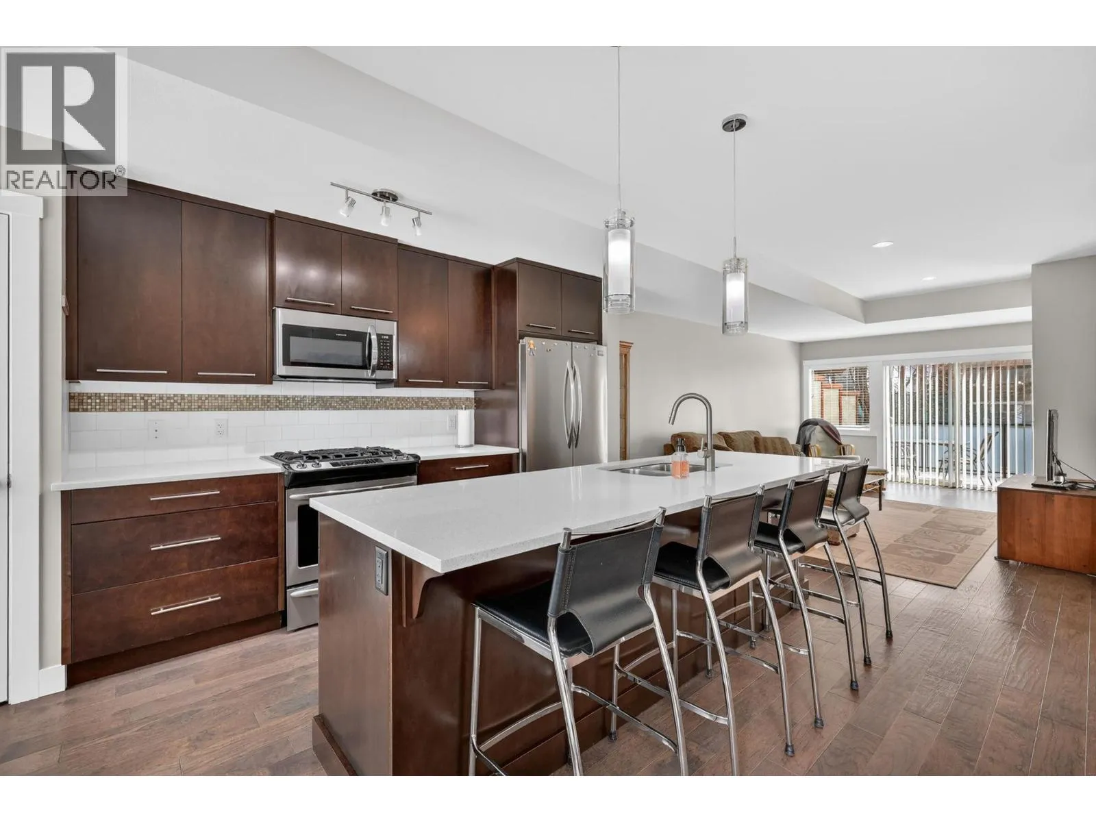 LOCATION PLUS! Welcome to Green Square in the heart of the Lower Mission, one of Kelownaâs most sought-after neighbourhoods. This centrally located 3-bedroom + den, 2.5-bath townhome offers a bright, open-concept layout and unbeatable proximity to schools, shopping, parks, beaches, Casorso Road Recreation Corridor and all amenities. The main level features engineered hardwood floors, a stylish island kitchen with quartz countertops, stainless steel appliances including a gas range, and a spacious pantry. Large windows flood the space with natural light, while the large patio (with privacy film) provides the perfect setting for outdoor entertaining. Upstairs offers three bedrooms, convenient laundry, and a primary suite complete with a walk-in closet and ensuite. Thoughtfully maintained, this home also includes a brand new hot water tank and dishwasher for added peace of mind. Enjoy the practicality of a double side-by-side garage and a functional layout ideal for families, first-time buyers, or investors. Pets welcome (1 dog or 1 cat or 2 of each - no size restrictions). Complex has a gym and communal roof-top deck! A fantastic opportunity in an exceptional location, book your showing today! (id:27476)