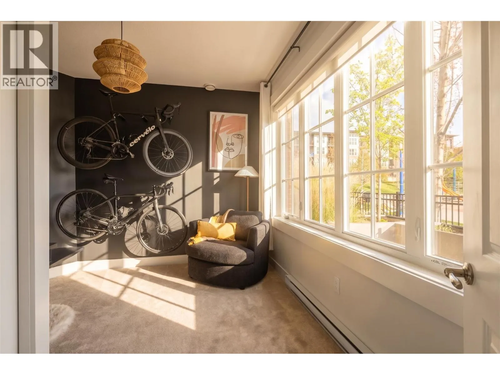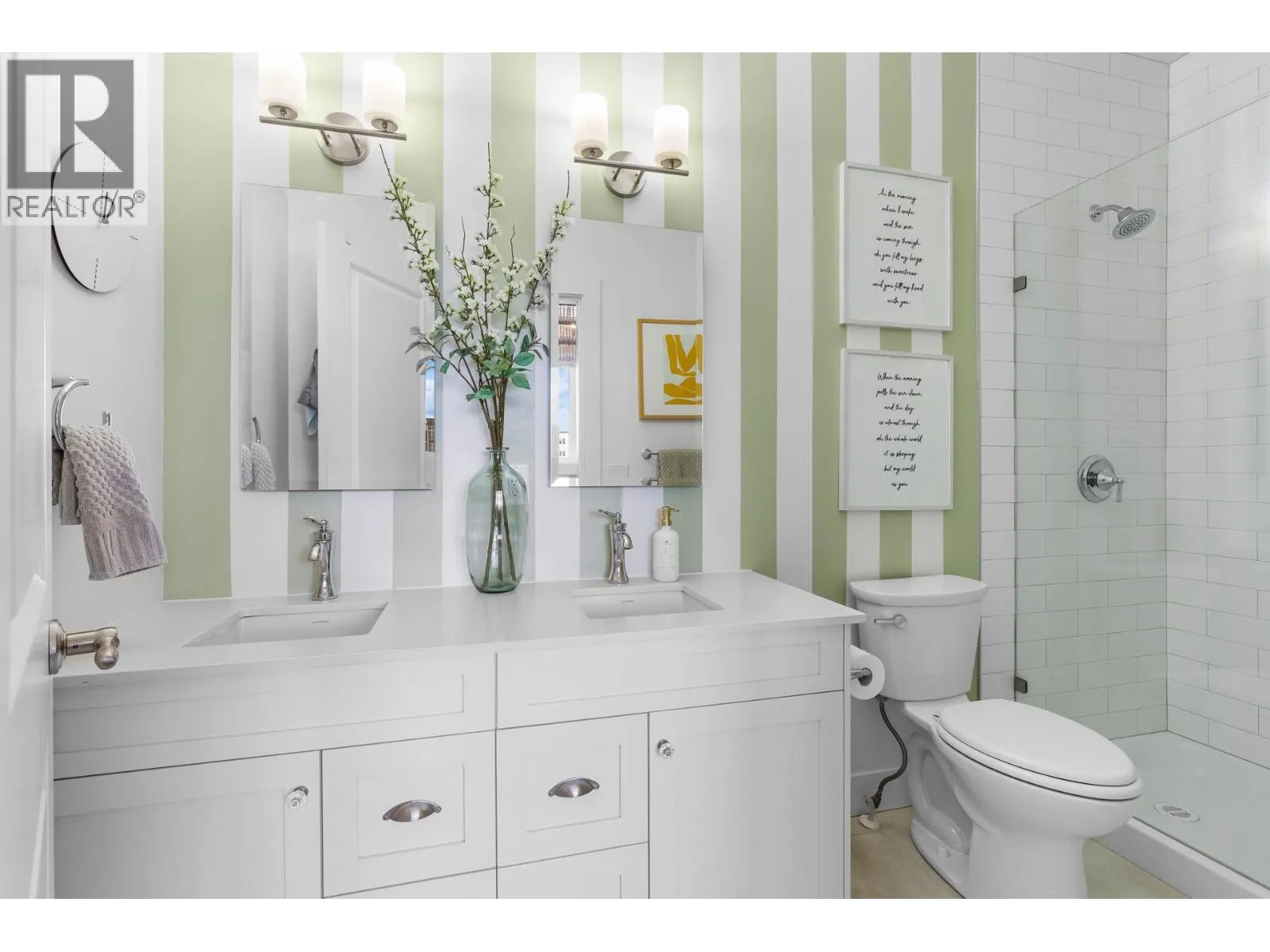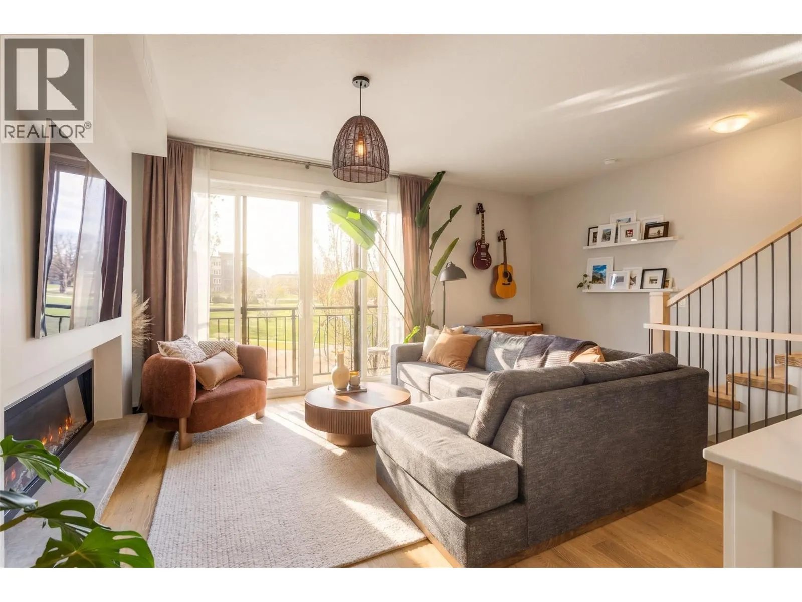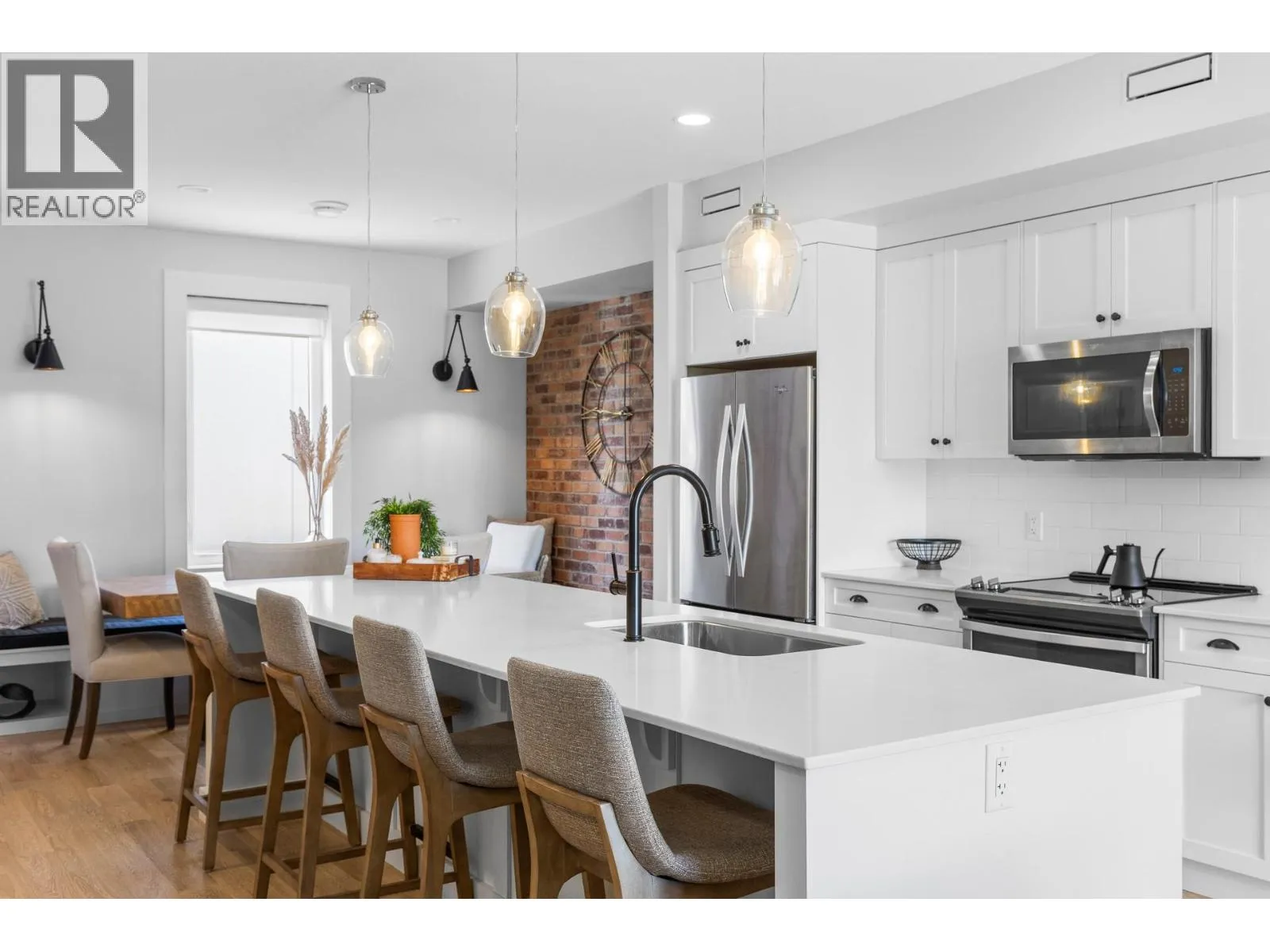 Welcome to Parkview at Central Green, where urban design meets modern comfort in this beautifully appointed townhome. Offering 3 bedrooms and 2.5 bathrooms, this home delivers both space and versatility for everyday living. Thoughtfully customized throughout, each room enhances the homeâs chic aesthetic. The bright kitchen features a spacious quartz island with seating for fourâperfect for casual dining or entertaining. The adjoining dining area is highlighted by a striking brick feature wall and a custom banquet bench, creating a warm and inviting gathering space. The living room is both bright and spacious, anchored by a decorative fireplace with a concrete hearth, adding a touch of contemporary character. Upstairs, the primary bedroom offers large picture windows, a walk-in closet, and a well refined ensuite with double vanity and a generous shower. A double-car garage provides added convenience and ample storage. Ideally located between Downtown Kelowna and the hospital, this home offers easy access to all amenities. Enjoy nearby transit, parks, and beaches while embracing a truly walkable lifestyle. Donât miss this opportunity to own a centrally located urban gem. Pet-friendlyâallowing up to 2 cats or 2 dogs. Explore the virtual tour link for a 3D walkthrough, full photo gallery, and floor plans. https://unbranded.youriguide.com/106_555_buckland_ave_kelowna_bc/ (id:27476)