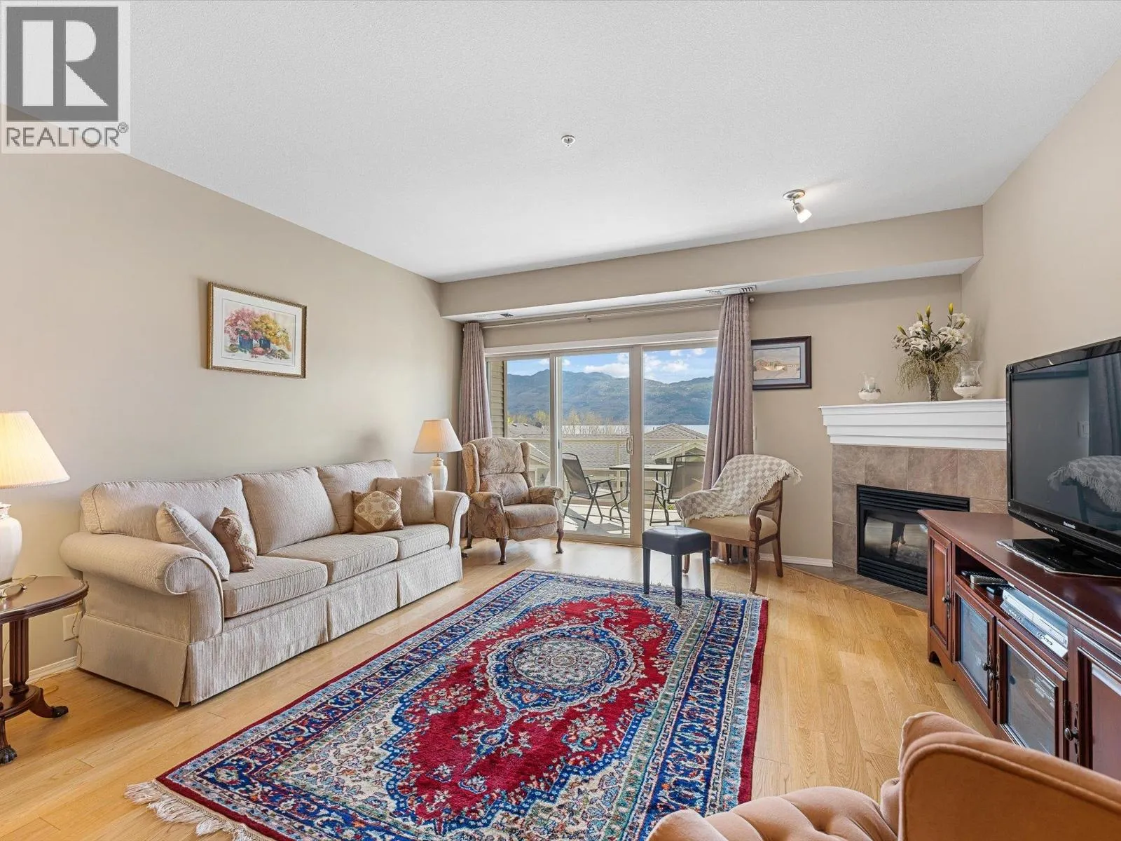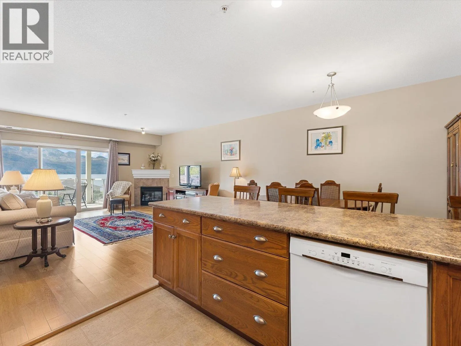 Well cared for and in great shape, this spacious condo at Bay Vista offers comfortable living with beautiful lake and mountain views. The open layout features generous square footage, a large kitchen with abundant cabinetry and island seating, and seamless flow into the dining and living areas. Hardwood flooring adds warmth while sliding doors open to a covered deck that takes full advantage of the Okanagan views. Enjoy indoor comfort and outdoor beauty. The large primary bedroom includes additional space for a sitting area or desk, and the in-suite laundry room adds convenience. Bay Vista amenities include a swimming pool, gym, clubhouse, and guest suite. This location offers a lifestyle rarely available at this price point. You are within walking distance to Okanagan Lake, a dog beach and walking trails, plus you are surrounded by award winning wineries. A great opportunity for buyers seeking a low-maintenance home in a beautiful, convenient location. (id:27476)