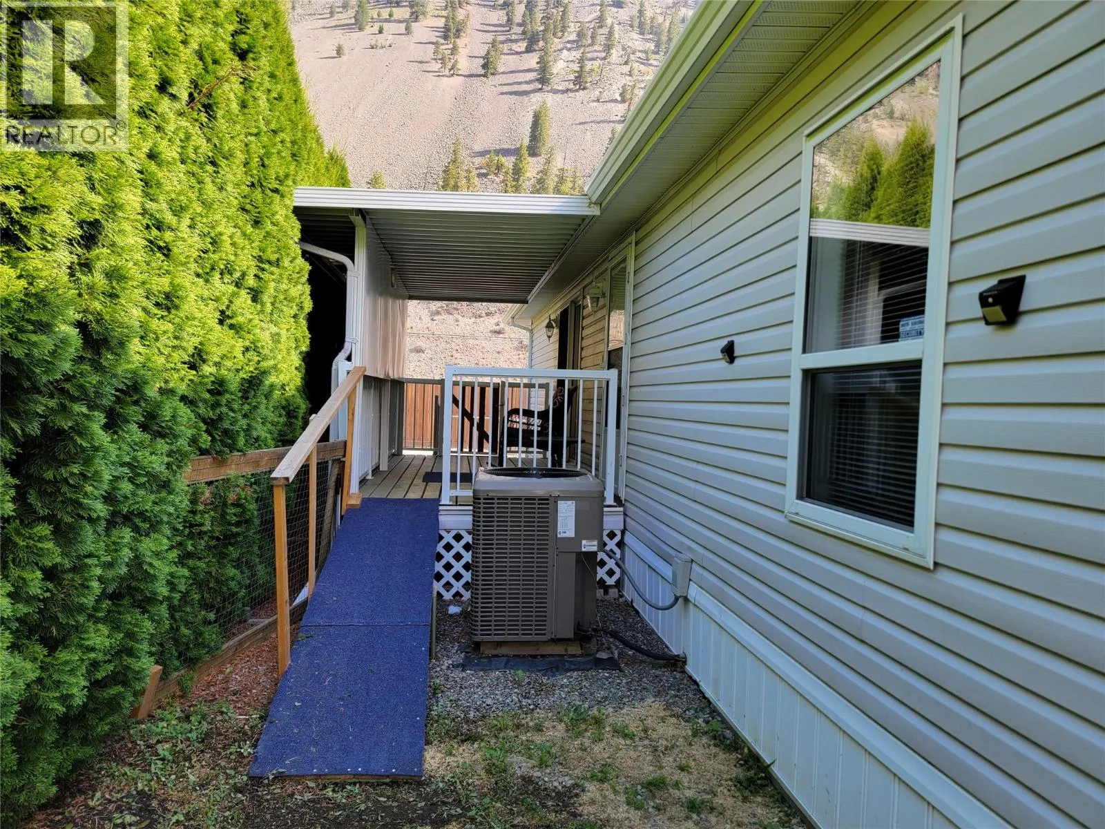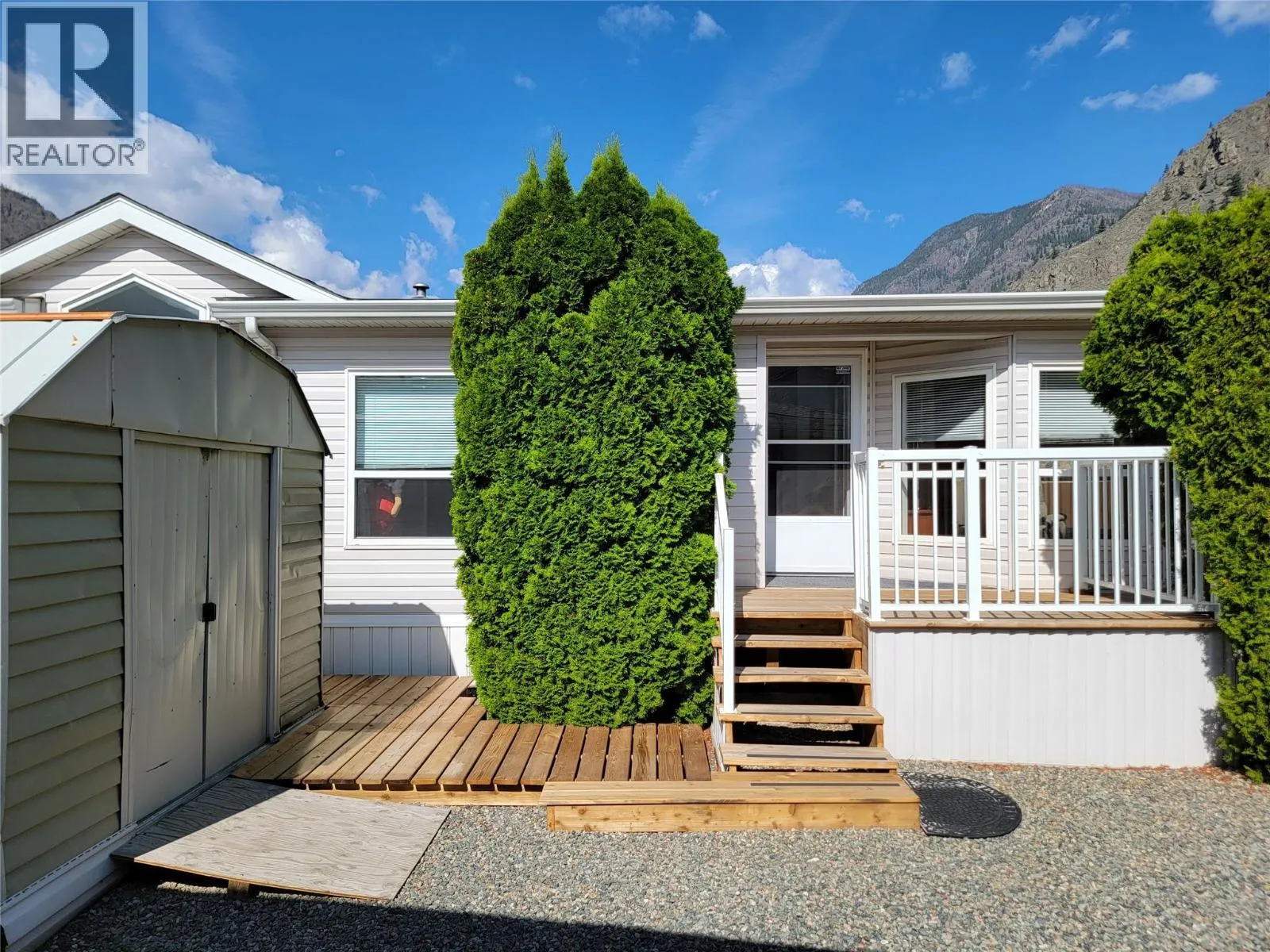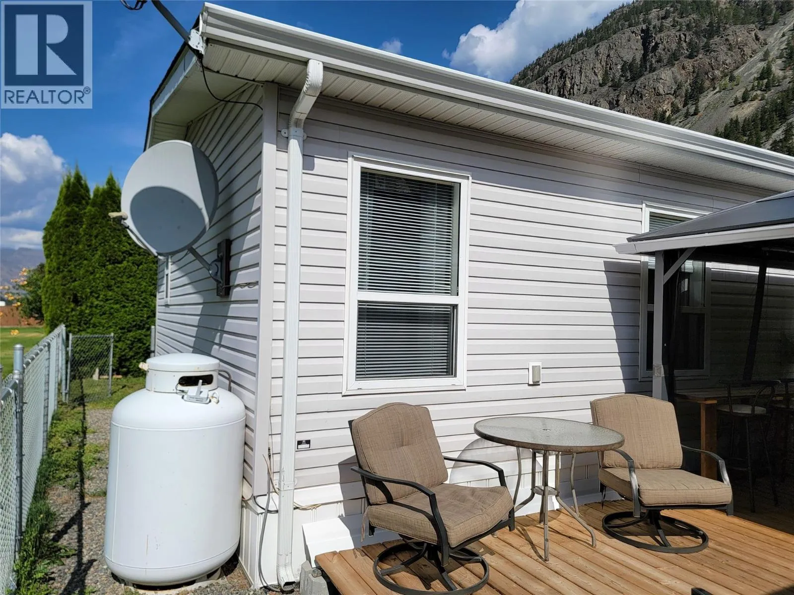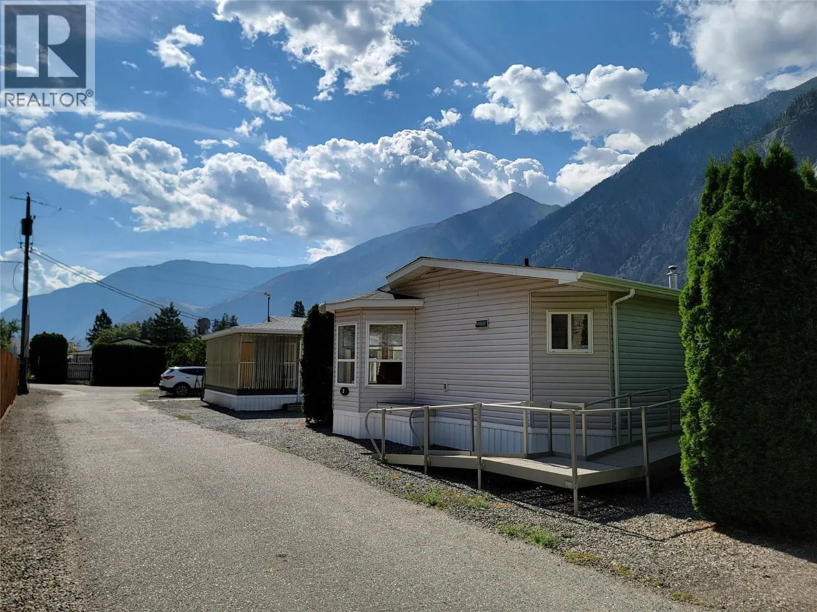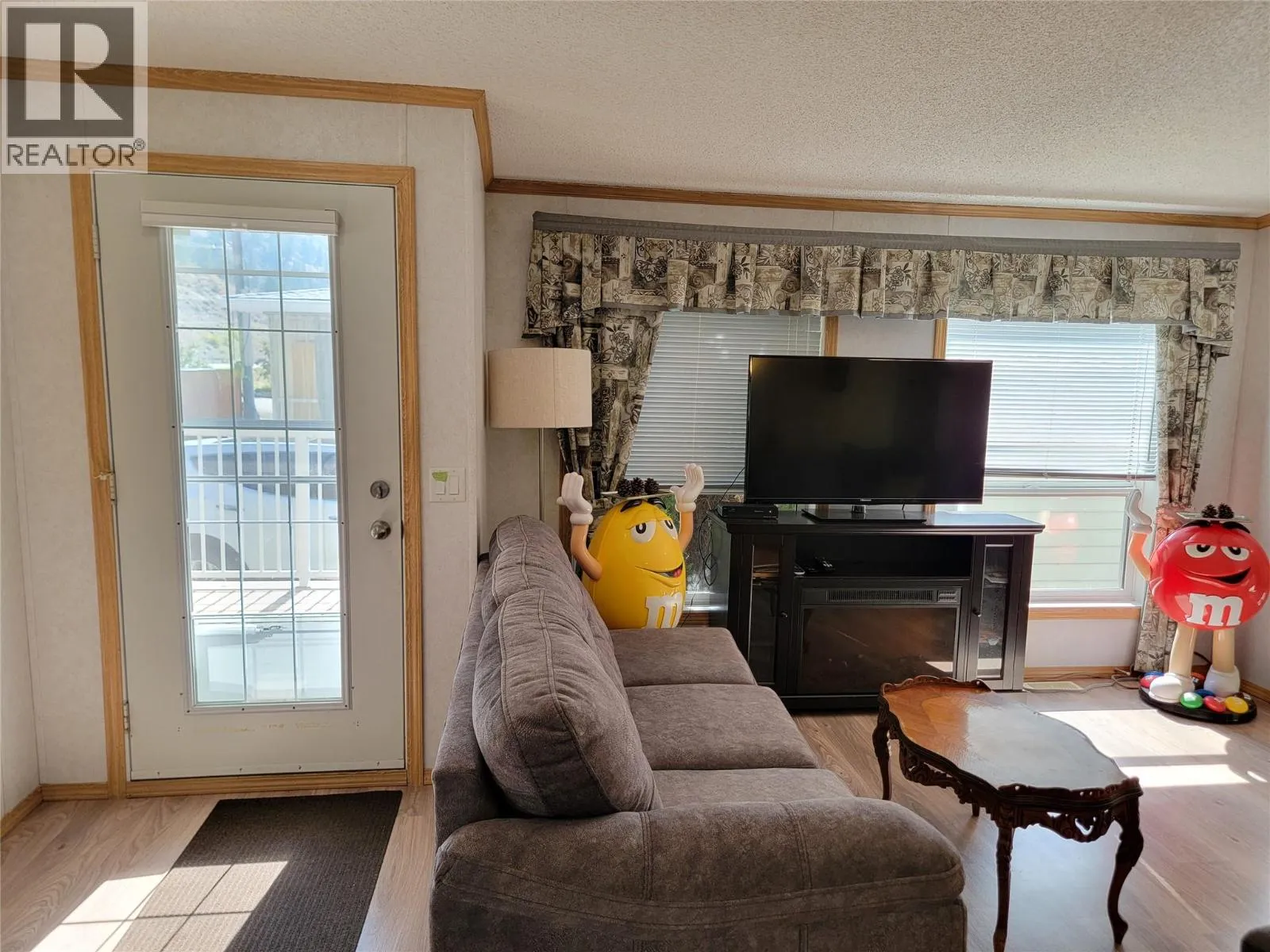 Mountain views surround this bright and clean home at Riverside Estates! 55+, pets on approval, modest monthly pad fee. Great outdoor space under the new gazebo and boardwalk, and fenced for your pets. Easy access to the beautiful Similkameen River and green space along the back of home. Metal wheelchair ramp provides access to the covered back patio through the sliding door - excellent for moving in! 2 bed + den/office, 2 bath home offers an easy to love layout with central air. Open concept living space, functional kitchen design with pantry, and corner breakfast nook features incredible natural light to enjoy your morning coffee. Beautiful large window and cozy gas fireplace in the office. Main bedroom features a large closet and 4 pc ensuite with tub/shower. Skylights in each bathroom helps to fill the home with natural light. Pad fee of $415.10 per month includes water and septic. Each pet requires prior written approval by Park Manager. Call today for more info. Measurements are approximate. (id:27476)