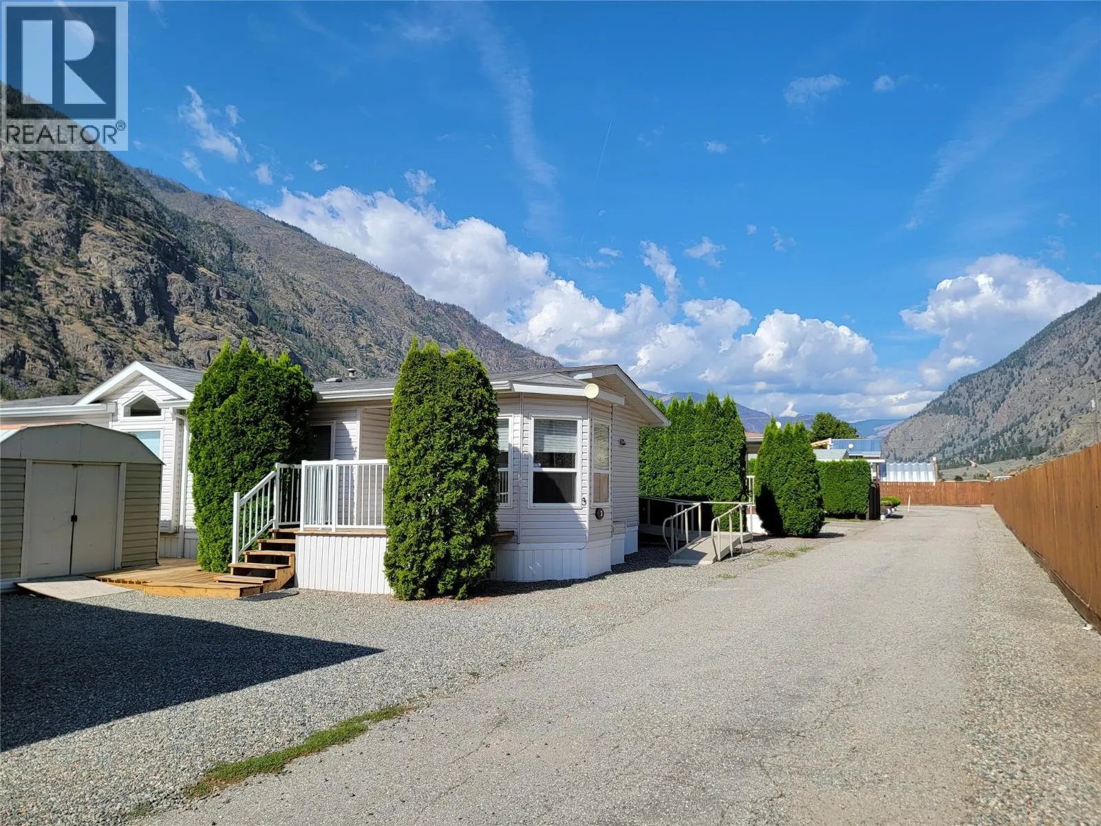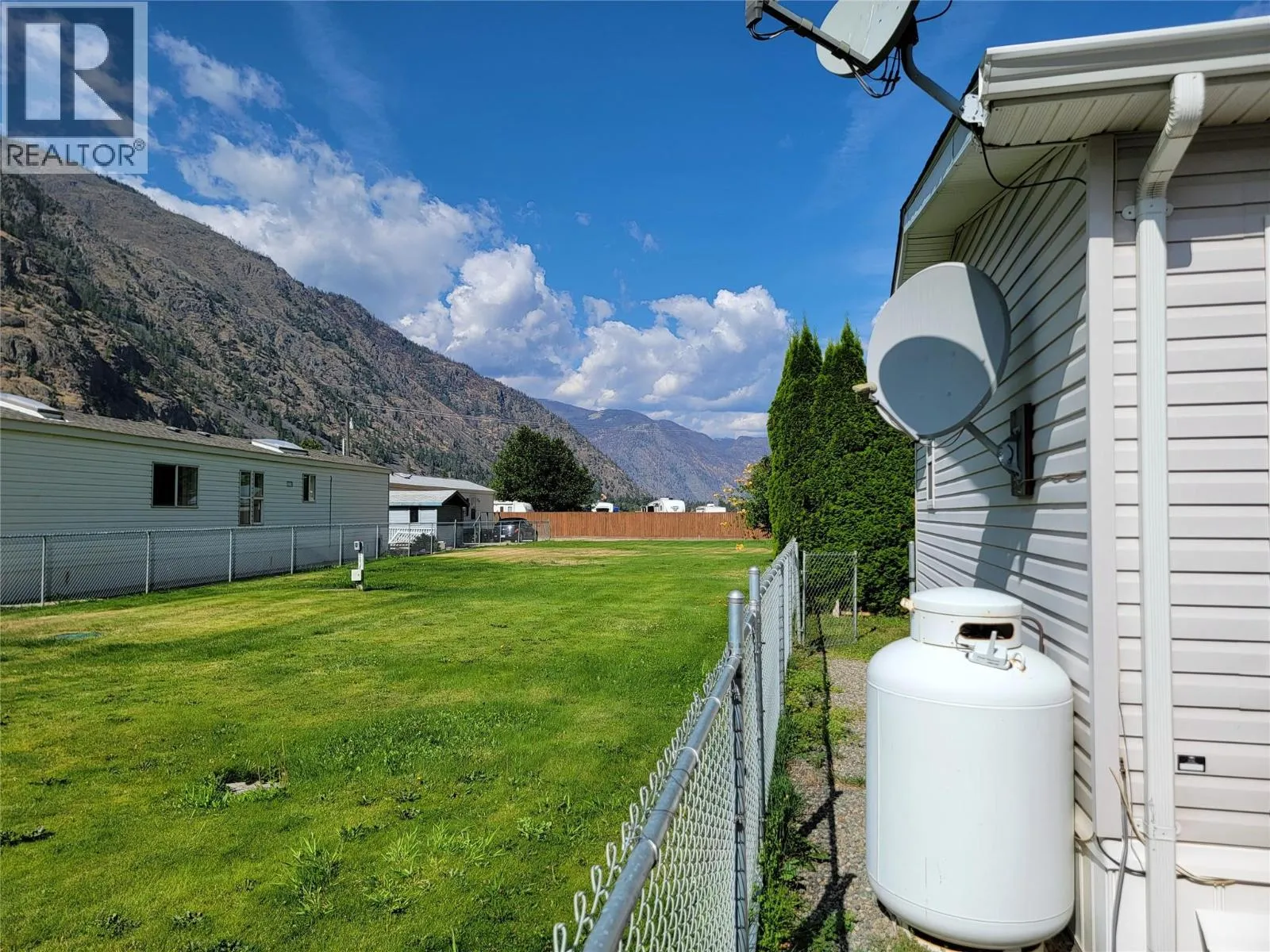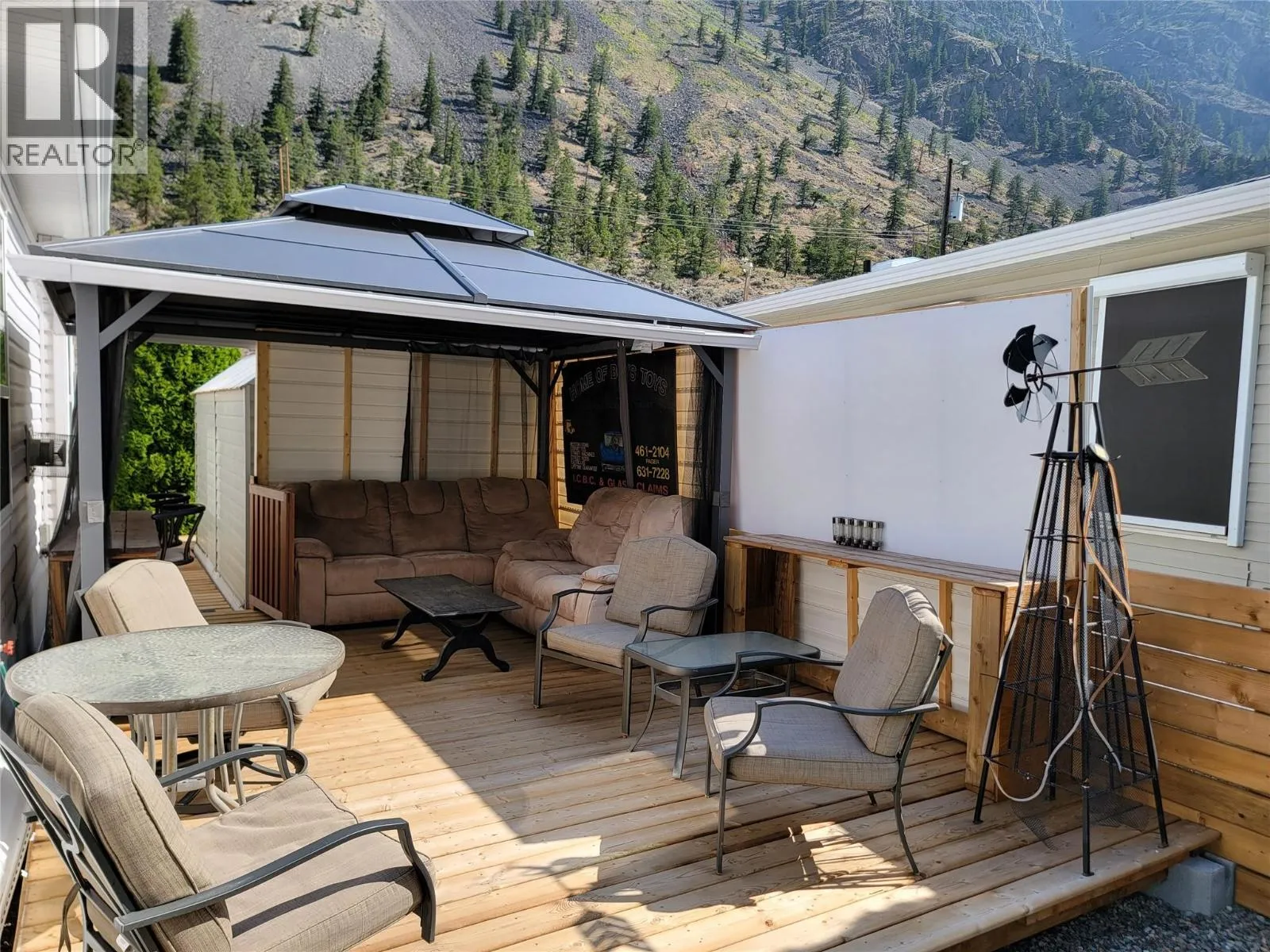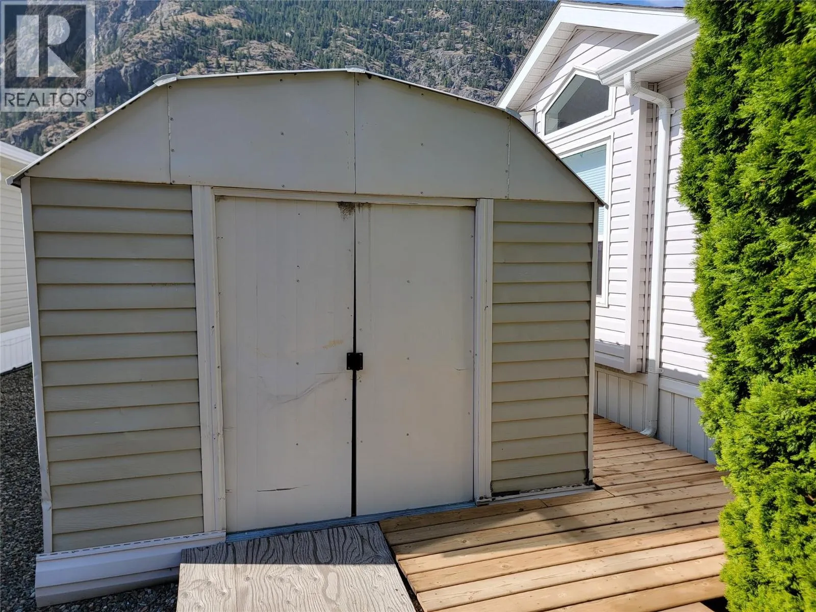 Mountain views surround this bright and clean home at Riverside Estates! 55+, pets on approval, modest monthly pad fee. Great outdoor space under the new gazebo and boardwalk, and fenced for your pets. Easy access to the beautiful Similkameen River and green space along the back of home. Metal wheelchair ramp provides access to the covered back patio through the sliding door - excellent for moving in! 2 bed + den/office, 2 bath home offers an easy to love layout with central air. Open concept living space, functional kitchen design with pantry, and corner breakfast nook features incredible natural light to enjoy your morning coffee. Beautiful large window and cozy gas fireplace in the office. Main bedroom features a large closet and 4 pc ensuite with tub/shower. Skylights in each bathroom helps to fill the home with natural light. Pad fee of $415.10 per month includes water and septic. Each pet requires prior written approval by Park Manager. Call today for more info. Measurements are approximate. (id:27476)