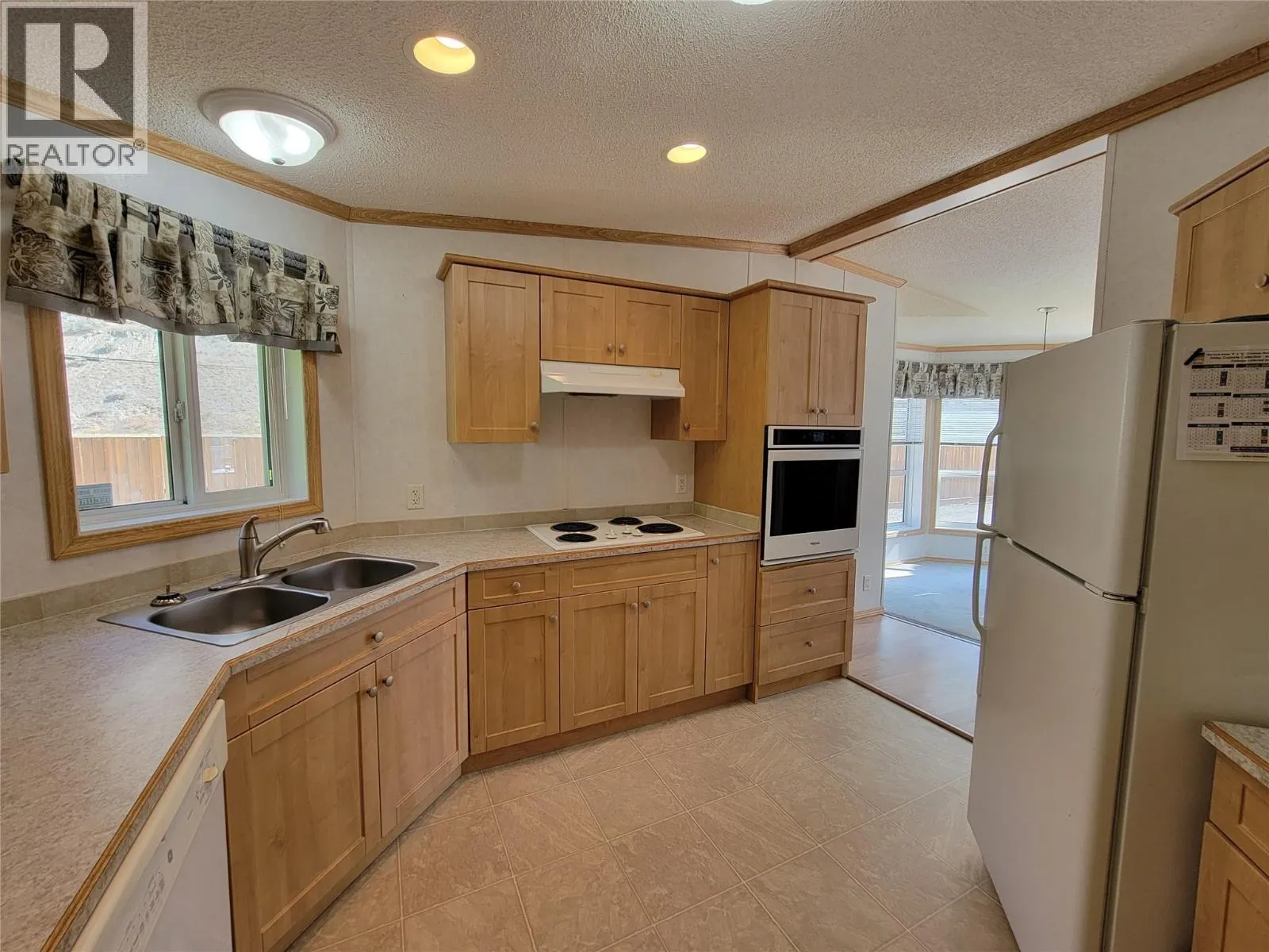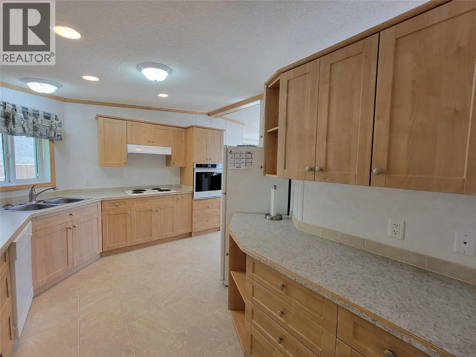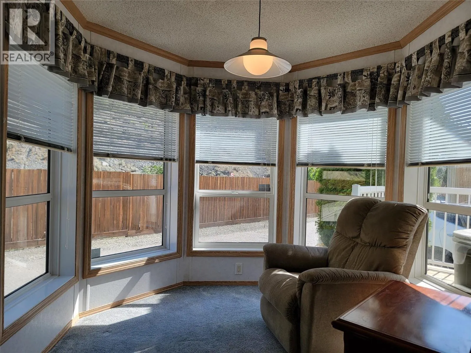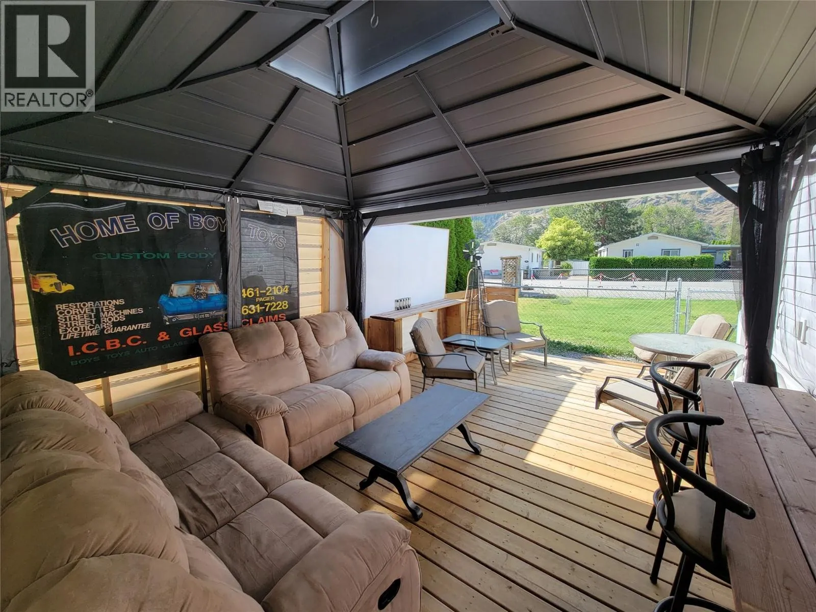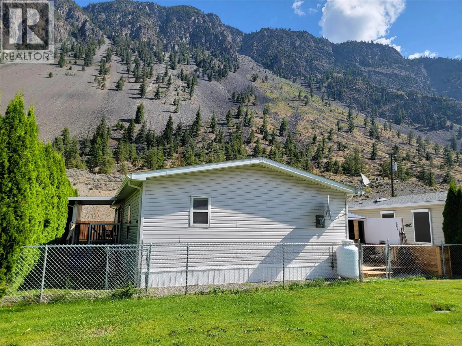 Mountain views surround this bright and clean home at Riverside Estates! 55+, pets on approval, modest monthly pad fee. Great outdoor space under the new gazebo and boardwalk, and fenced for your pets. Easy access to the beautiful Similkameen River and green space along the back of home. Metal wheelchair ramp provides access to the covered back patio through the sliding door - excellent for moving in! 2 bed + den/office, 2 bath home offers an easy to love layout with central air. Open concept living space, functional kitchen design with pantry, and corner breakfast nook features incredible natural light to enjoy your morning coffee. Beautiful large window and cozy gas fireplace in the office. Main bedroom features a large closet and 4 pc ensuite with tub/shower. Skylights in each bathroom helps to fill the home with natural light. Pad fee of $415.10 per month includes water and septic. Each pet requires prior written approval by Park Manager. Call today for more info. Measurements are approximate. (id:27476)