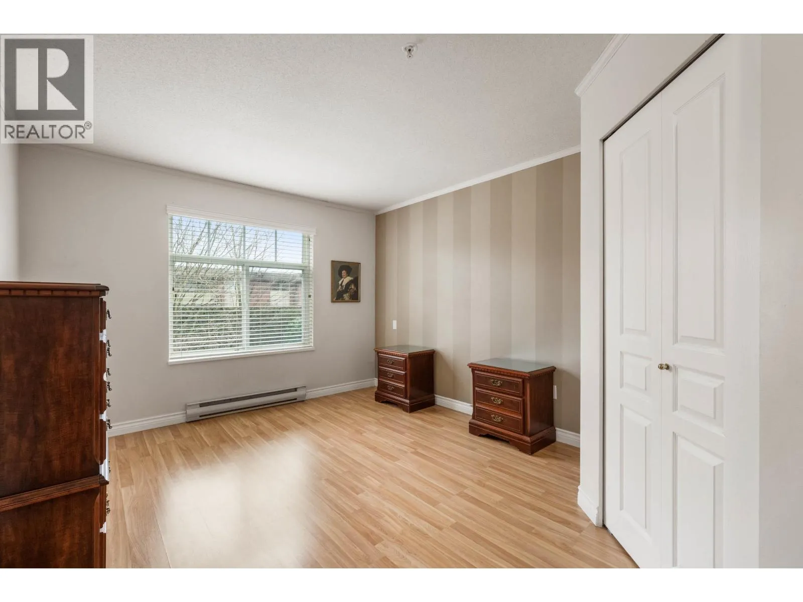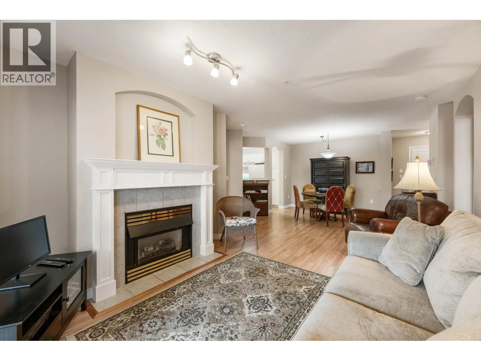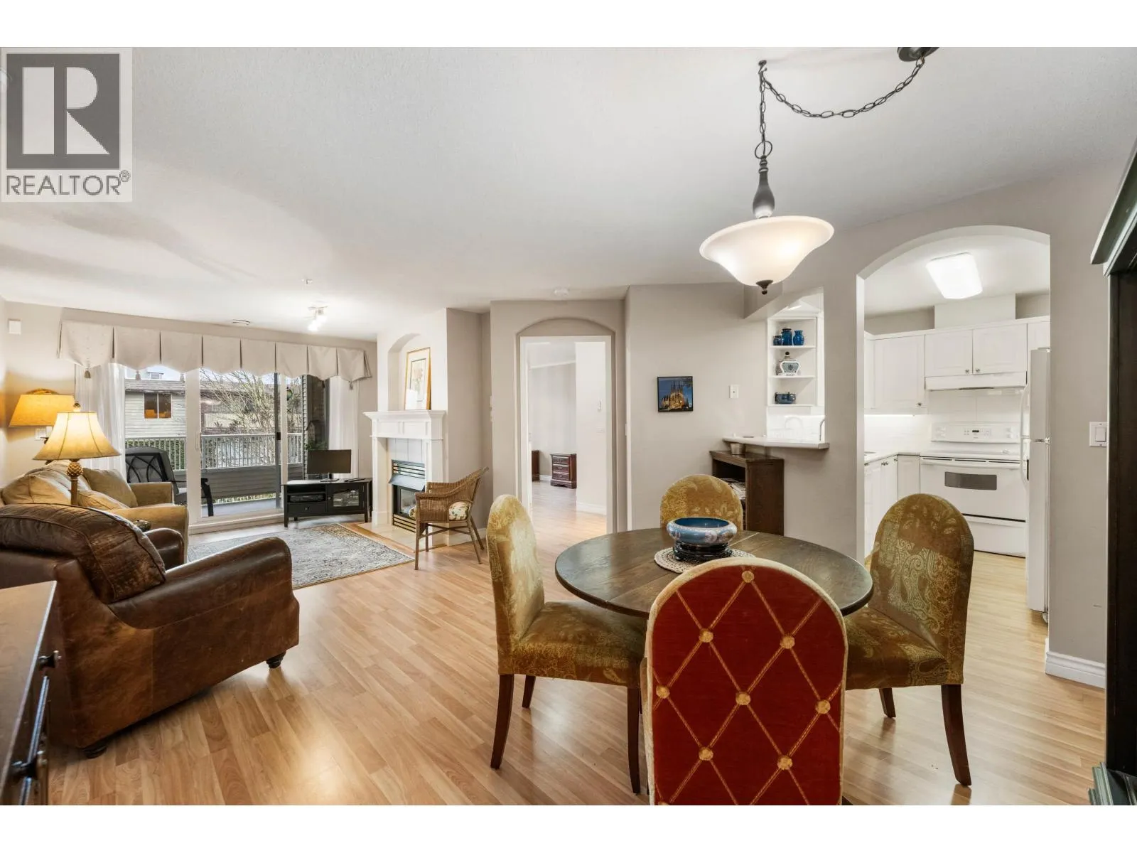 Beautiful 2 bedroom, 2 bathroom condo in the heart of Ladner. This bright, open-plan home features laminate flooring throughout and a well-designed kitchen with plenty of natural light. Spacious primary bedroom includes a walk-in closet and a full ensuite. Cozy living room is highlighted by a gas fireplace and large patio doors that open to a covered balcony overlooking the peaceful gardens on the quiet side of the building. Large windows throughout the home provide abundant natural light. In-suite laundry with additional storage The unit includes two parking stalls and a storage locker. Residents enjoy excellent amenities including a large amenity room ideal for gatherings, a gym, and a beautifully landscaped patio area. Walk to shopping and services. 2 pets (dogs 16" to shoulder) (id:27476)