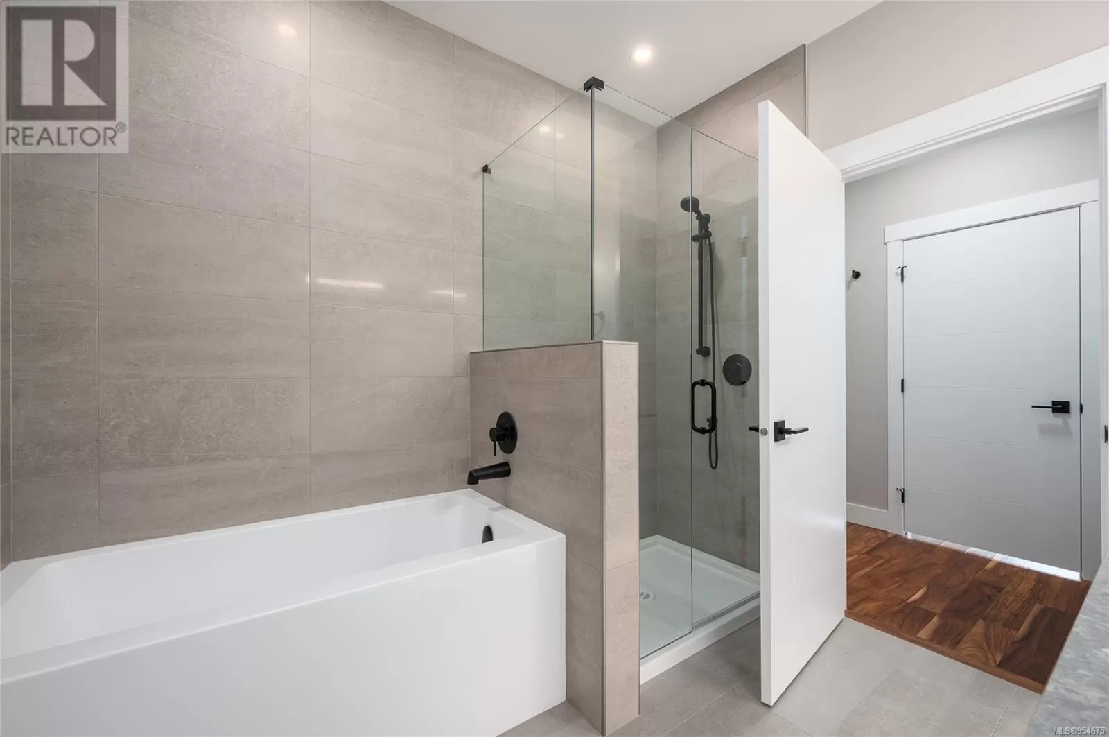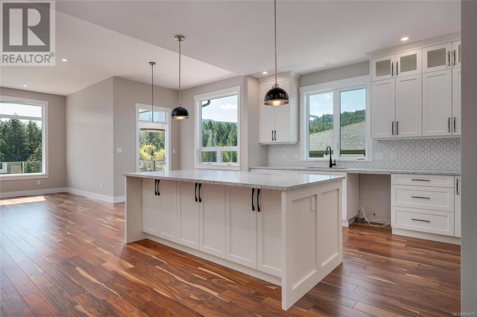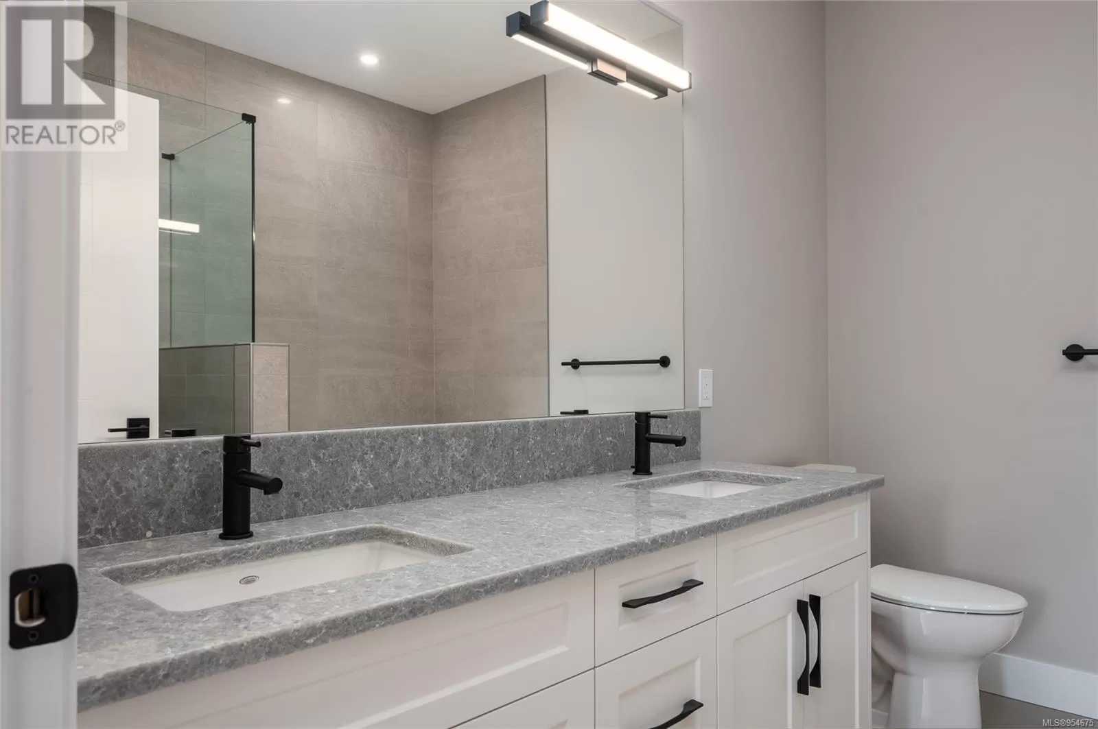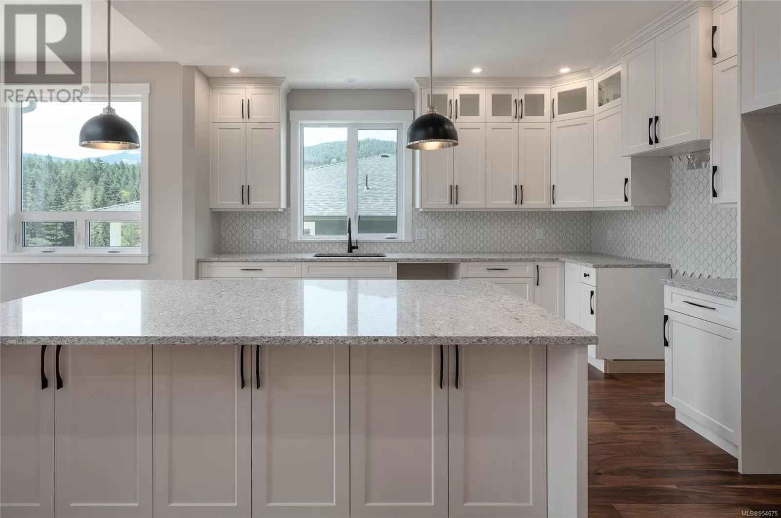 Dare to compare! Look at what this beautifully finished brand new home offers. Level entry with walk out lower level and over 2200 sq ft. High end finishing like extensive hardwood and heated tile floors. Heat pump, hot water on demand, quartz counters, gorgeous kitchen cabinetry, high ceilings , 5 piece ensuite and impressive feature wall fireplace. Big deck (plus patio space), lovely mountain views and lots of morning and evening sun. You'll love the landscaping in the quiet upscale development close to ferries, airport, golf, all marine activities etc. This home has it all!! (id:27476)