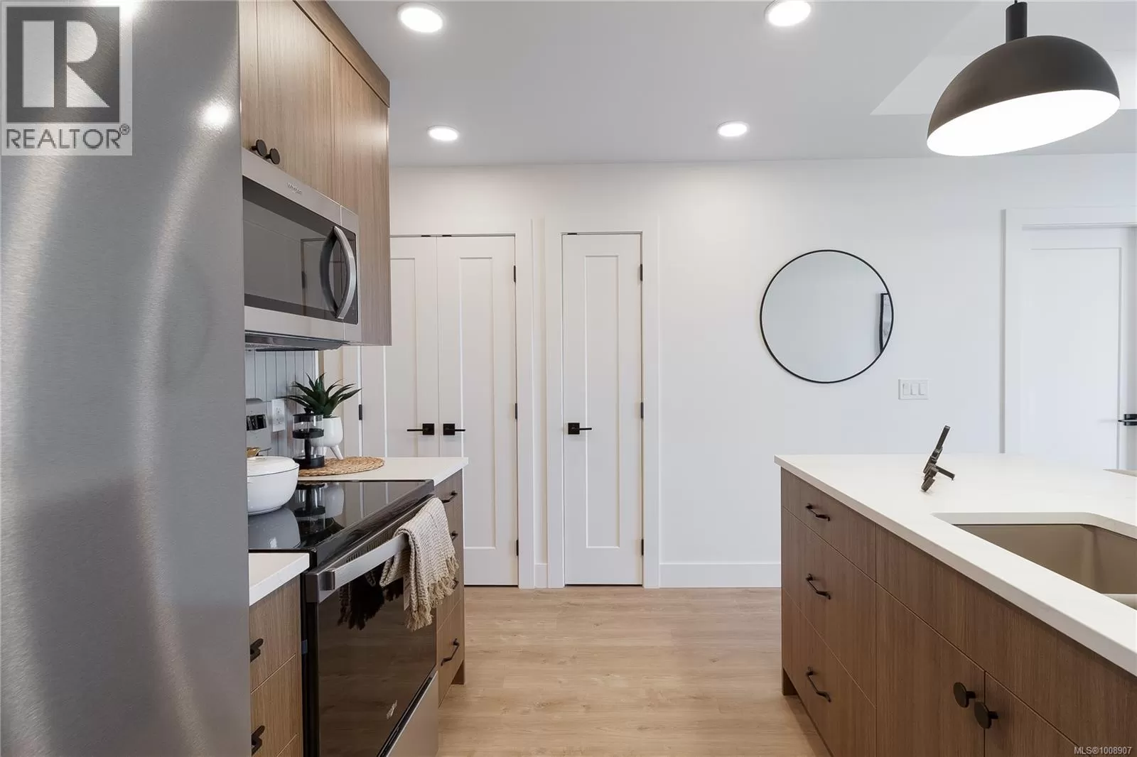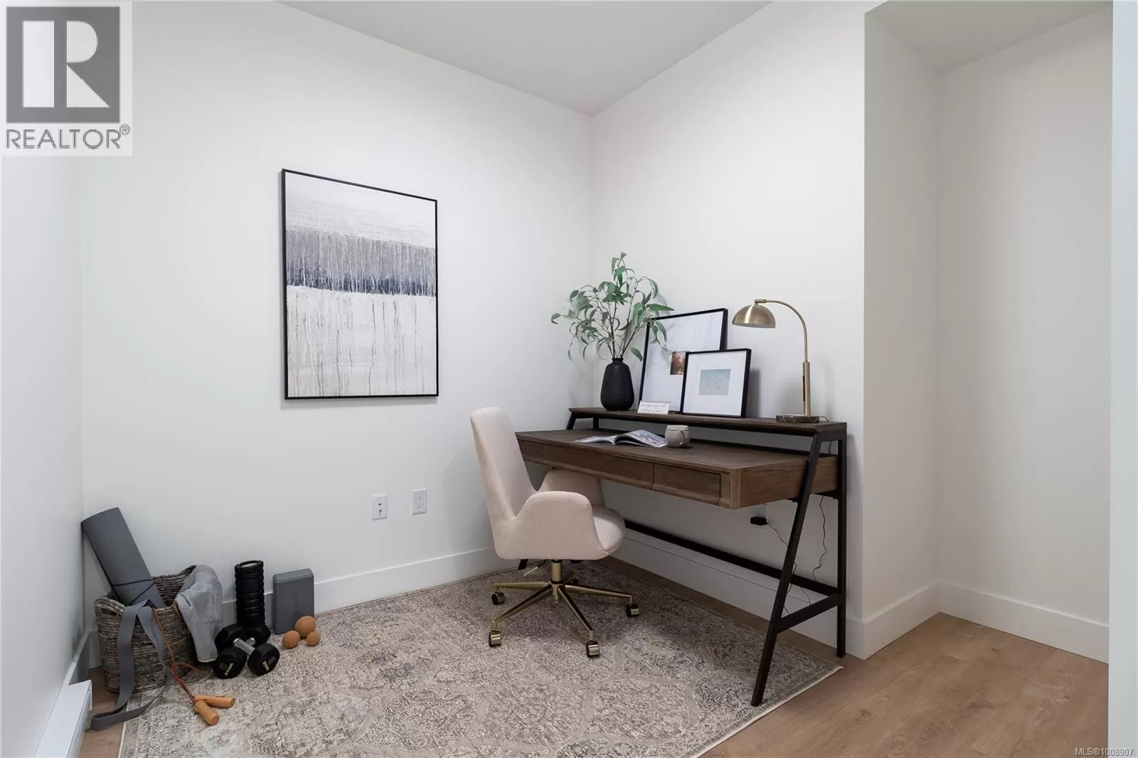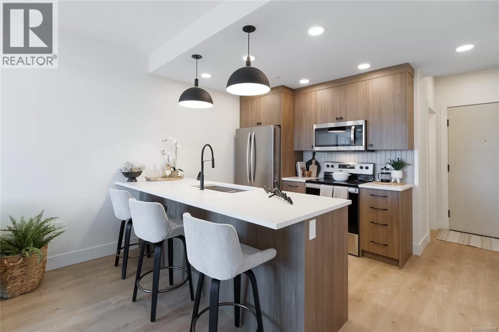 Welcome to Dalby's on Dogwood, where luxury meets convenience in the heart of Ladysmith, BC. This exclusive residence offers a blend of sophisticated design, modern amenities, and a prime location, ensuring an exceptional living experience for residents of all ages. The architectural beauty is complemented by breathtaking panoramic views of the harbour, providing a picturesque backdrop to daily life. This boutique 5-storey building offers 25 residences, each meticulously designed for comfort and functionality. Beyond the impeccable interiors, Dalby's boasts an array of building amenities designed to enhance your lifestyle. Secure parking and bike storage ensure peace of mind, while a sleek lobby welcomes you home each day. Residents can also take advantage of a common roof deck patio, perfect for gatherings and soaking in the coastal scenery. For pet owners, a dedicated dog washing station adds convenience to everyday life, while beautifully landscaped grounds provide a serene escape. Our prime location in Ladysmith offers the best of both worlds: a tranquil coastal lifestyle with easy access to urban conveniences. Explore pristine beaches, wander through breathtaking parks, or stroll through charming shops—all just minutes from your doorstep. Whether you're a young professional seeking a vibrant community or a retiree longing for a peaceful retreat, Dalby's on Dogwood offers the perfect place to call home. Experience the essence of coastal living at its finest. This 1 bed + den, 2 bath home offers high-end finishes, in suite laundry, included appliances, window coverings and ocean views from your own patio. Book your private showing today! (id:27476)