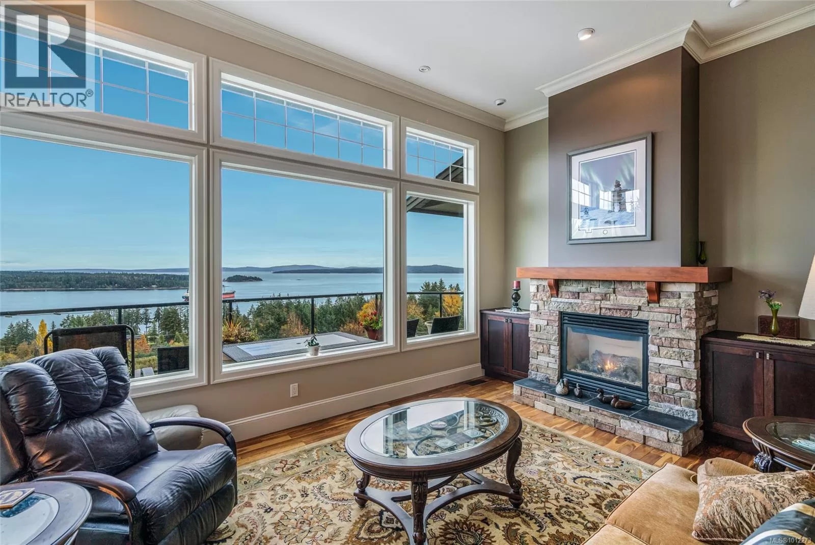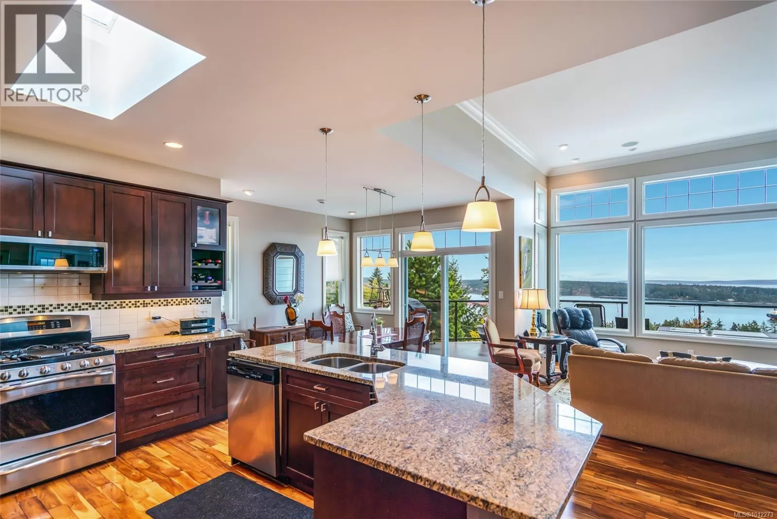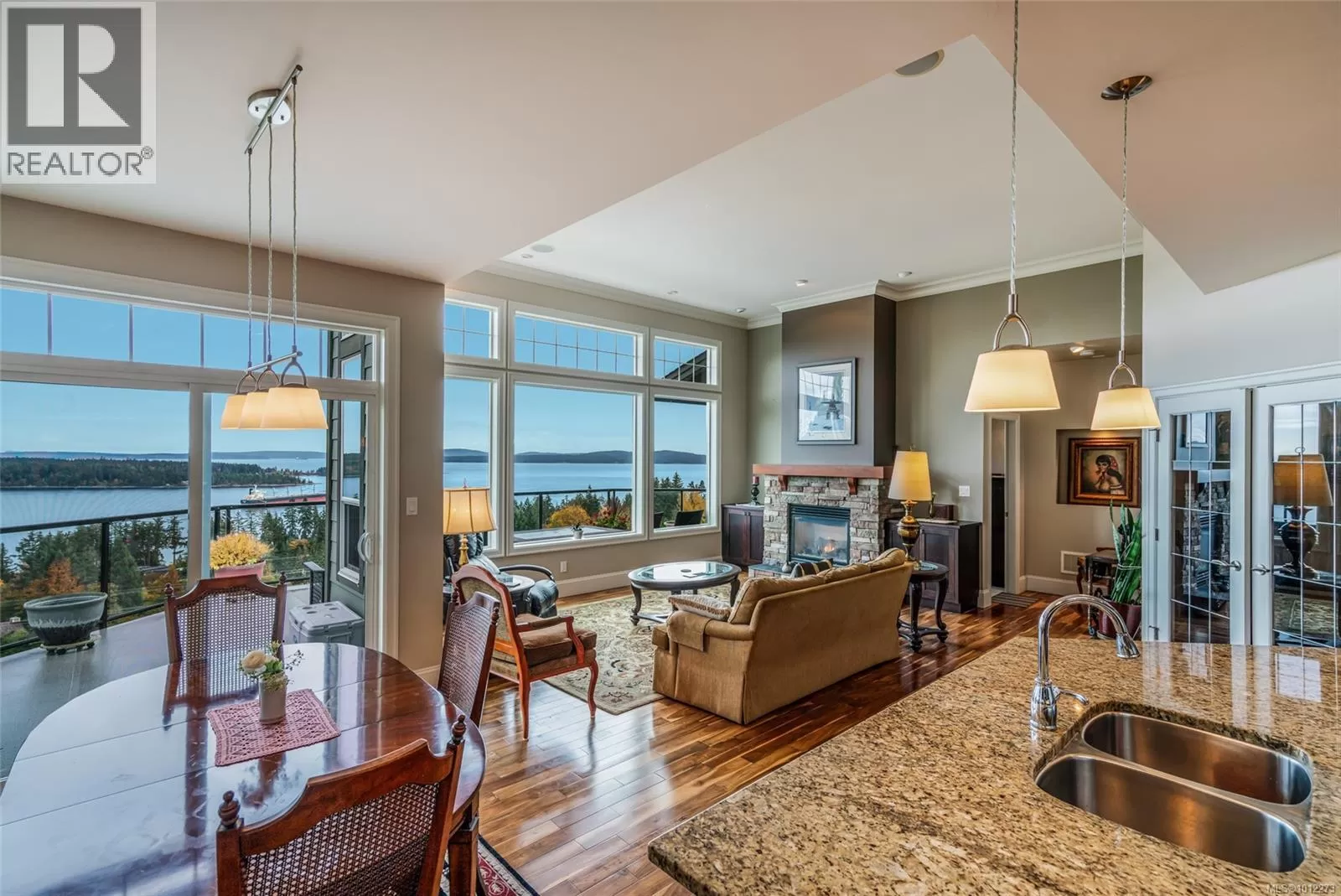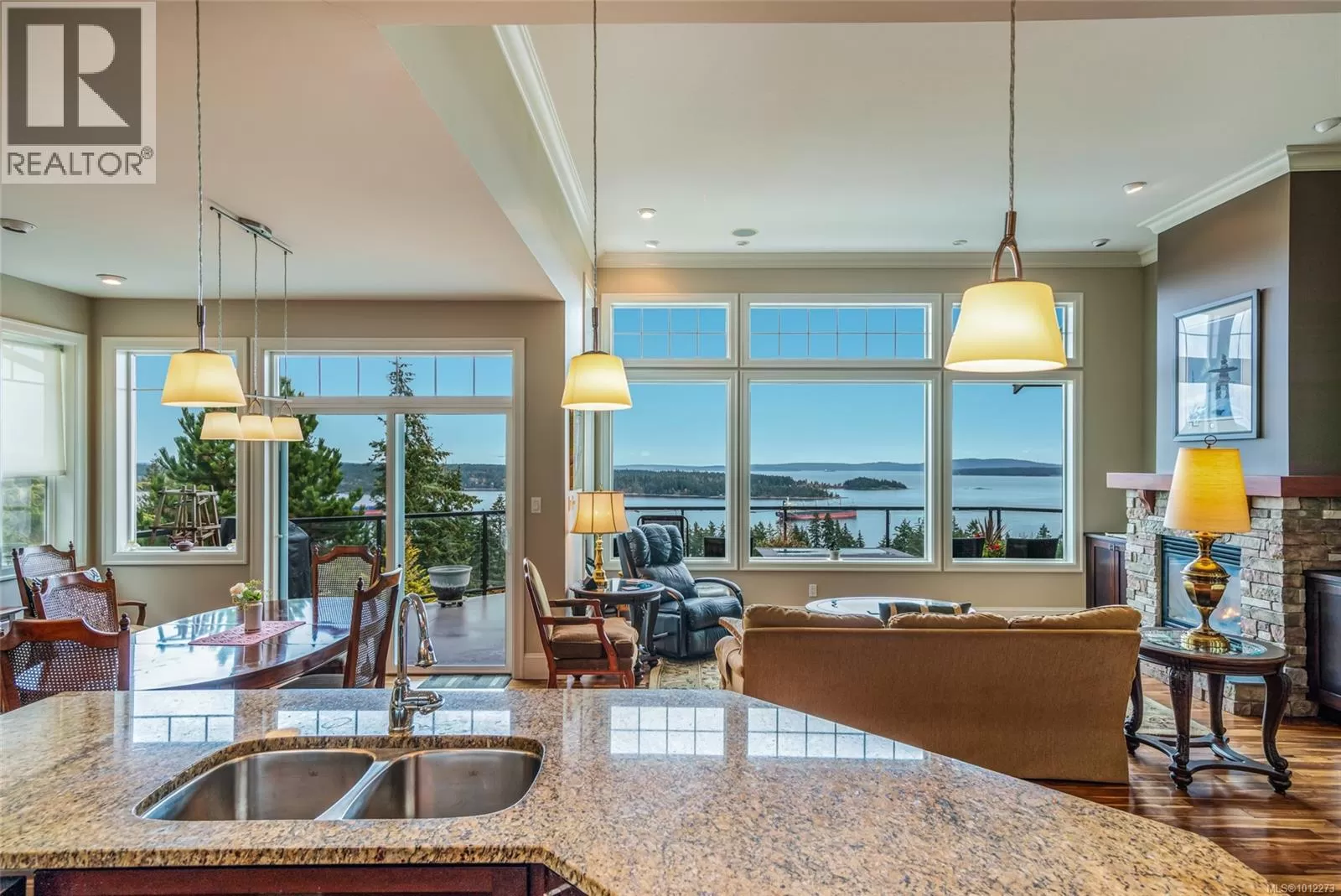 Welcome to your dream retreat, where stunning ocean and coastal mountain views blend seamlessly with sophisticated living. This exceptional home features grand soaring ceilings and a beautiful gas fireplace feature wall, creating an inviting atmosphere perfect for relaxation and entertaining. The gourmet kitchen boasts granite countertops and a spacious island, ideal for culinary enthusiasts. With 2 bedrooms plus a den on main, this home offers versatility for guests or a home office. The expansive open family room provides a perfect gathering space, complemented by a spacious ocean view deck and patio that invites outdoor enjoyment. Additional highlights include a true full-size double garage, gas heat, hot water, and a heat pump for year-round comfort. Extensive hardwood floors add elegance throughout, while the luxurious 5-piece ensuite features heated floors, a separate shower, and a soaking tub for a spa-like experience. Situated in a picturesque town just 10 minutes from a marina, golf courses, a recreation center, and the airport, this property offers an incredible lifestyle for those who love the outdoors and community charm. Donât miss the opportunity to make this stunning coastal oasis your own! (id:27476)