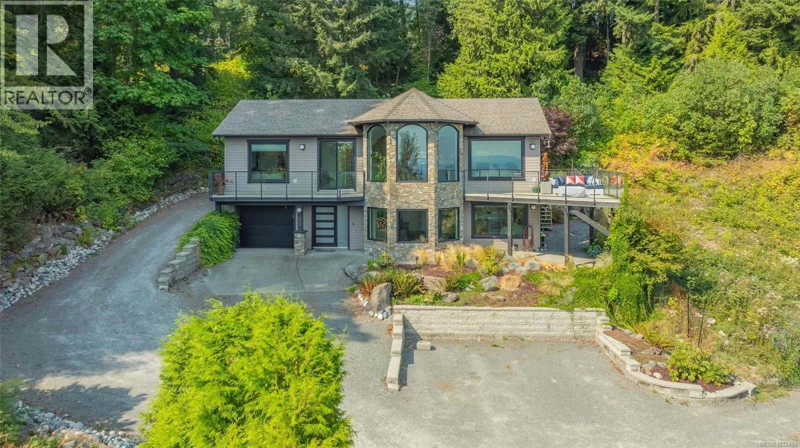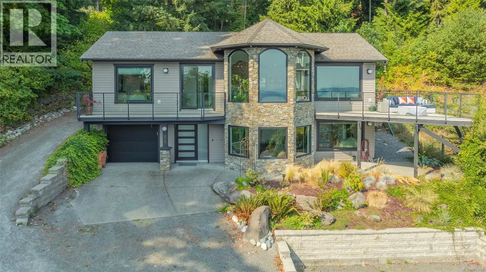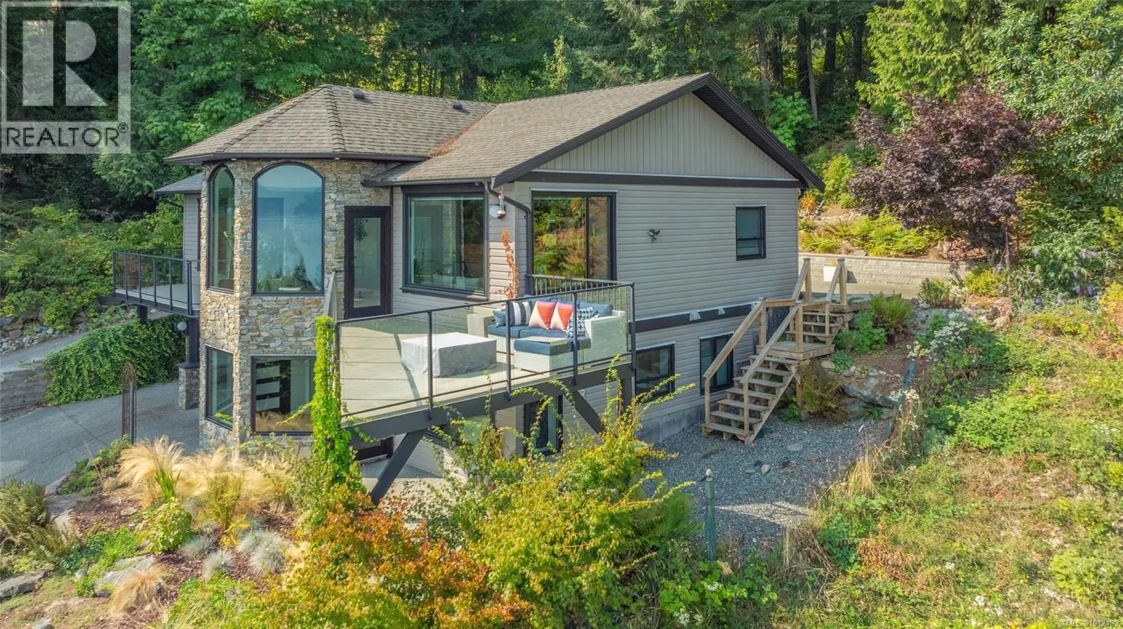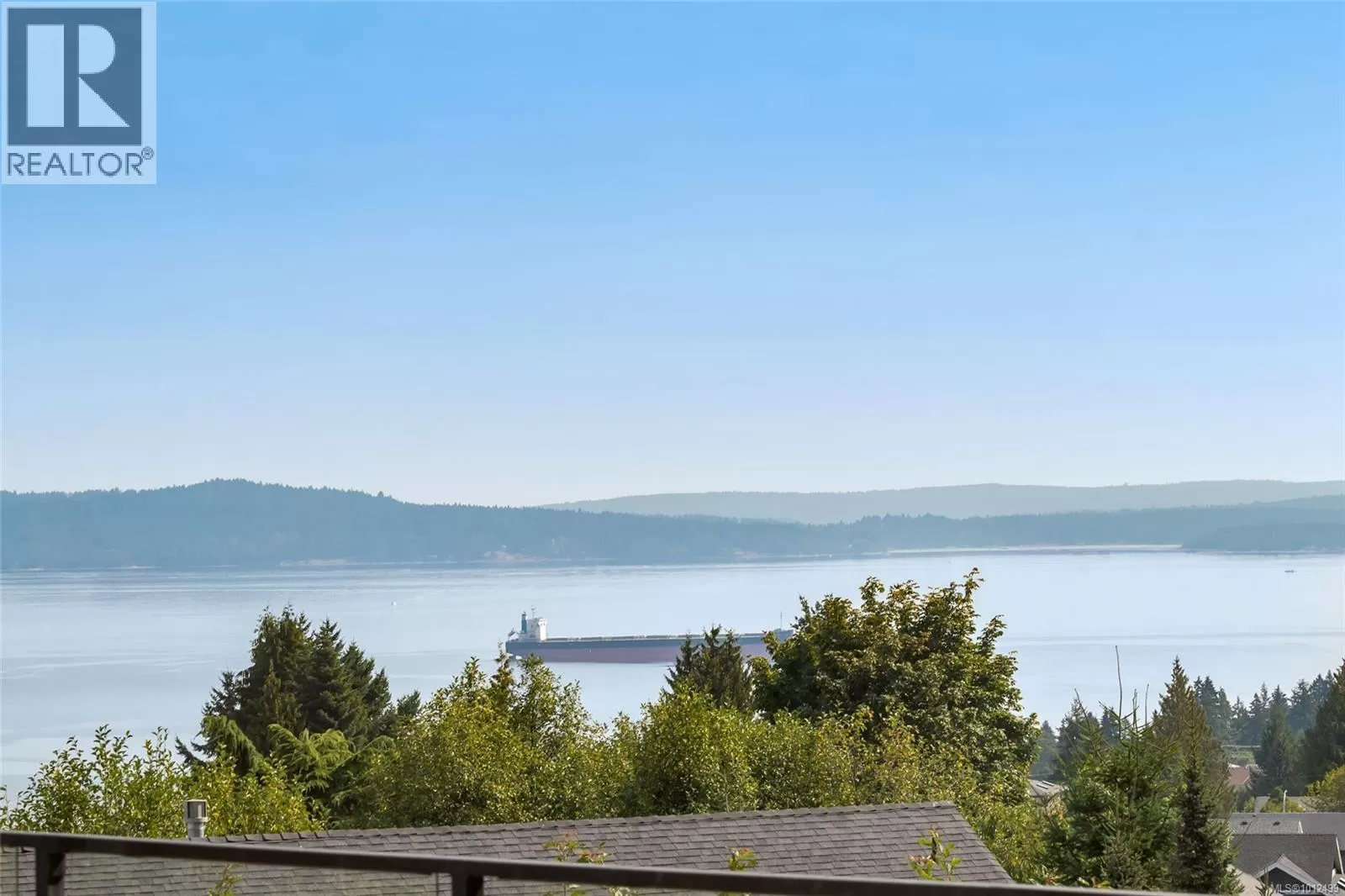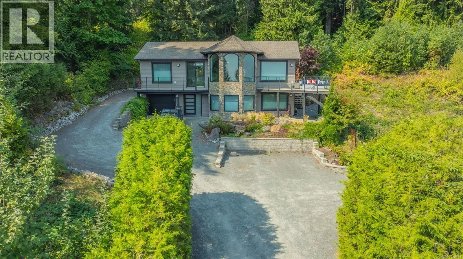 Sitting high above the town of Ladysmith, this beautifully refinished home with suite enjoys spectacular ocean views in an oasis-like setting. The 2 bed plus den, 2 bath main floor takes in the breathtaking vistas with an open concept layout and full wall of windows. The kitchen has jaw-dropping features with Italian marble and brass tile, Vicostone countertops, top of the line appliances and a massive entertainer's island. Both bathrooms are tiled in beautiful terrazzo, with spa-like soaker tub in the primary ensuite. Modern efficiency is prioritized with thick 3-mil windows, heat pump, and hot water on demand. The lower 1-bed suite is open and airy, with vehicle access to both the lower and upper floors allowing for level-entry living. The property is accessed by a private shared driveway winding up through the trees. The undeveloped neighboring property is separately available for purchase, offering an unmatched opportunity to create a stunning acre estate only minutes to the marina, golf and amenities. All data and measurements are approximate, please verify. (id:27476)