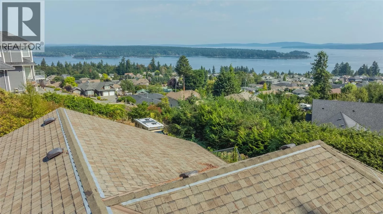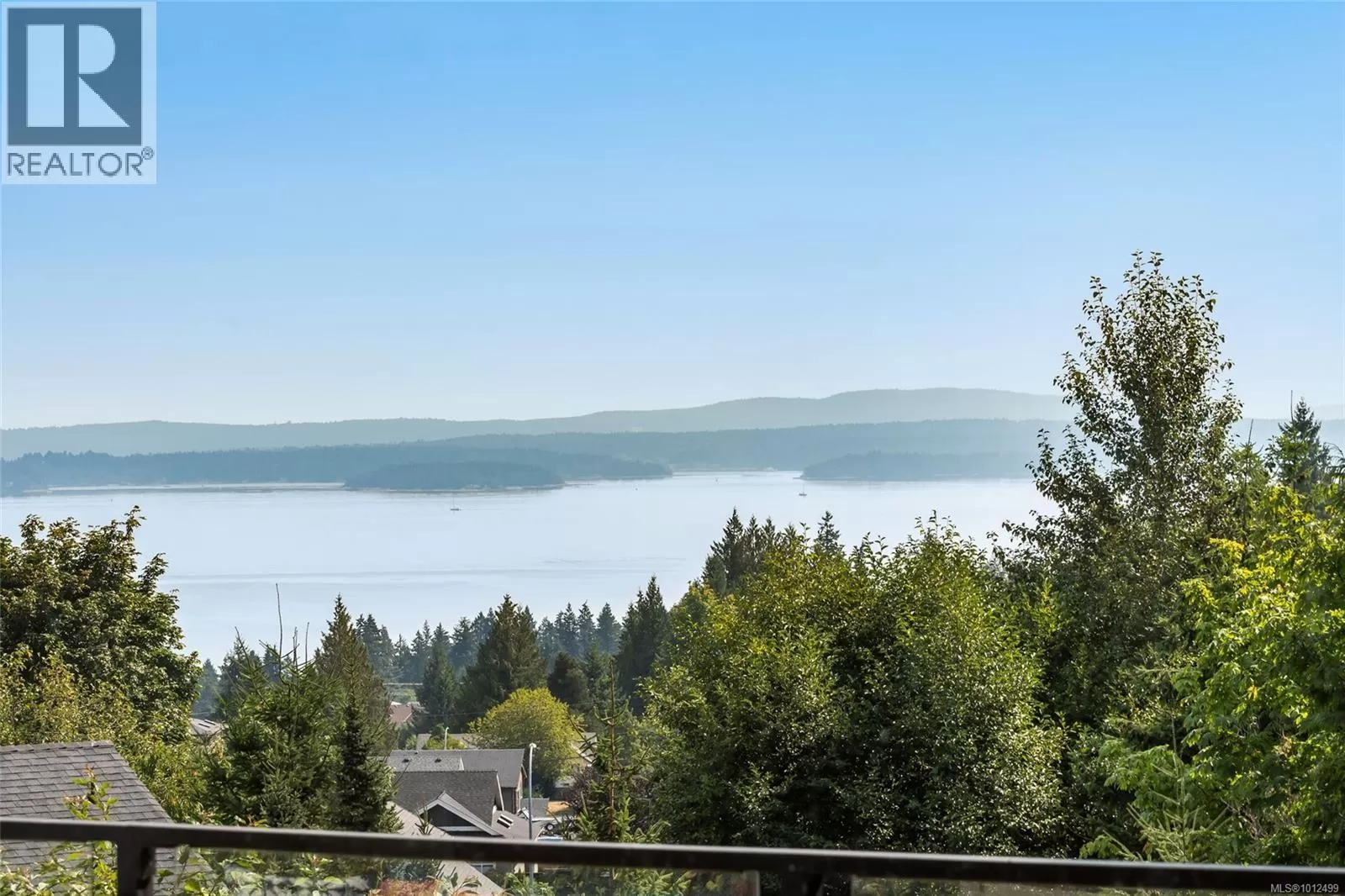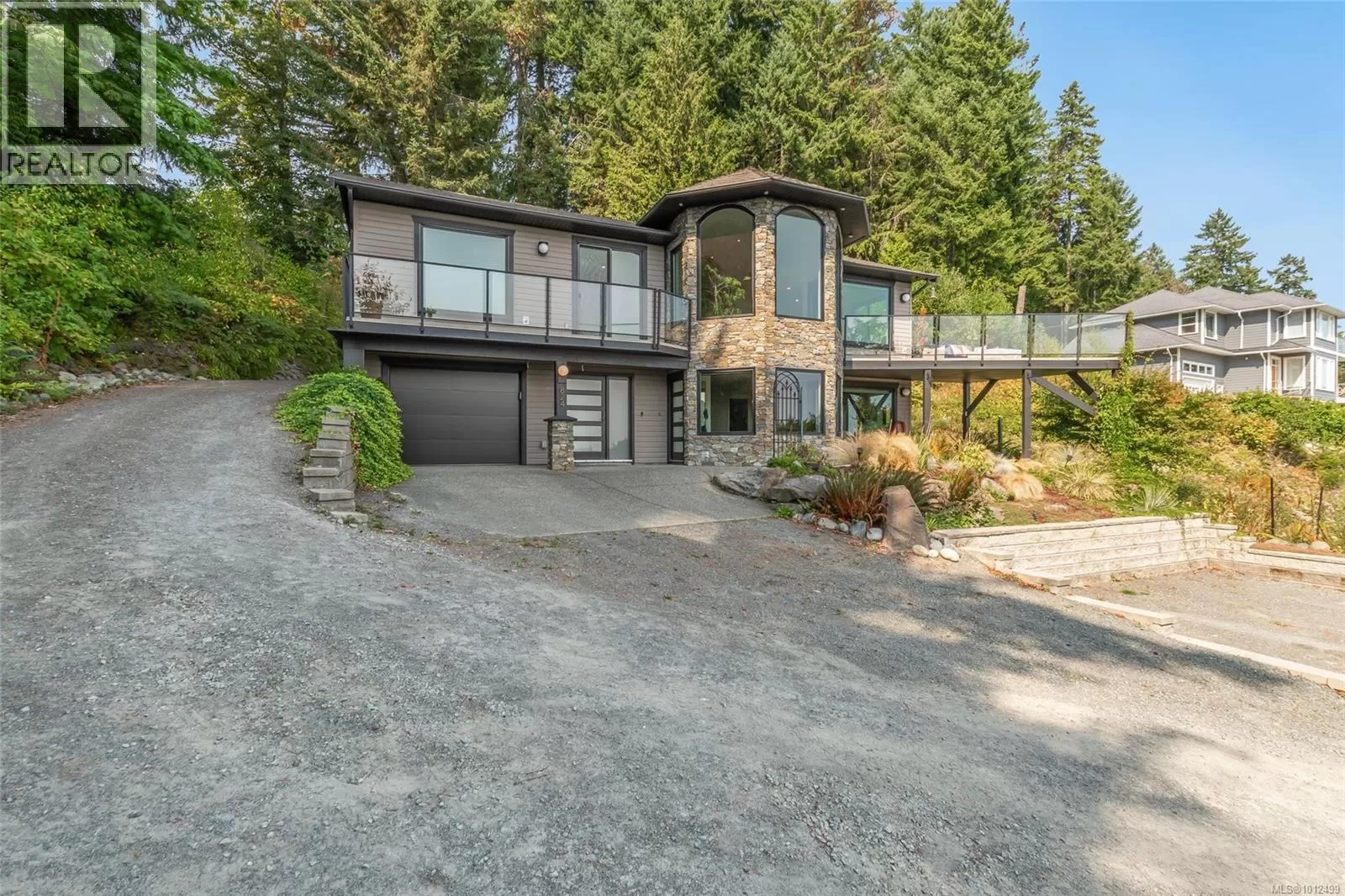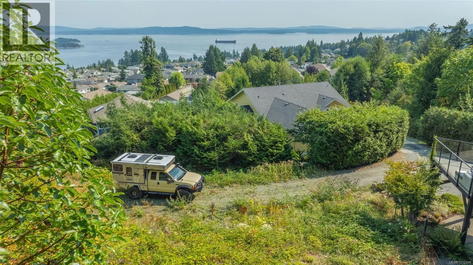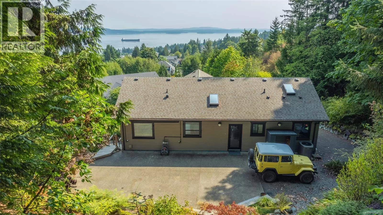 Sitting high above the town of Ladysmith, this beautifully refinished home with suite enjoys spectacular ocean views in an oasis-like setting. The 2 bed plus den, 2 bath main floor takes in the breathtaking vistas with an open concept layout and full wall of windows. The kitchen has jaw-dropping features with Italian marble and brass tile, Vicostone countertops, top of the line appliances and a massive entertainer's island. Both bathrooms are tiled in beautiful terrazzo, with spa-like soaker tub in the primary ensuite. Modern efficiency is prioritized with thick 3-mil windows, heat pump, and hot water on demand. The lower 1-bed suite is open and airy, with vehicle access to both the lower and upper floors allowing for level-entry living. The property is accessed by a private shared driveway winding up through the trees. The undeveloped neighboring property is separately available for purchase, offering an unmatched opportunity to create a stunning acre estate only minutes to the marina, golf and amenities. All data and measurements are approximate, please verify. (id:27476)