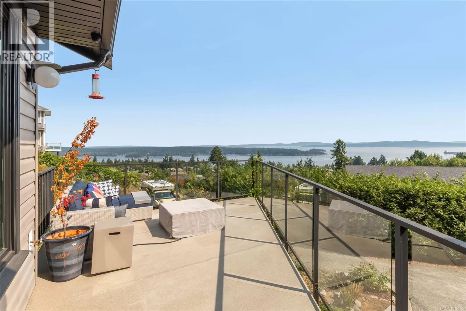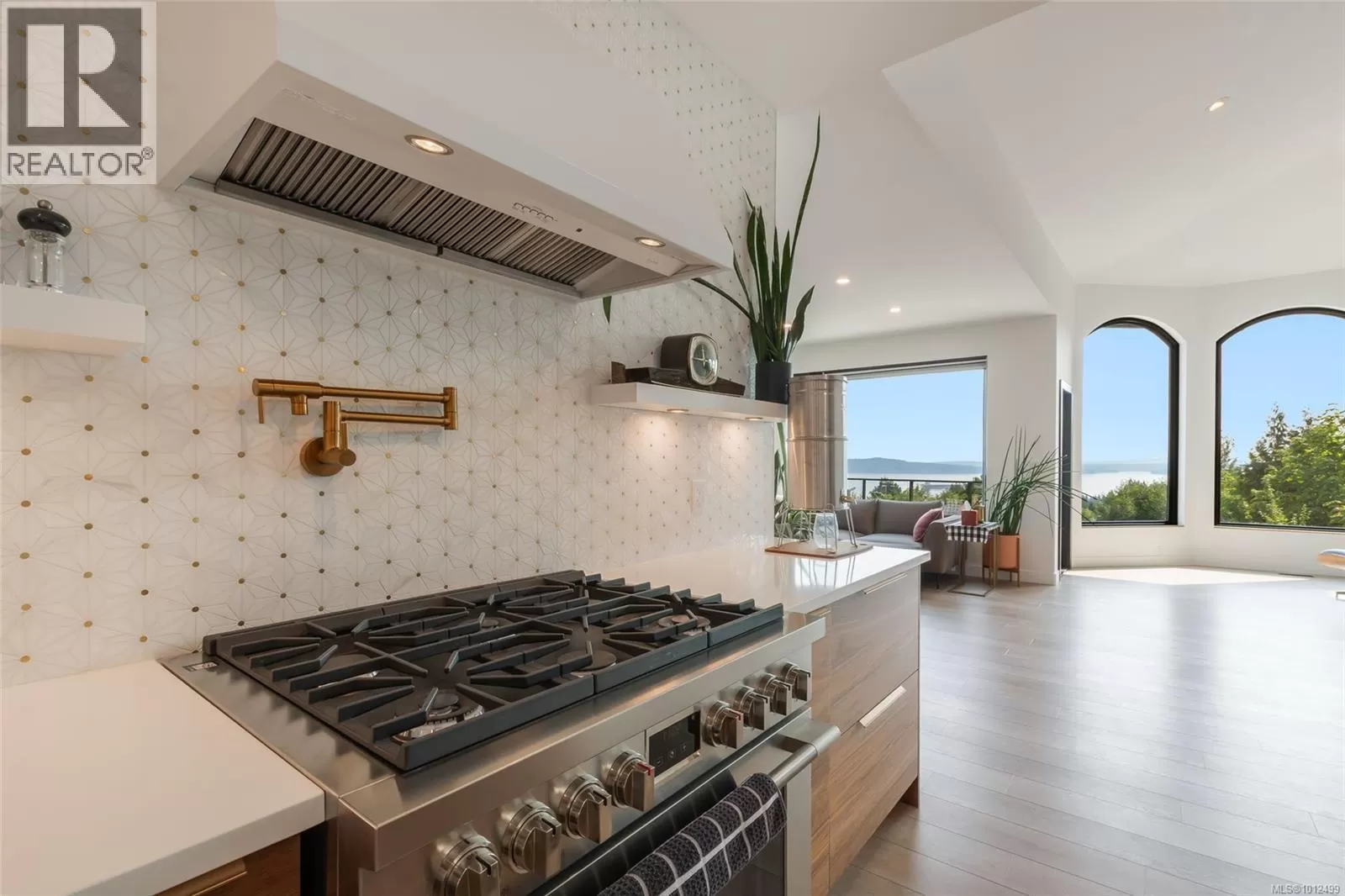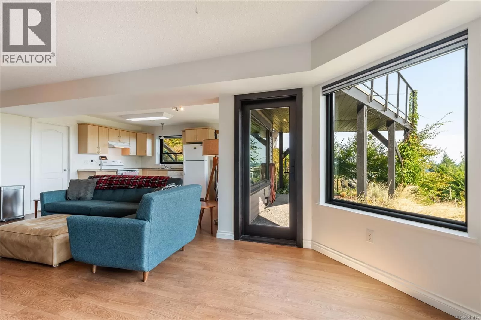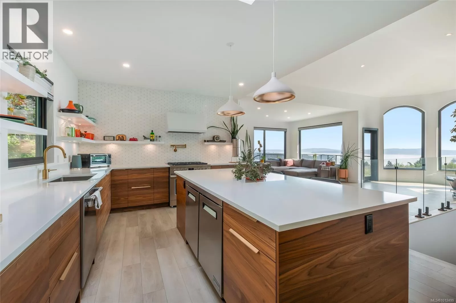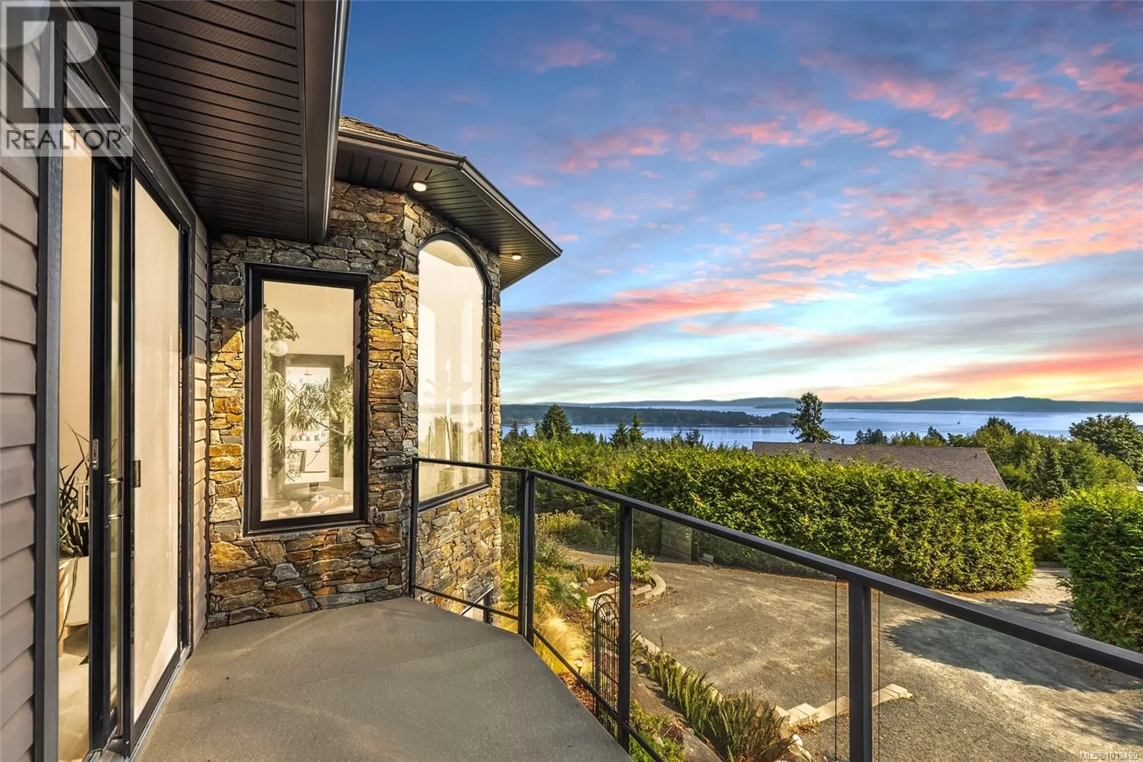 Sitting high above the town of Ladysmith, this beautifully refinished home with suite enjoys spectacular ocean views in an oasis-like setting. The 2 bed plus den, 2 bath main floor takes in the breathtaking vistas with an open concept layout and full wall of windows. The kitchen has jaw-dropping features with Italian marble and brass tile, Vicostone countertops, top of the line appliances and a massive entertainer's island. Both bathrooms are tiled in beautiful terrazzo, with spa-like soaker tub in the primary ensuite. Modern efficiency is prioritized with thick 3-mil windows, heat pump, and hot water on demand. The lower 1-bed suite is open and airy, with vehicle access to both the lower and upper floors allowing for level-entry living. The property is accessed by a private shared driveway winding up through the trees. The undeveloped neighboring property is separately available for purchase, offering an unmatched opportunity to create a stunning acre estate only minutes to the marina, golf and amenities. All data and measurements are approximate, please verify. (id:27476)
