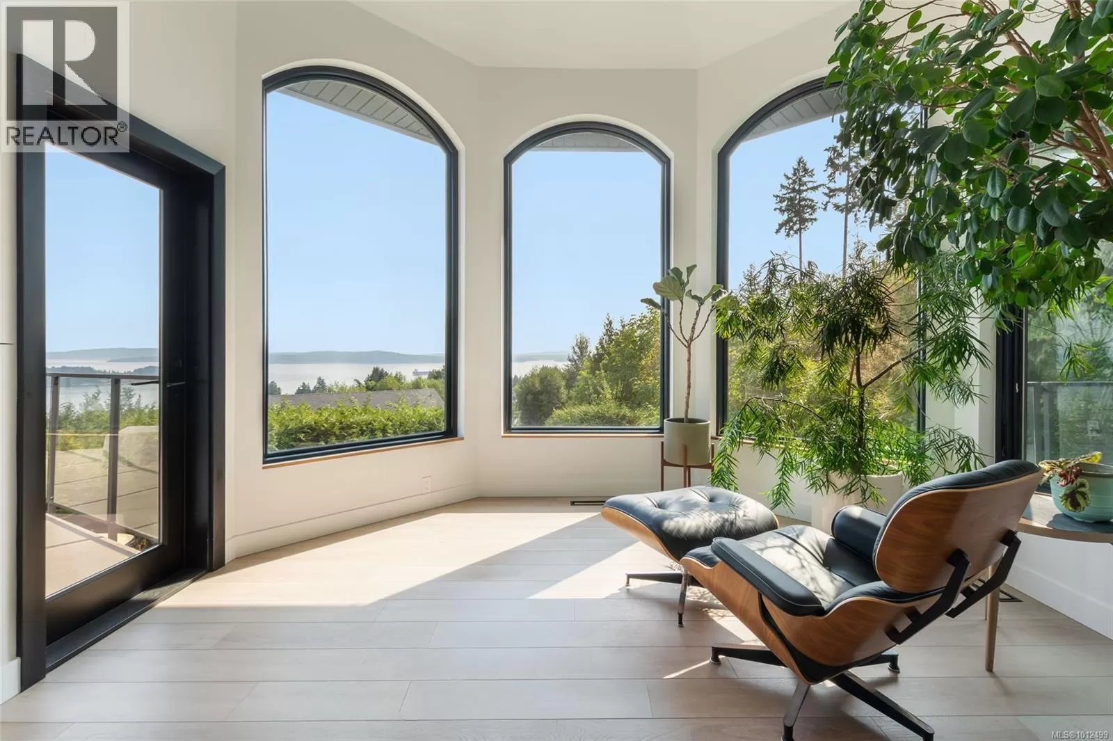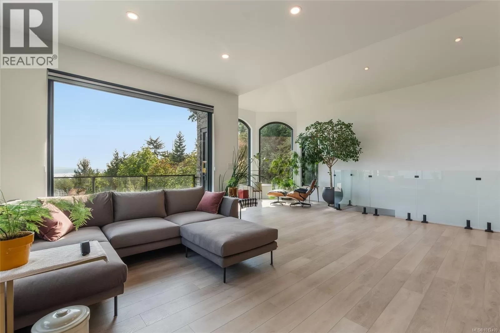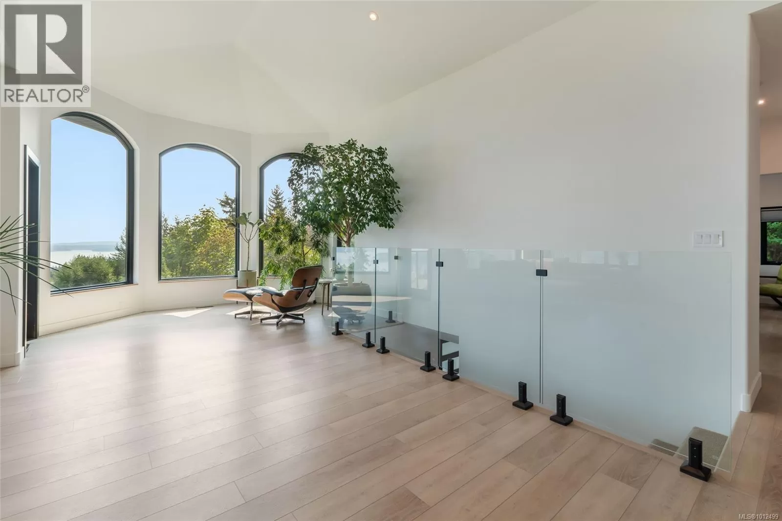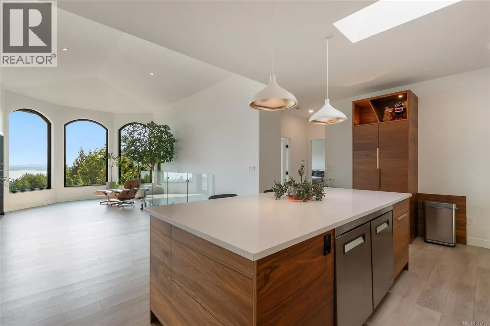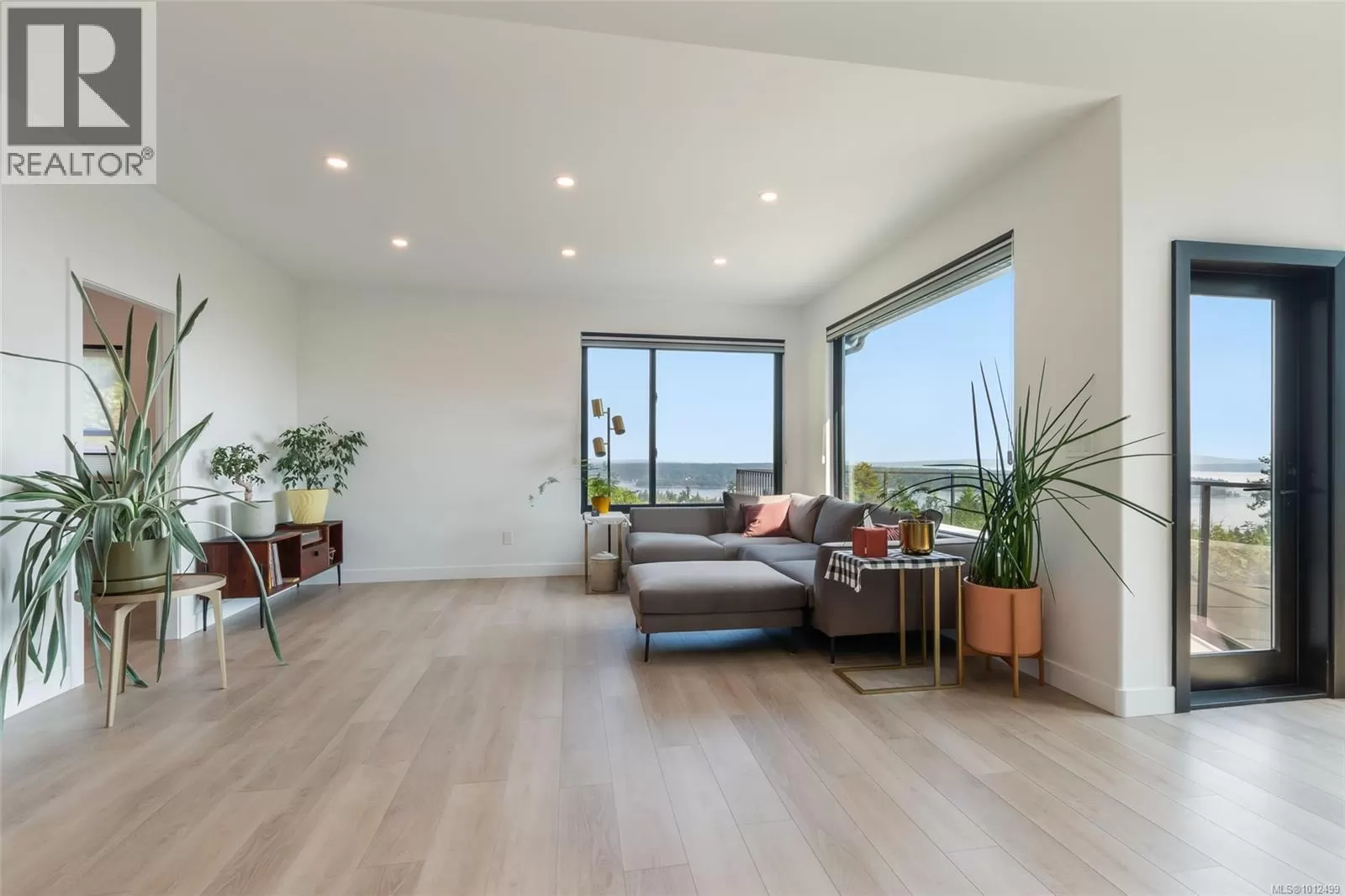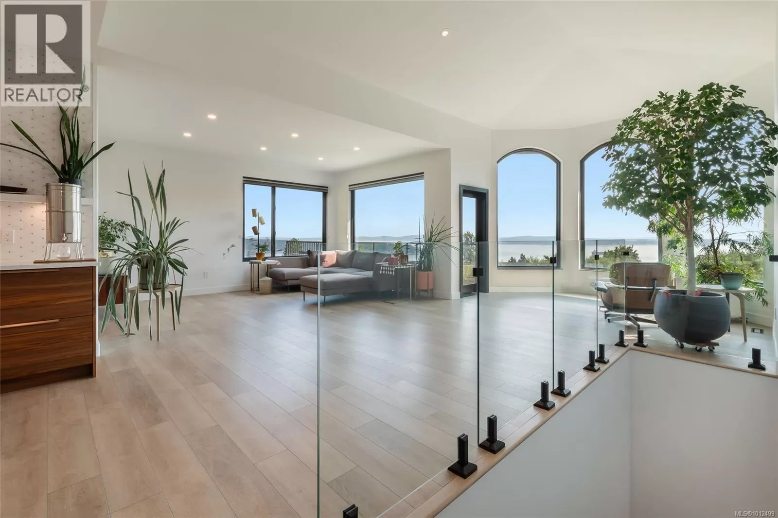 Sitting high above the town of Ladysmith, this beautifully refinished home with suite enjoys spectacular ocean views in an oasis-like setting. The 2 bed plus den, 2 bath main floor takes in the breathtaking vistas with an open concept layout and full wall of windows. The kitchen has jaw-dropping features with Italian marble and brass tile, Vicostone countertops, top of the line appliances and a massive entertainer's island. Both bathrooms are tiled in beautiful terrazzo, with spa-like soaker tub in the primary ensuite. Modern efficiency is prioritized with thick 3-mil windows, heat pump, and hot water on demand. The lower 1-bed suite is open and airy, with vehicle access to both the lower and upper floors allowing for level-entry living. The property is accessed by a private shared driveway winding up through the trees. The undeveloped neighboring property is separately available for purchase, offering an unmatched opportunity to create a stunning acre estate only minutes to the marina, golf and amenities. All data and measurements are approximate, please verify. (id:27476)