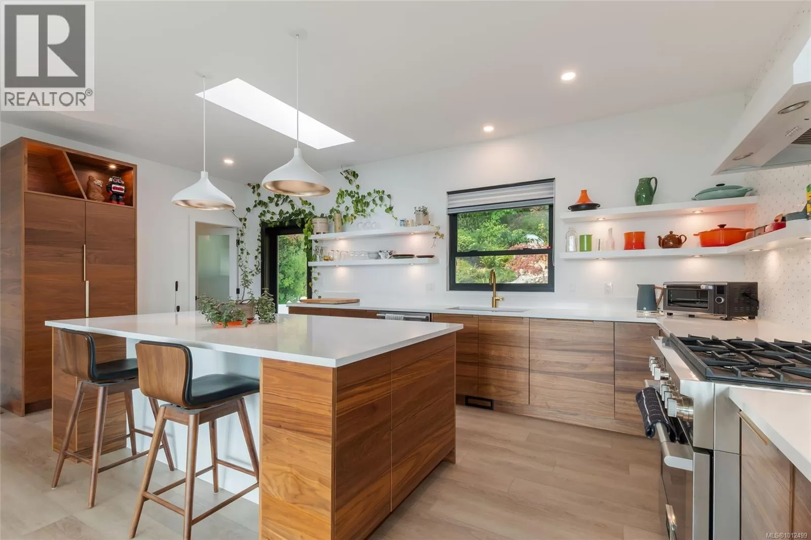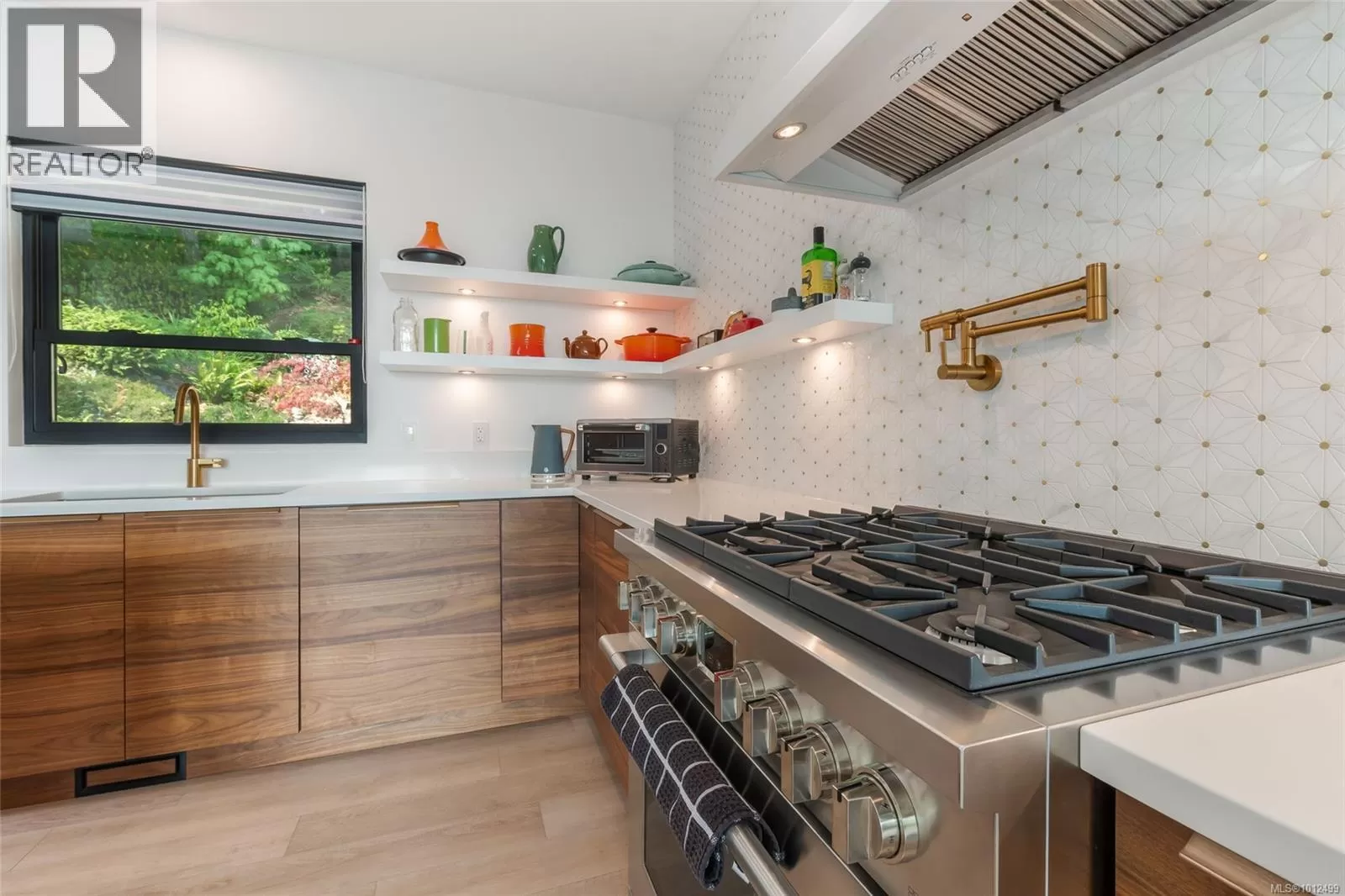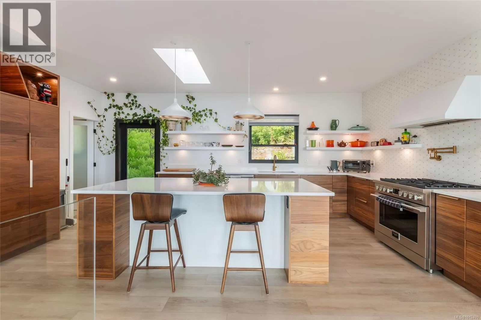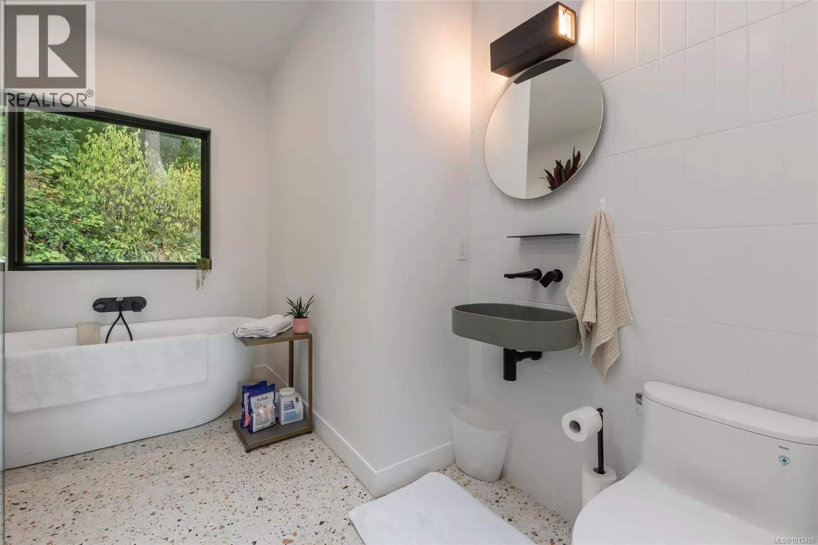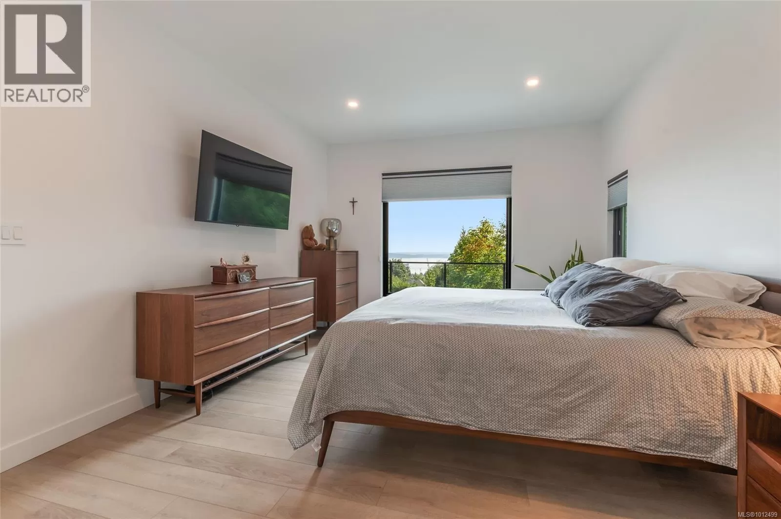 Sitting high above the town of Ladysmith, this beautifully refinished home with suite enjoys spectacular ocean views in an oasis-like setting. The 2 bed plus den, 2 bath main floor takes in the breathtaking vistas with an open concept layout and full wall of windows. The kitchen has jaw-dropping features with Italian marble and brass tile, Vicostone countertops, top of the line appliances and a massive entertainer's island. Both bathrooms are tiled in beautiful terrazzo, with spa-like soaker tub in the primary ensuite. Modern efficiency is prioritized with thick 3-mil windows, heat pump, and hot water on demand. The lower 1-bed suite is open and airy, with vehicle access to both the lower and upper floors allowing for level-entry living. The property is accessed by a private shared driveway winding up through the trees. The undeveloped neighboring property is separately available for purchase, offering an unmatched opportunity to create a stunning acre estate only minutes to the marina, golf and amenities. All data and measurements are approximate, please verify. (id:27476)
