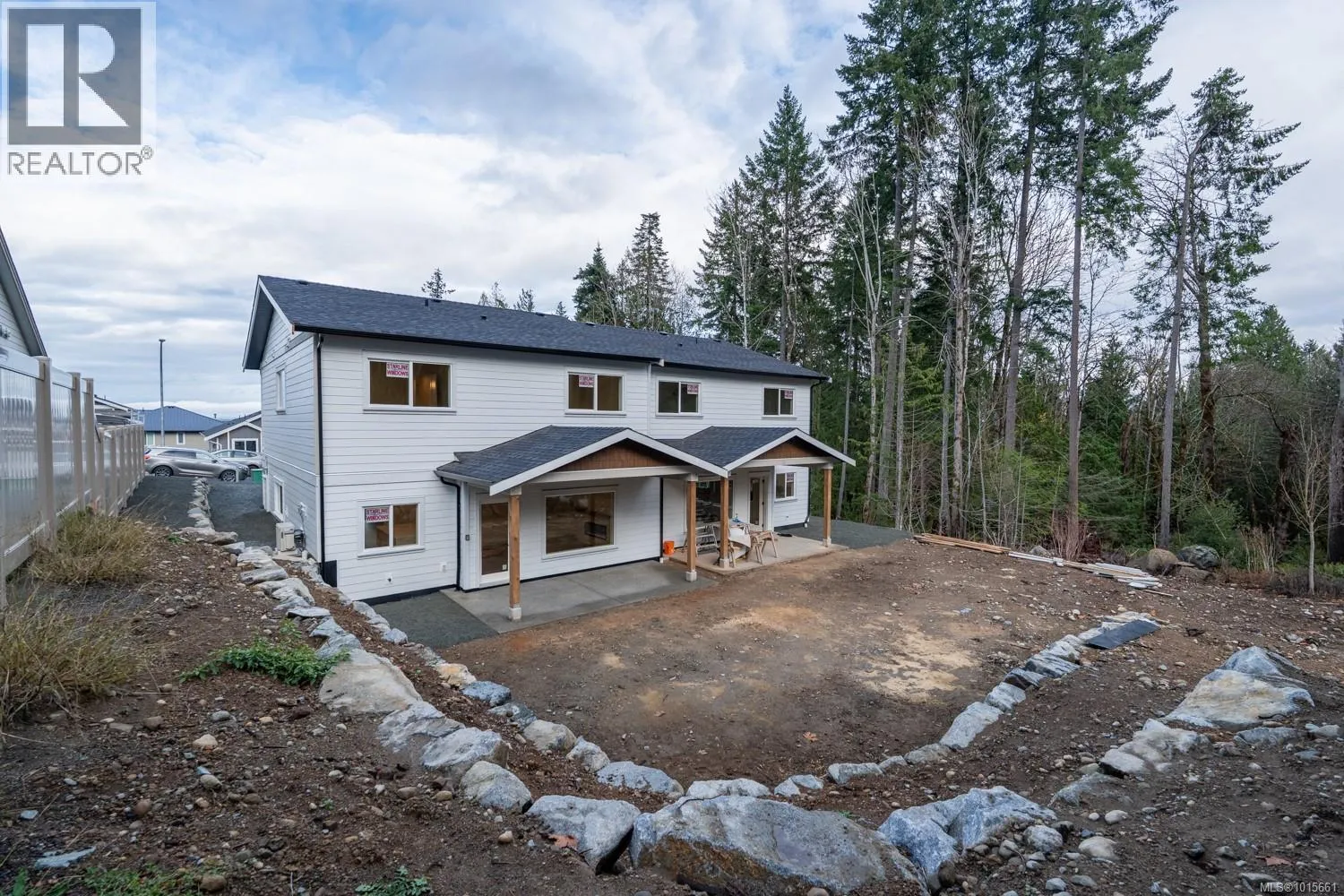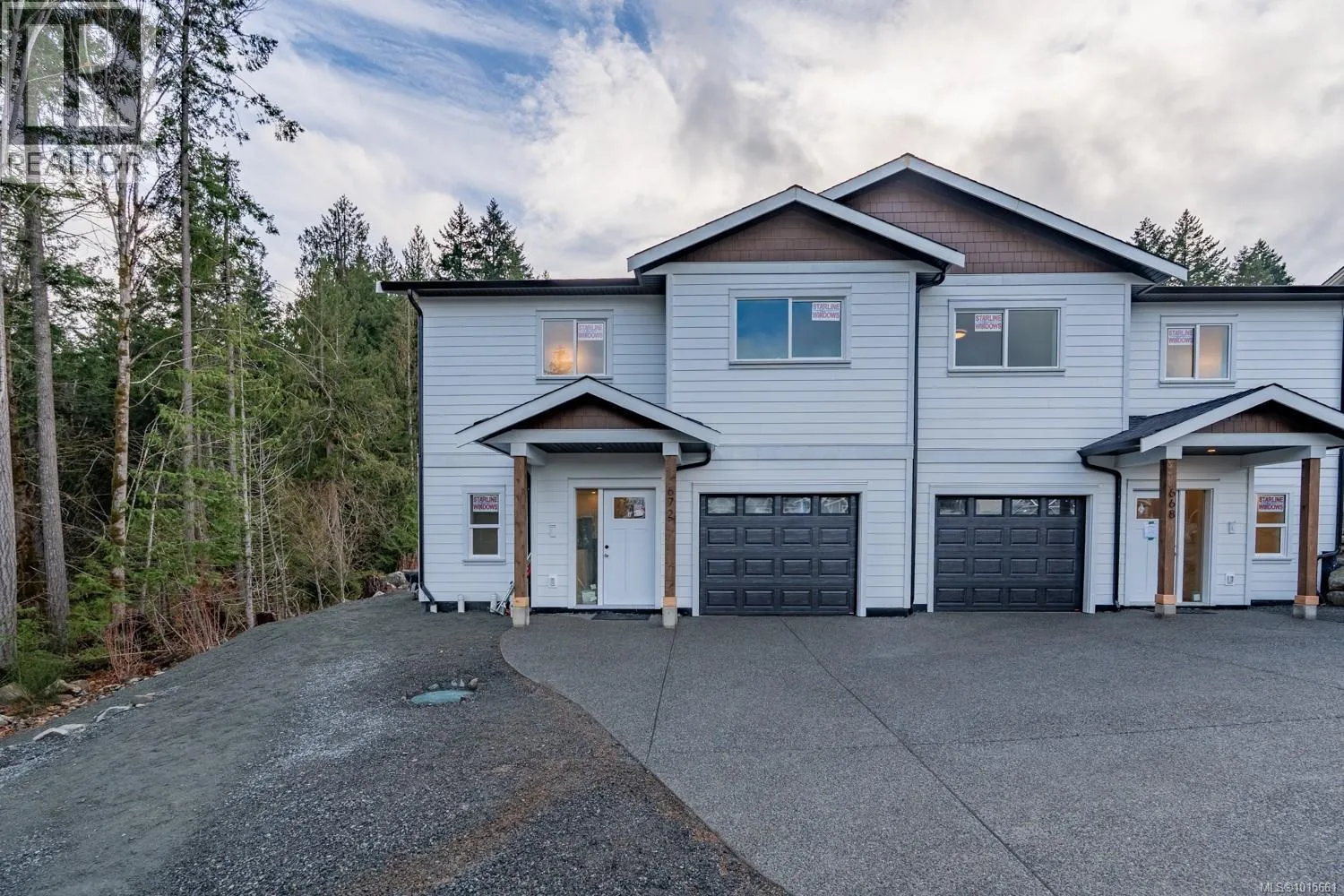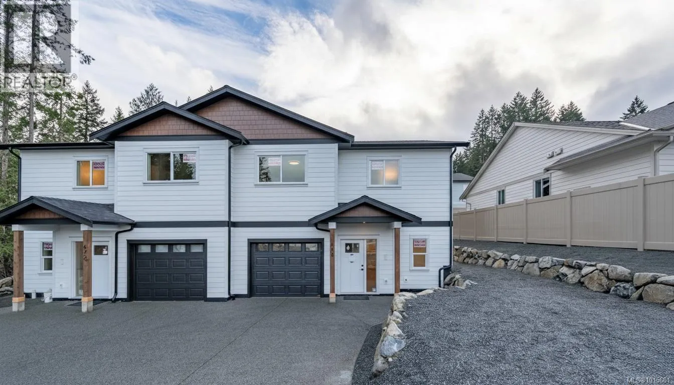 Stunning new half duplex at 672/668 Sanderson Rd in Ladysmith, offering 3 bedrooms and 3 baths with beautifully curated interior designâand no strata fees. The main floor features a bright, open-concept layout flowing from dining to kitchen to living space. The modern kitchen includes a large island with quartz countertops, stainless appliances, ample cabinetry, and a spacious pantry. The living area opens to a covered patio and a larger-than-typical private yard in a quiet, established neighbourhood. Upstairs, the impressive primary suite boasts a 7âx10â5â walk-in closet and dual-sink ensuite with in-floor heat. Two additional bedrooms, a full bath, laundry, and a versatile flex room complete the level. With peekaboo mountain views, quality finishes, extra garage storage, an attached garage, and a ductless heat pump, this home offers modern comfort for every buyer. Price plus GST.All measurements are approx, please verify if deemed important (id:27476)