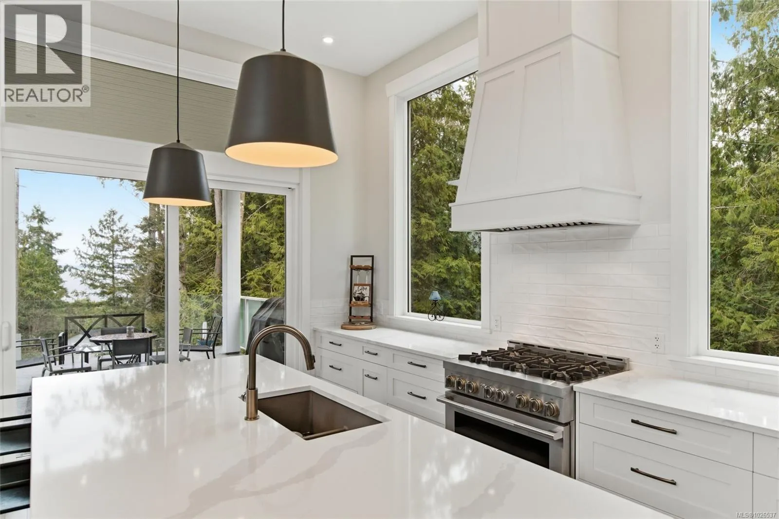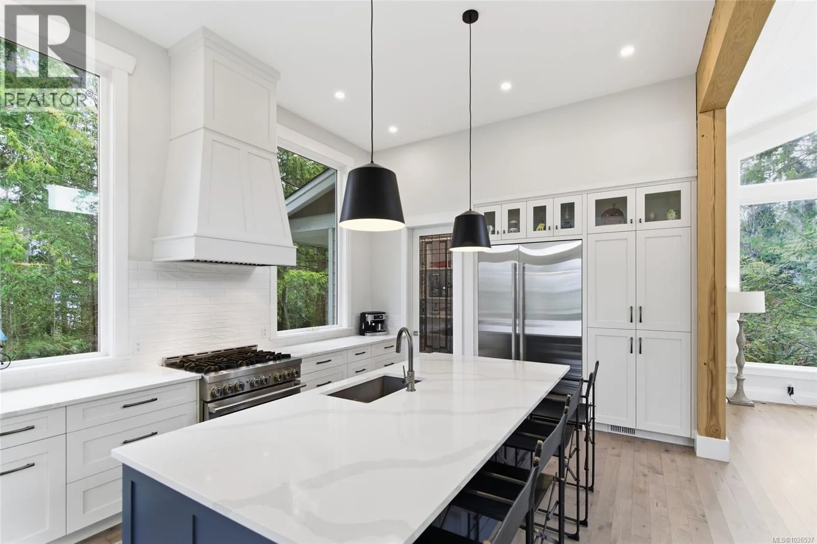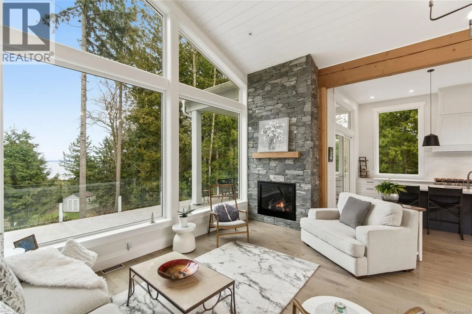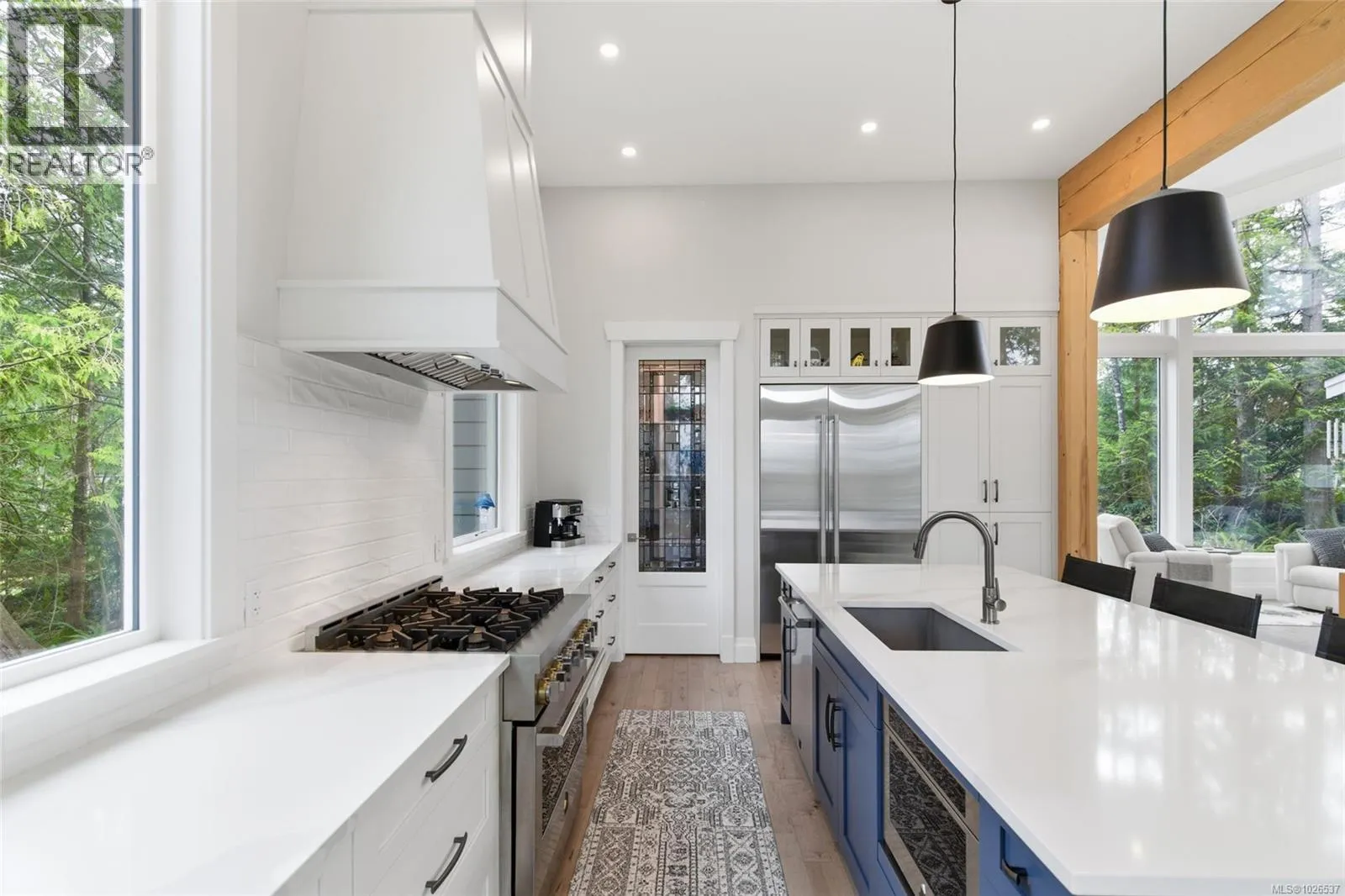 Architecturally Designed West Coast Home on 1 Acre â Vaulted Ceilings, Exposed Beams, Quality Finishes, Triple Garage & Legal Suite. Custom built by Gamble Homes, this 3,400+ sq ft residence sits on a private 1.04-acre property in sunny Saltair on a quiet dead-end street with nearby ocean access. Thoughtfully positioned to capture ocean glimpses, forest views, and abundant natural light, the home features high ceilings and expansive windows designed to maximize sunlight throughout. The open-concept main level showcases exposed Douglas fir beams, maple hardwood floors, and a natural gas fireplace with custom stonework. The kitchen offers quartz countertops, custom cabinetry, large island, walk-in pantry, and 6-burner gas range. The main-level primary suite includes ocean glimpses, walk-in closet, and spa-inspired ensuite with heated tile floors, freestanding tub, walk-in shower, and double vanity. Spacious laundry/mud room adds everyday functionality. Upstairs are two additional bedrooms and a full bathroom. Quality finishes include custom 8-ft doors, detailed trim, heated tile floors, and an efficient 3-zone heat pump system. A self-contained 1-bedroom legal suite (approx. 550 sq ft) provides excellent flexibility for extended family or rental income, for a total of 4 bedrooms and 4 bathrooms overall. Outdoor features include covered and open decks, tiered rock-lined landscaping, exposed aggregate entry, and natural stone accents. The 1,170 sq ft triple-bay garage offers an over-height bay and storage room. RV parking with full hookup, EV charger, and heated crawl space complete this exceptional custom home. Full information package, video & virtual tour are available. (id:27476)