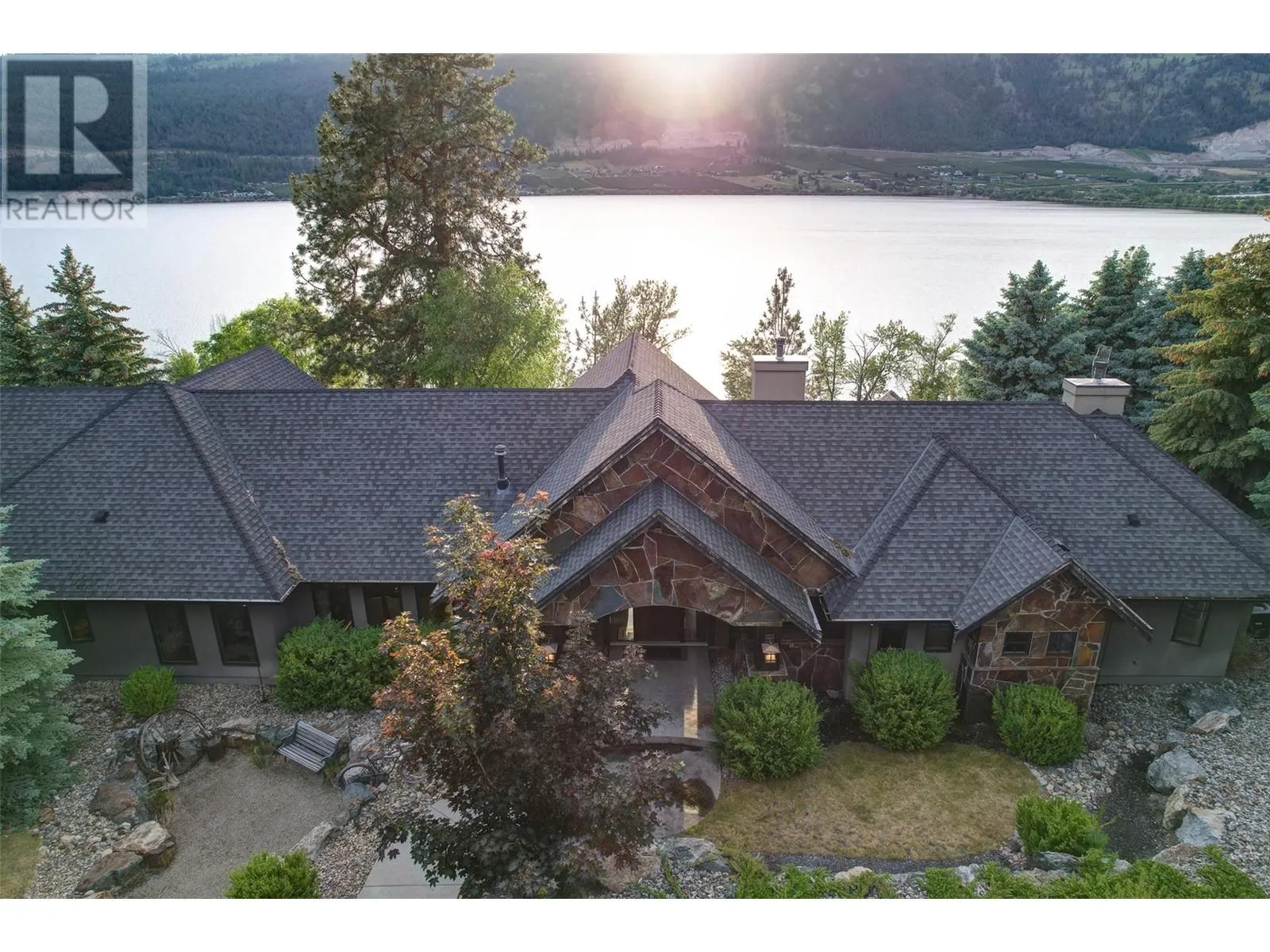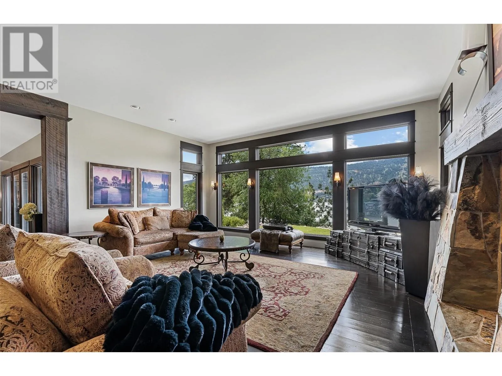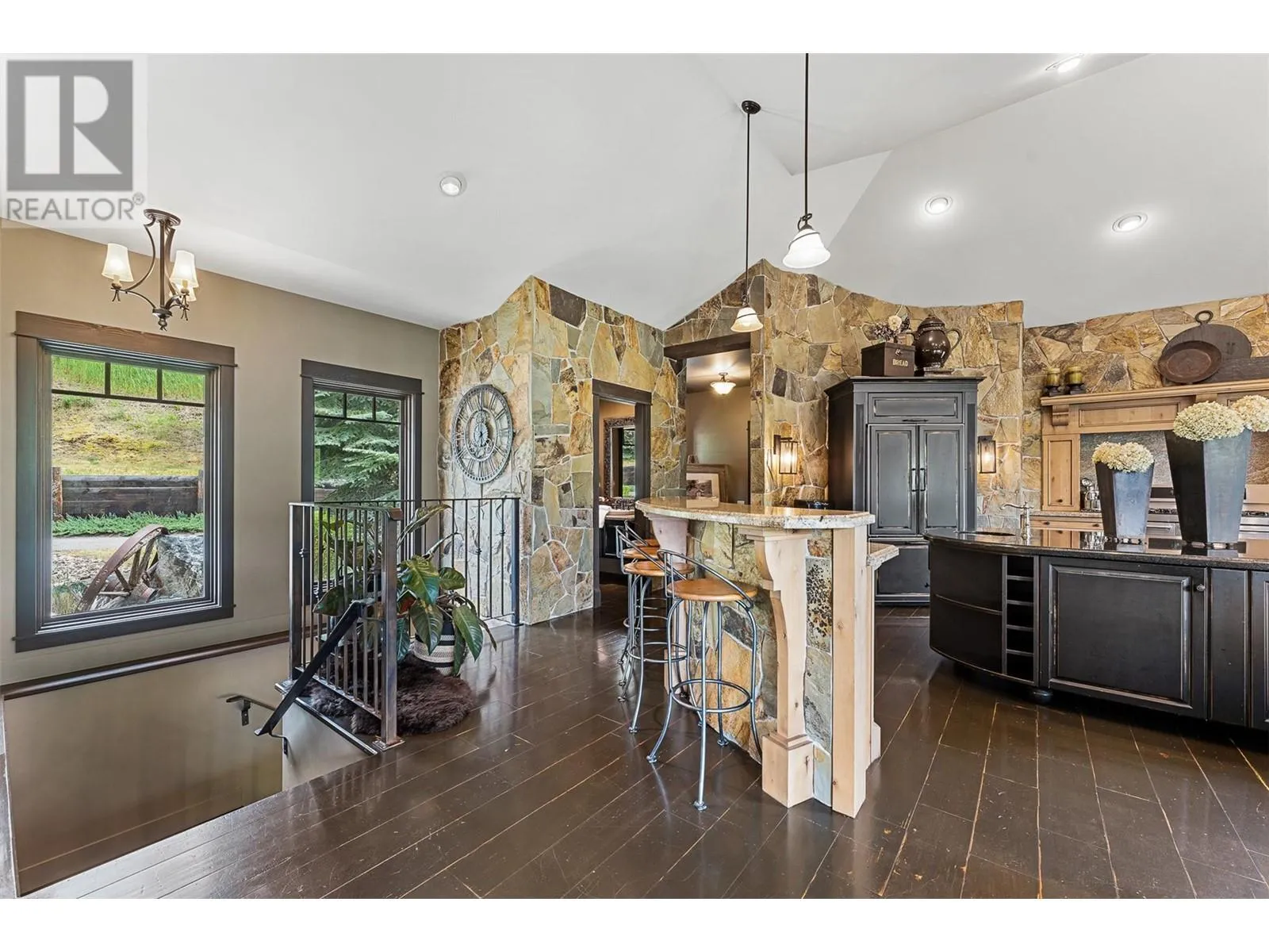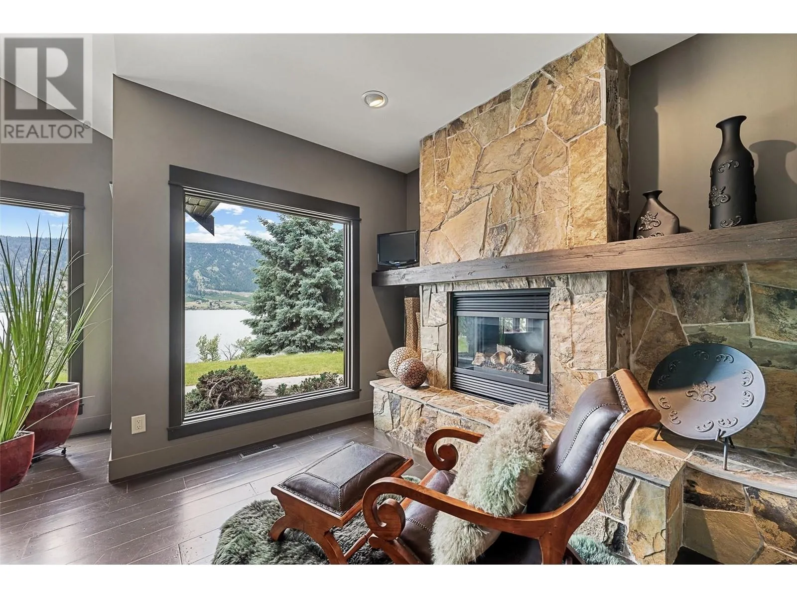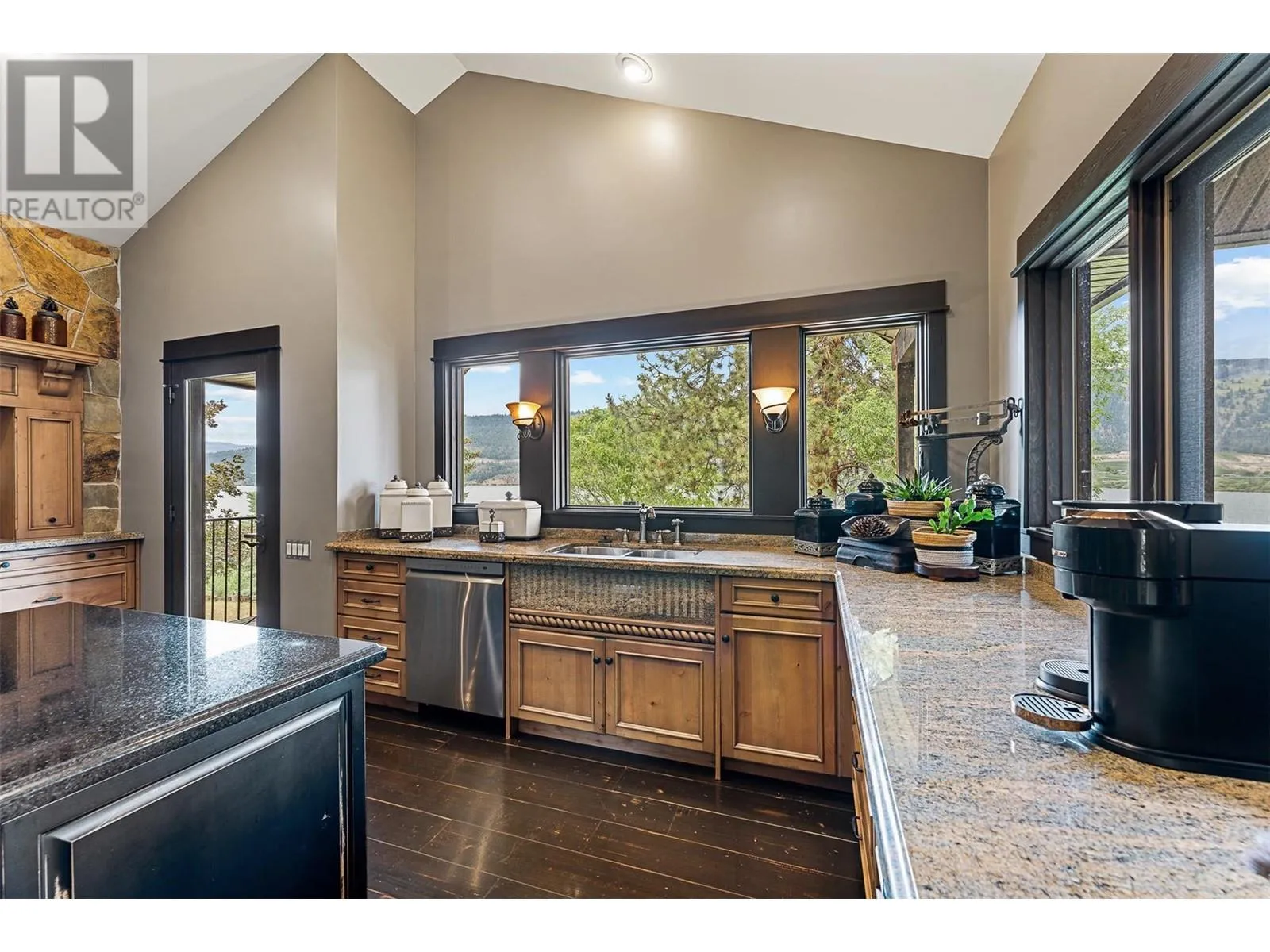 Set on 1.10 acres with panoramic lake views, this 4 bedroom, 4 bath walk-out rancher offers 3,725 sq. ft. of refined living space just steps from the Okanagan Rail Trail, Wood Lake, and Kalamalka Lake. Outdoor living is elevated with a covered upper deck featuring a vaulted ceiling, gas line, and a unique bridge design, plus a partially covered lower patio with dual access. Inside, natural materials and custom craftsmanship shine with vaulted ceilings, pine hardwood floors, floor-to-ceiling windows, and genuine stone details throughout. The chefâs kitchen boasts two islands (one with wine storage, one with seating), granite counters, and a built-in JennAir and Frigidaire appliances. The dining area opens to the deck, while the living room features a stone fireplace and floor to ceiling windows that frame the lake views. The primary suite is a true retreat with a fireplace, spa-inspired ensuite, and access to an outdoor shower. Downstairs offers a cozy recreation room, custom bar, and lakeview guest rooms. Additional highlights: 3-stall garage with granite-topped built-ins, custom entry door, built-in speakers, B&B license, and space for a pool. A rare opportunity for privacy, luxury, and adventure in the heart of the Okanagan. (id:27476)