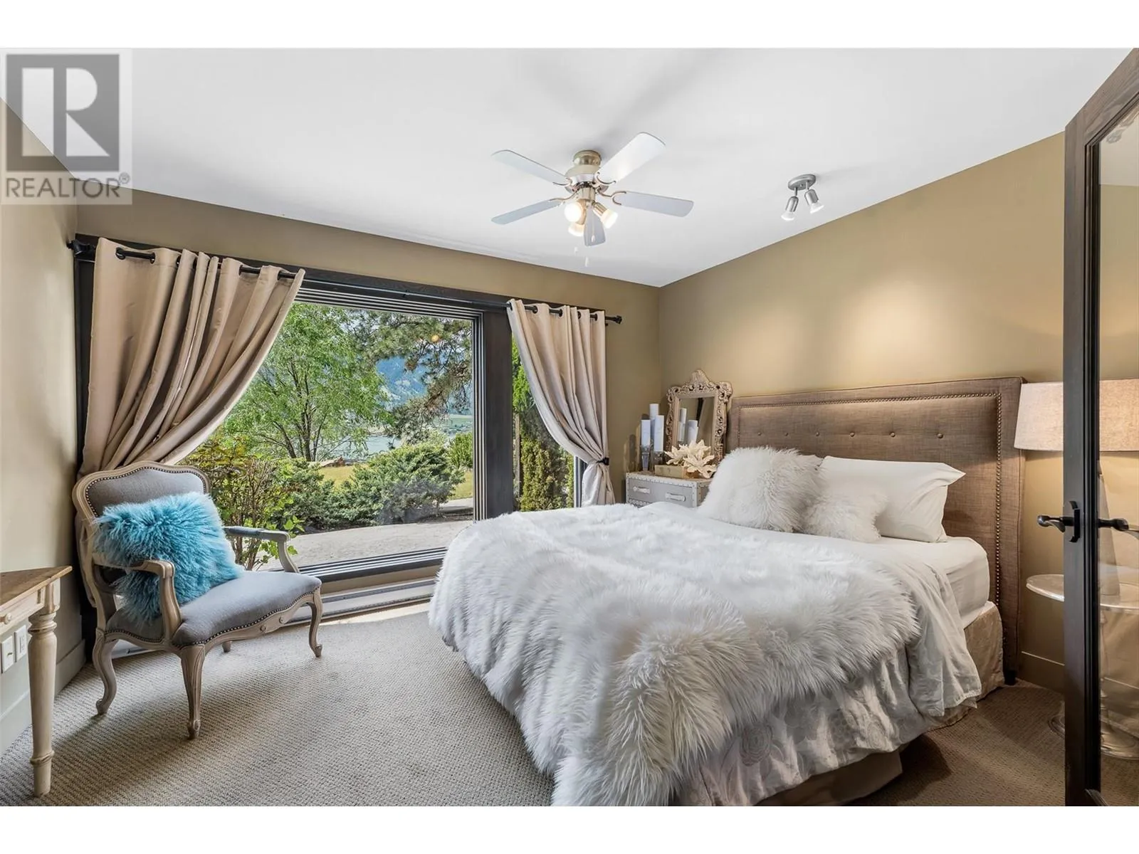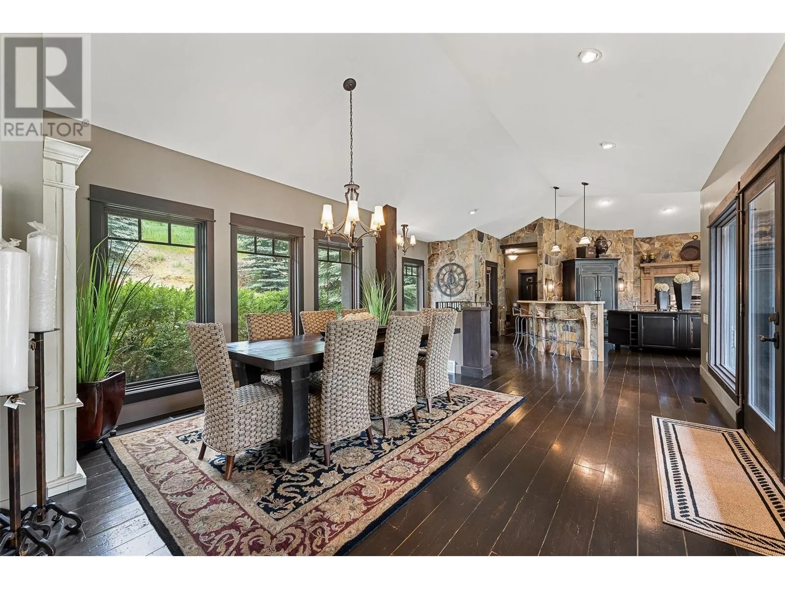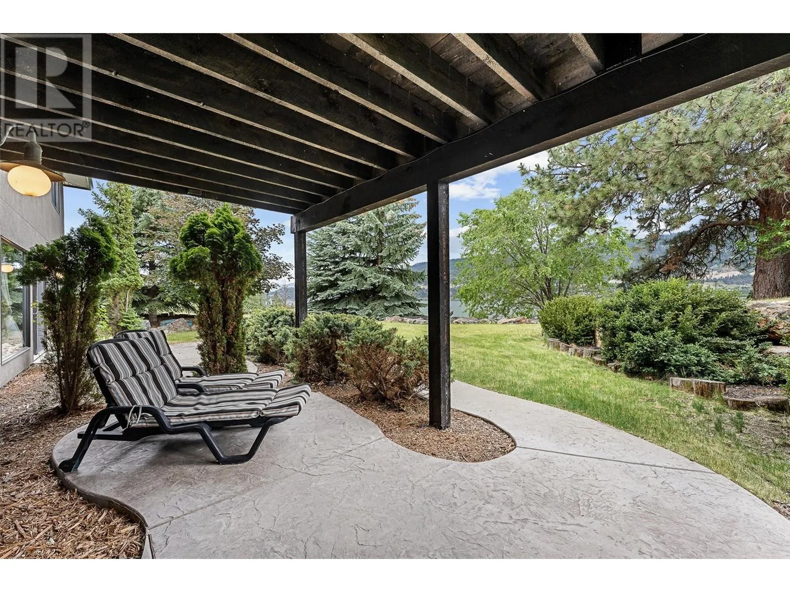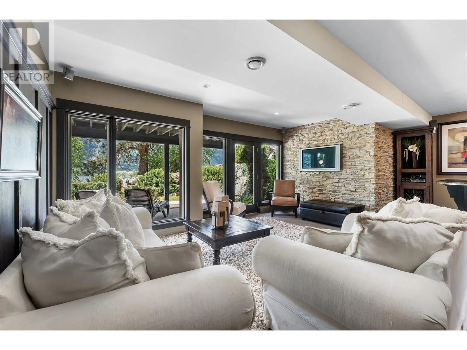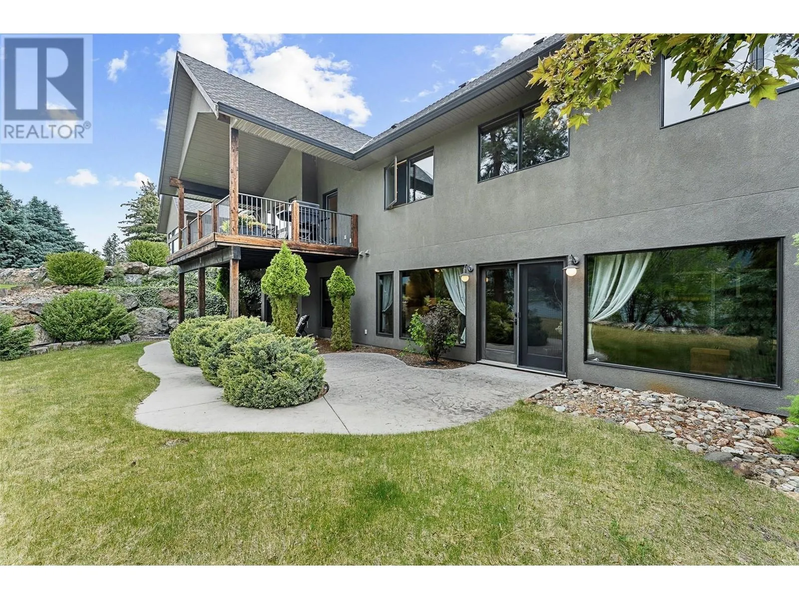 Set on 1.10 acres with panoramic lake views, this 4 bedroom, 4 bath walk-out rancher offers 3,725 sq. ft. of refined living space just steps from the Okanagan Rail Trail, Wood Lake, and Kalamalka Lake. Outdoor living is elevated with a covered upper deck featuring a vaulted ceiling, gas line, and a unique bridge design, plus a partially covered lower patio with dual access. Inside, natural materials and custom craftsmanship shine with vaulted ceilings, pine hardwood floors, floor-to-ceiling windows, and genuine stone details throughout. The chefâs kitchen boasts two islands (one with wine storage, one with seating), granite counters, and a built-in JennAir and Frigidaire appliances. The dining area opens to the deck, while the living room features a stone fireplace and floor to ceiling windows that frame the lake views. The primary suite is a true retreat with a fireplace, spa-inspired ensuite, and access to an outdoor shower. Downstairs offers a cozy recreation room, custom bar, and lakeview guest rooms. Additional highlights: 3-stall garage with granite-topped built-ins, custom entry door, built-in speakers, B&B license, and space for a pool. A rare opportunity for privacy, luxury, and adventure in the heart of the Okanagan. (id:27476)
