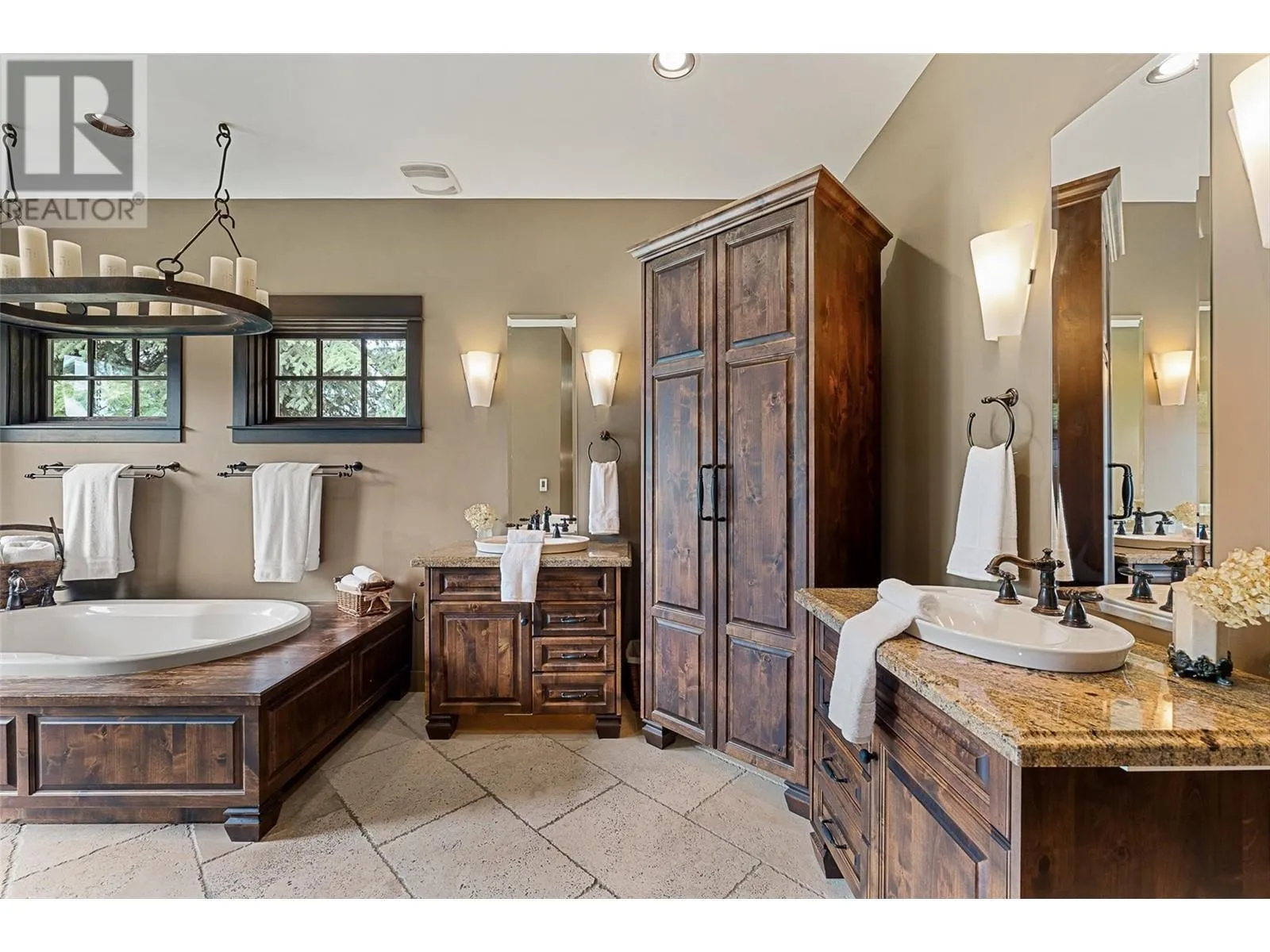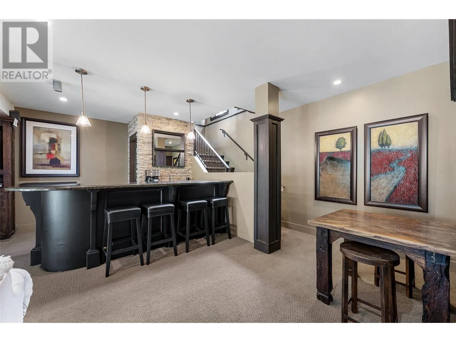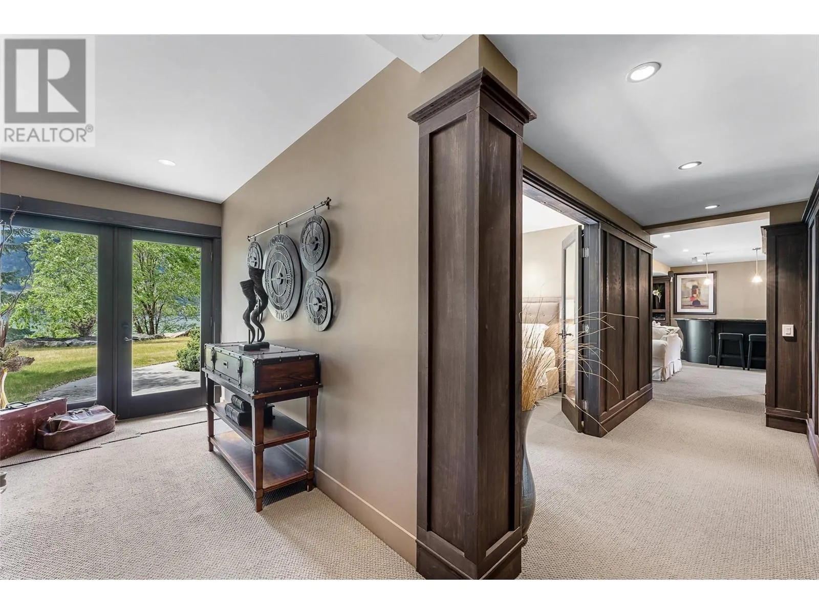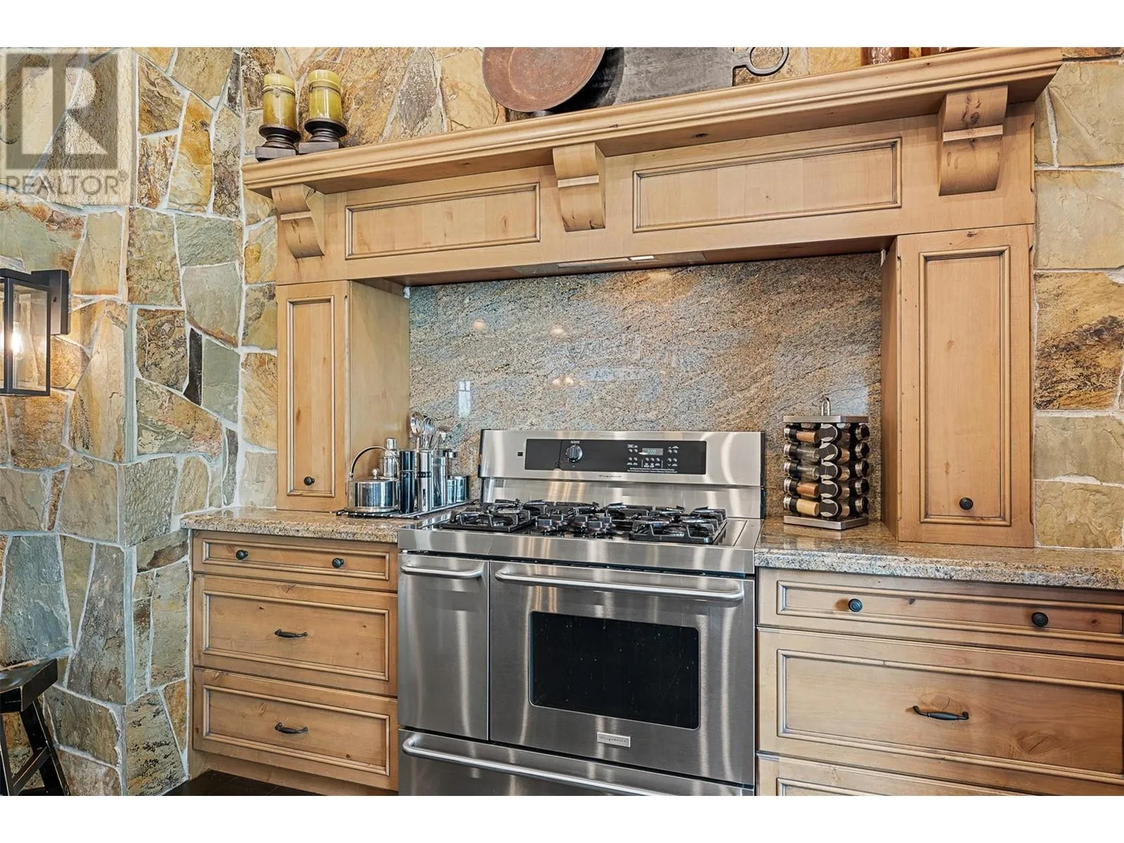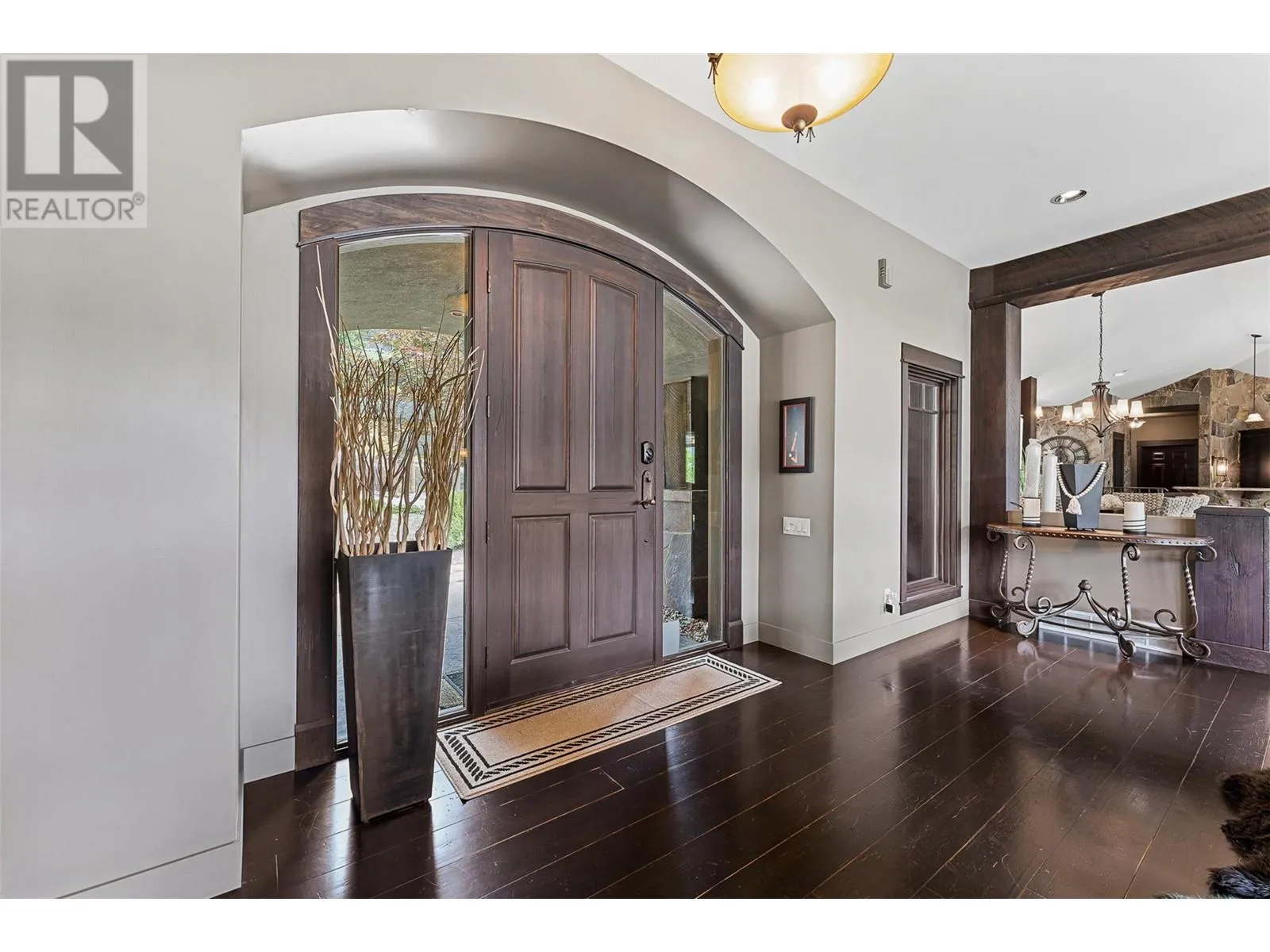 Set on 1.10 acres with panoramic lake views, this 4 bedroom, 4 bath walk-out rancher offers 3,725 sq. ft. of refined living space just steps from the Okanagan Rail Trail, Wood Lake, and Kalamalka Lake. Outdoor living is elevated with a covered upper deck featuring a vaulted ceiling, gas line, and a unique bridge design, plus a partially covered lower patio with dual access. Inside, natural materials and custom craftsmanship shine with vaulted ceilings, pine hardwood floors, floor-to-ceiling windows, and genuine stone details throughout. The chefâs kitchen boasts two islands (one with wine storage, one with seating), granite counters, and a built-in JennAir and Frigidaire appliances. The dining area opens to the deck, while the living room features a stone fireplace and floor to ceiling windows that frame the lake views. The primary suite is a true retreat with a fireplace, spa-inspired ensuite, and access to an outdoor shower. Downstairs offers a cozy recreation room, custom bar, and lakeview guest rooms. Additional highlights: 3-stall garage with granite-topped built-ins, custom entry door, built-in speakers, B&B license, and space for a pool. A rare opportunity for privacy, luxury, and adventure in the heart of the Okanagan. (id:27476)
