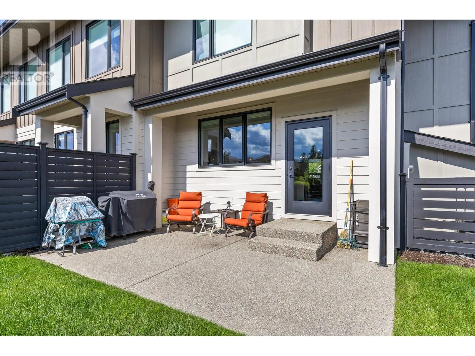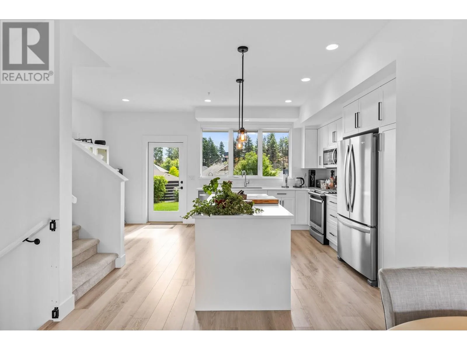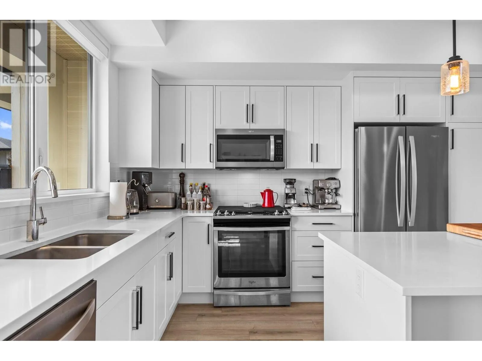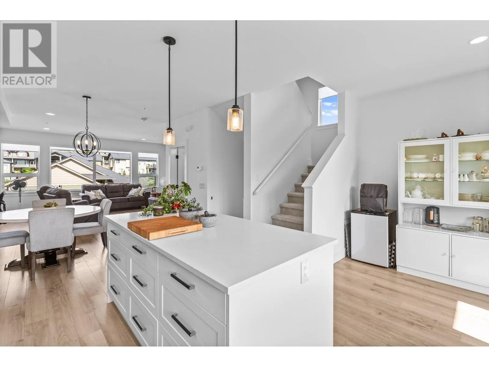 Bright & Modern End Unit in Rockridge at The Lakes. A vibrant and family/pet friendly townhome community in the heart of Lake Country. This stylish 3-bedroom + den/flex, 3-bathroom end unit offers the perfect blend of space, functionality, and comfort. Flooded with natural light, the main floor showcases a modern open-concept design with large windows throughout. The kitchen is a true highlight, featuring quartz countertops, a gas range, sit-up island, and cozy eating nook. The layout flows seamlessly into a spacious dining area and bright living roomâperfect for everyday living and entertaining. Step out from the kitchen to your private, elevated backyard oasis with panoramic Eastern Mountain views. With no units directly behind, youâll enjoy added privacy along with a gas hookup, power, and water connection. Upstairs youâll find three well-appointed bedrooms, including a generous primary suite with a 4-piece ensuite. The laundry is conveniently located on this level as well. The lower level adds valuable flexibility with a den/flex room â perfect for a home office, gym, or guest space. Additional features include a double car garage, a full-length 26 ft driveway that easily accommodates most vehicles, and close proximity to visitor parkingâmaking hosting friends and family a breeze. This home truly has it allâmodern comfort, unbeatable functionality, and a fantastic location. (id:27476)