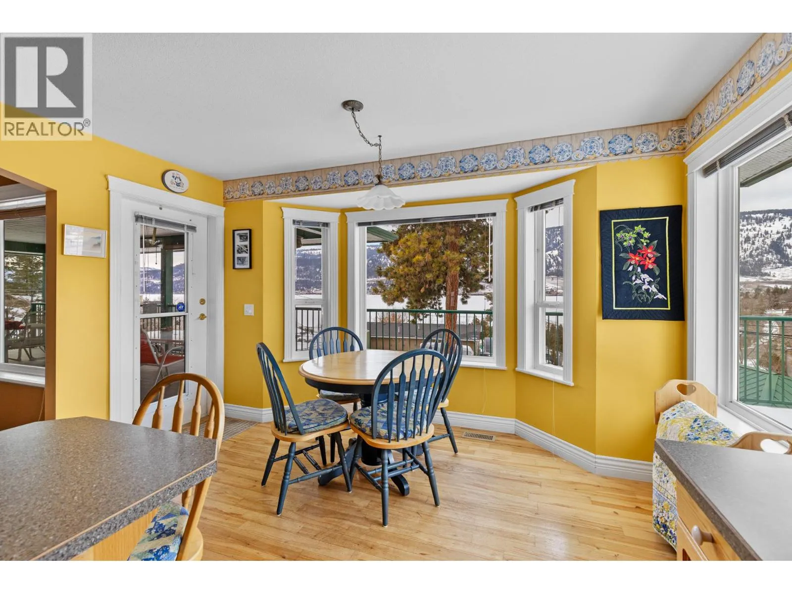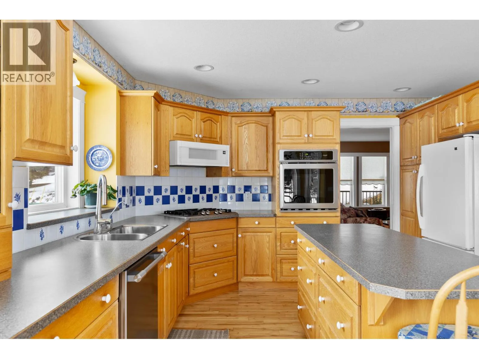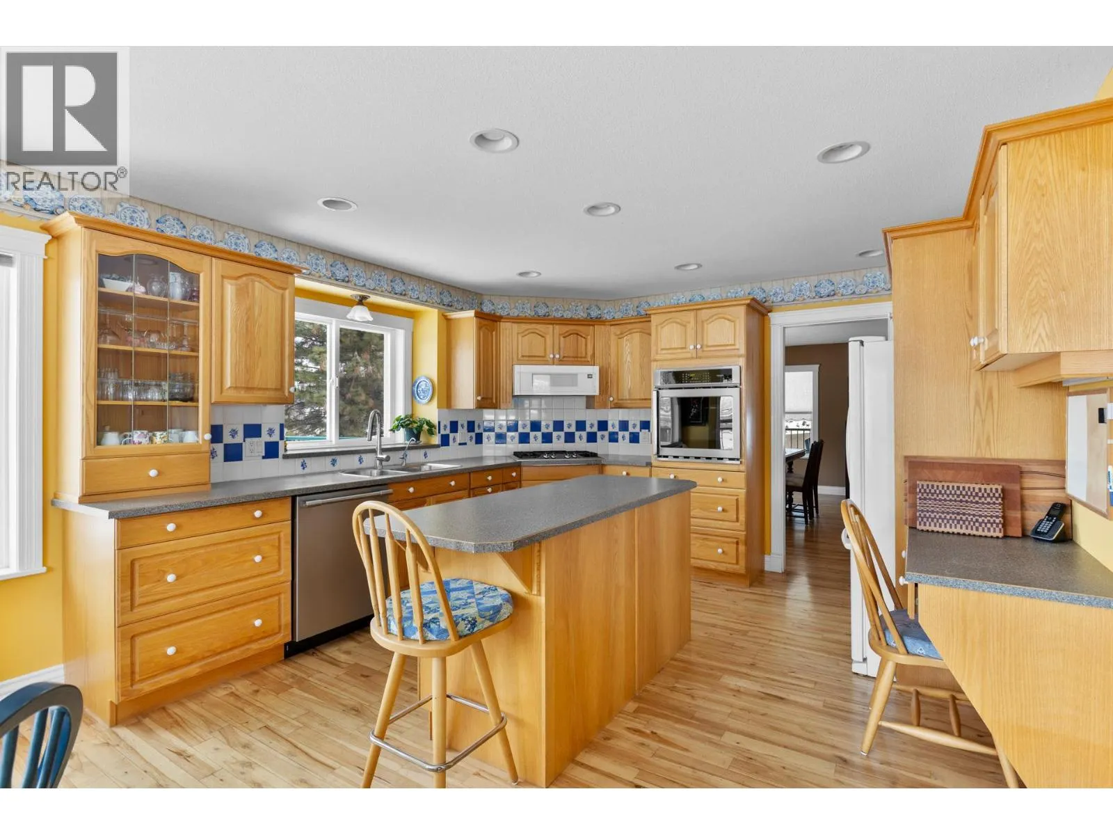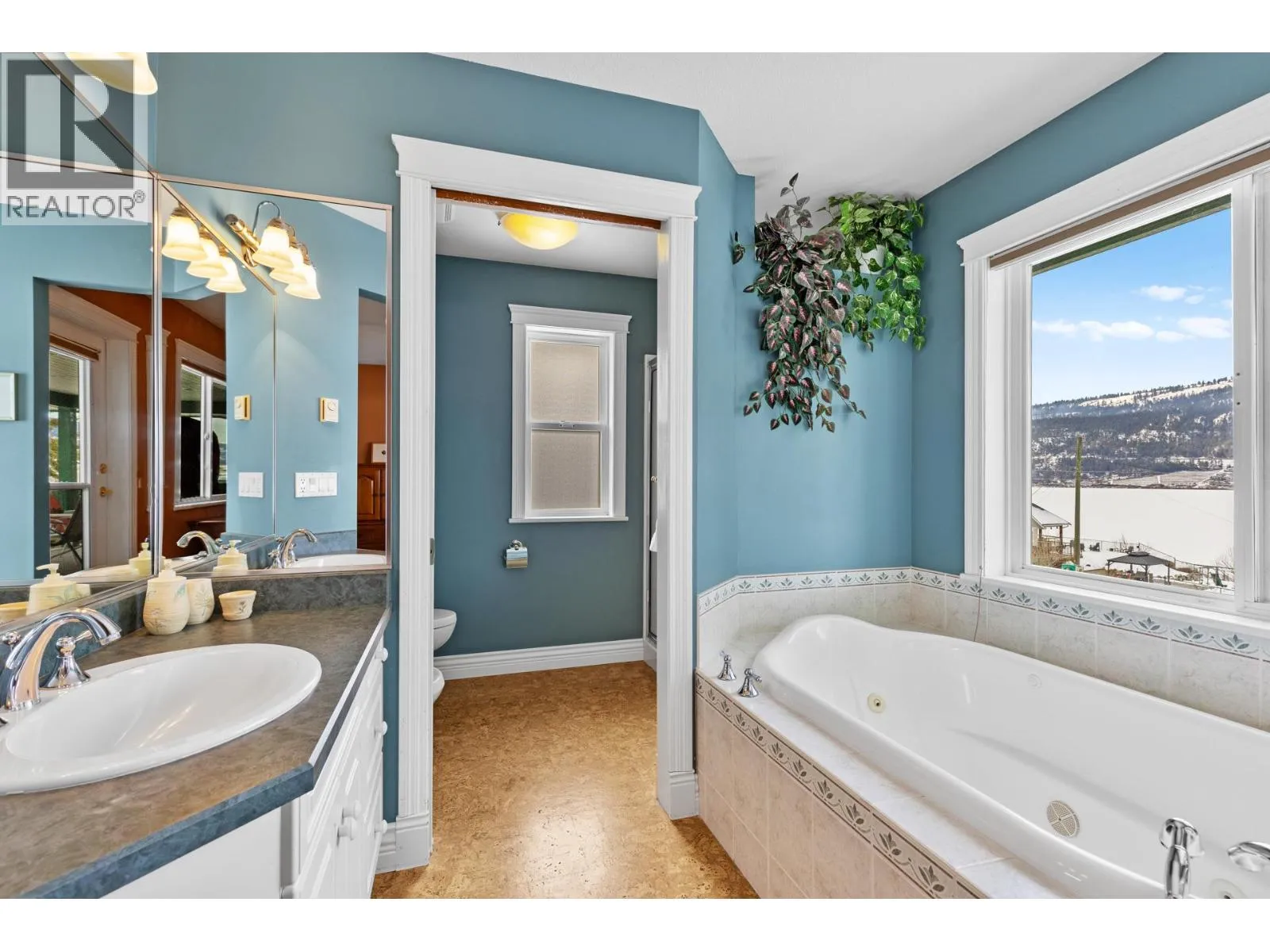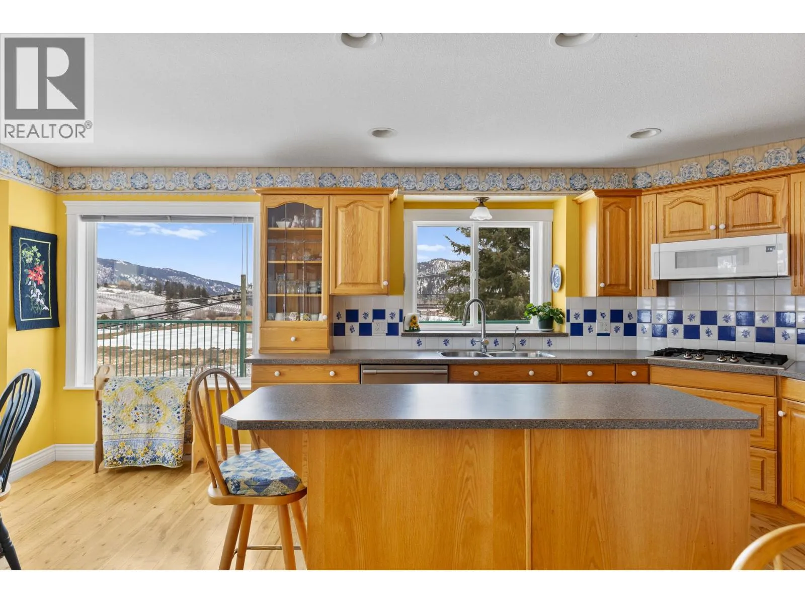 From the moment you arrive, you will be captivated by this charming property which is just steps from Wood & Kalamalka Lake. Set on a 0.618 corner acre lot, the home offers expansive mountain and great lake views all with elegant curb appeal. The thoughtfully designed wrap-around driveway welcomes you with a covered front porch and carport. A second driveway services the detached workshop and multiple garages, with ample parking for vehicles, a boat or an RV. Inside the residence built by Harmony Homes, you will find an expansive main floor featuring hardwood floors, as well as wide and accessible hallways and doorways. Enjoy the west facing deck off your main floor primary bedroom, wrapped beautifully around the kitchen for more entertaining space. Every detail has been considered for functionality and convenience, including a secondary entrance to turn this walk out basement into a one bedroom suite. The garage enters into the unfinished, spacious mechanical room and can easily be locked off for your own storage. Fenced in, irrigated yard offering a sanctuary of greenery and vibrant life. Mature ponderosa pines, fruit trees and grapevines create a stunning ambience, while a greenhouse and raised garden beds add to the propertyâs charm for gardening enthusiasts. The 80-amp heated workshop, includes wide-plank wood flooring, barn doors, an I-Beam and hot water on demand for the half bathroom. In proximity to boat launches, Kaloya Regional Park, the Okanagan Rail Trail and much more. (id:27476)