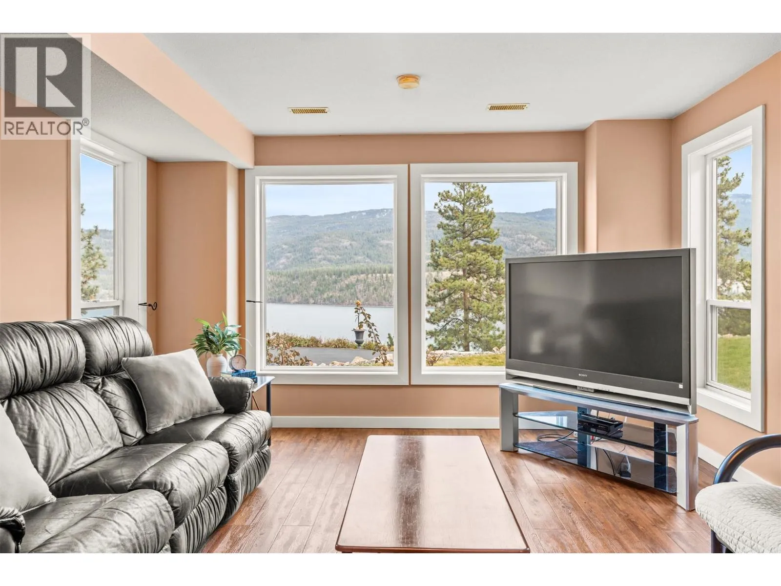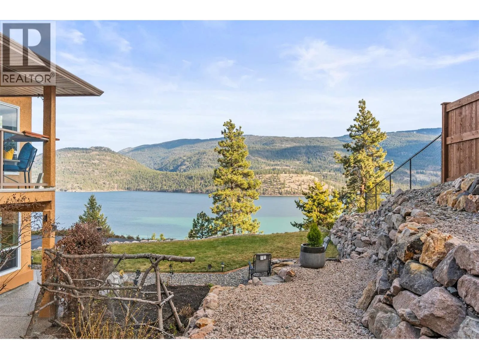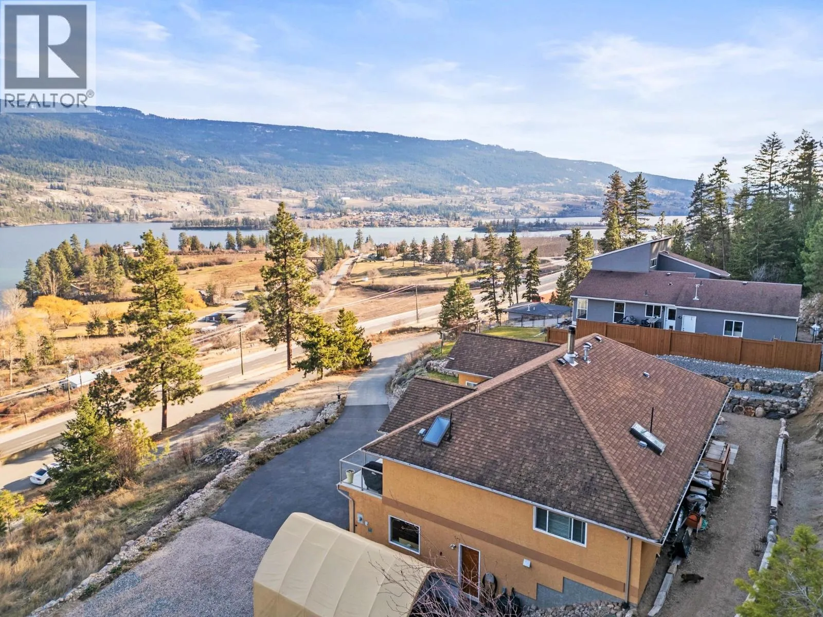 Perched on 5 acres in Lake Country, this beautifully maintained one-owner residence captures breathtaking panoramic views of Kalamalka Lake and offers a rare sense of privacy and tranquility. From the moment you arrive, the long driveway leads you into a welcoming grand foyer on the lower level, with laundry conveniently located nearby, along with a generous storage/workshop area directly off the double garage. The main living space offers an open and inviting layout, featuring a large kitchen that overlooks the family room with a cozy gas fireplace. The formal dining room and living room are framed by oversized windows, perfectly positioned to capture the stunning lake views. Step outside to a large sundeck off the dining room or enjoy the covered deck off the breakfast nookâideal for morning coffee or evening sunsets. The main level includes the primary bedroom with a 4-piece ensuite, also overlooking Kal Lake, plus two additional bedrooms and a full bathroom. A separate entrance leads to a self-contained one-bedroom in-law suite complete with kitchen, living room, bathroom, and beautiful views. For energy efficiency, the home is equipped with two furnacesâgas forced air with central air conditioning, plus an efficient wood-burning furnace. Outside, thereâs ample space for RV parking, storage, and outdoor enjoyment, including a front lawn area with a fire pit. Water is supplied through a private, licensed community co-op system with lake intake and gravity-fed distribution. (id:27476)