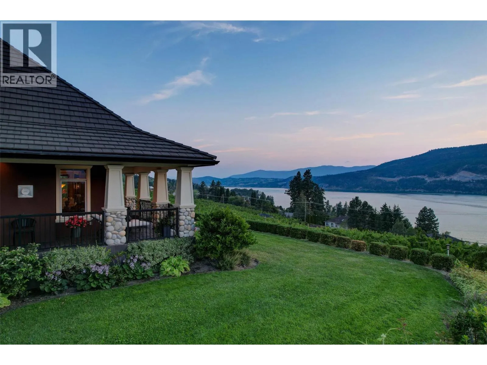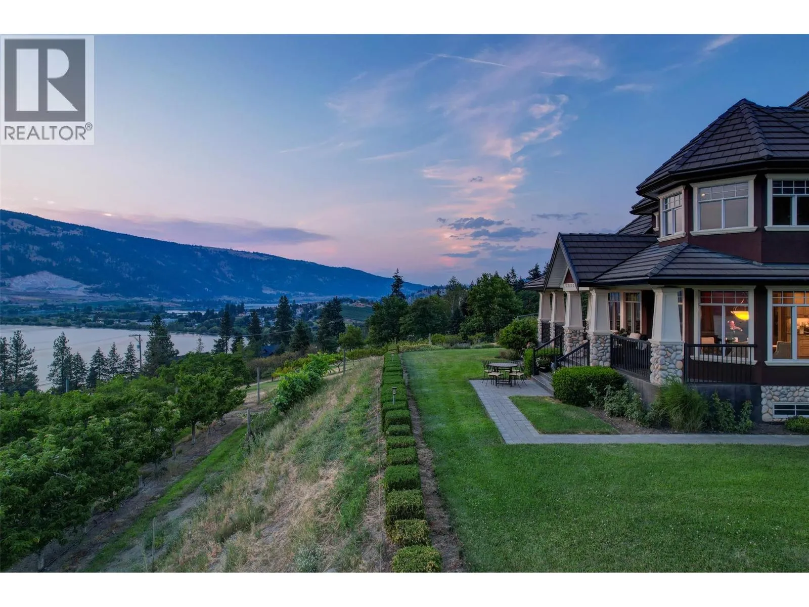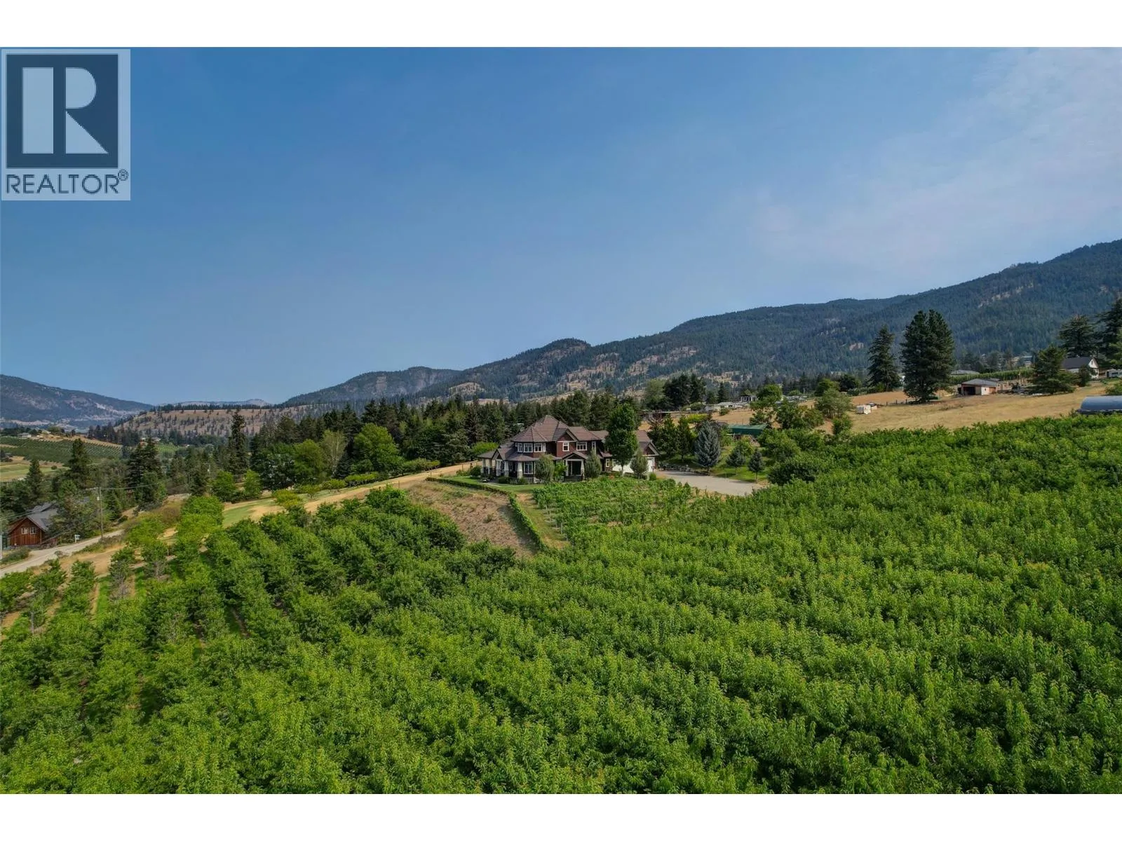 Welcome to an extraordinary custom estate offering over 6,200 square feet of refined living space. Perfectly positioned to capture expansive lake and mountain views, this one-of-a-kind property blends timeless architecture with the beauty and productivity of a thriving orchard. Set on seven manicured acres, the mature cherry orchard features approximately 3,500 Lapin, Staccato, and Centennial cherry trees, originally planted in 2003 and meticulously maintained, offering both lifestyle and income potential. Inside, craftsmanship and quality are immediately evident. Vaulted ceilings, solid wood-framed windows, and a statement fireplace anchor the main living space, while expansive windows frame the breathtaking views beyond. The gourmet custom kitchen is designed to impress, featuring commercial-grade stainless steel appliances, a gas range with pot filler, and a two-tier island ideal for entertaining and everyday living alike. The primary suite on the main level is a private retreat with direct access to the covered deck and views beyond. The spa-inspired ensuite includes dual sinks, a soaker tub, and a glass-encased shower, designed for relaxation and comfort. Upstairs, a loft area with a separate entrance and rough-in for a kitchenette offers excellent potential for a guest suite or B&B accommodation. The fully finished lower level adds versatility with a wine cellar, in-home gym (easily convertible to a media room), and abundant storage. Modern comforts include hot water on demand and thoughtfully designed systems throughout. Car enthusiasts will appreciate the triple attached garage, additional detached workshop for farm maintenance, and an oversized gated driveway with ample RV parking. Privately situated on a quiet road, yet just minutes to shopping, wineries, and schools, this exceptional estate offers the perfect blend of luxury living and agricultural opportunity in a truly breathtaking setting. (id:27476)