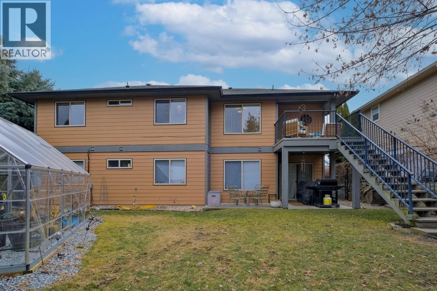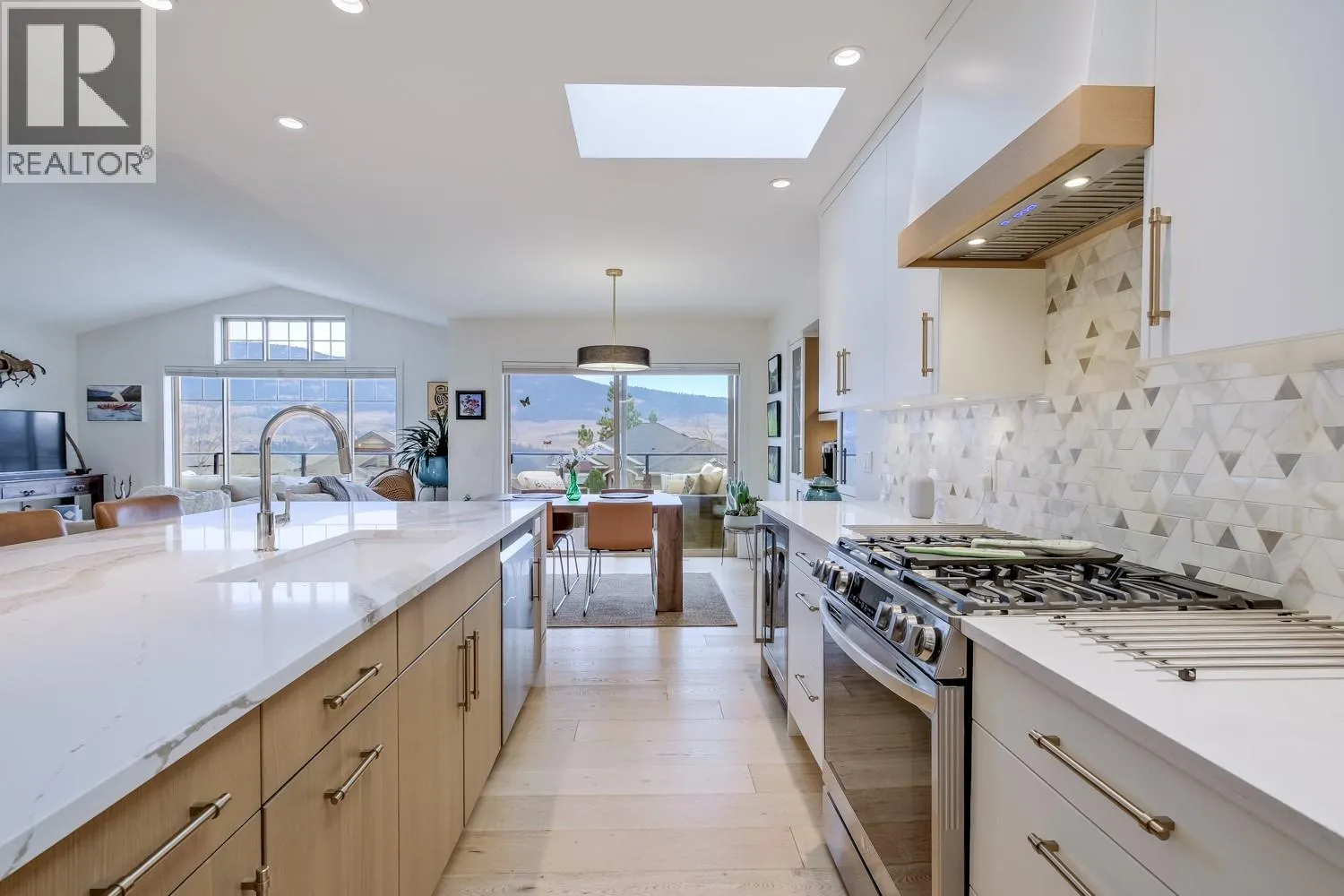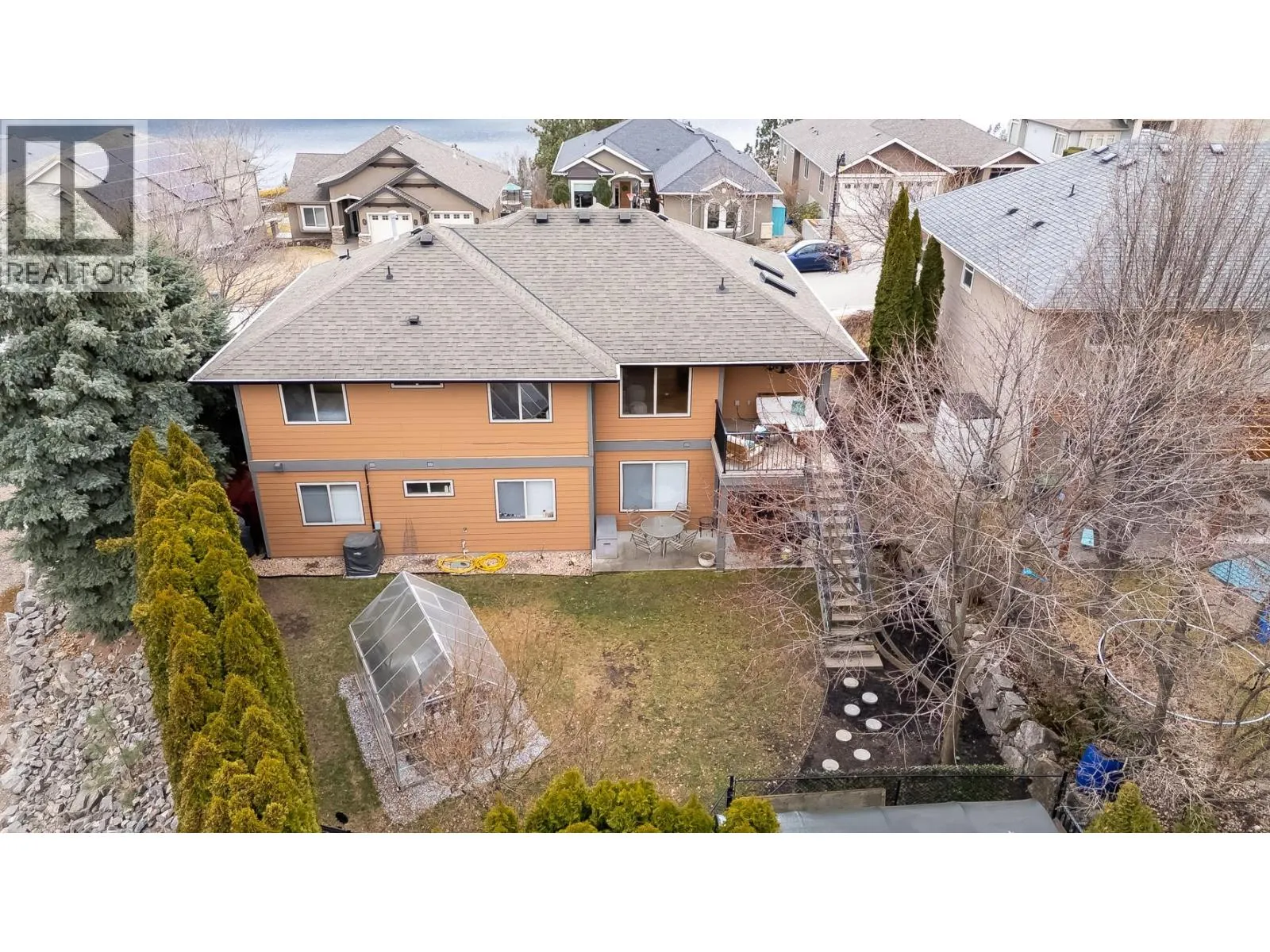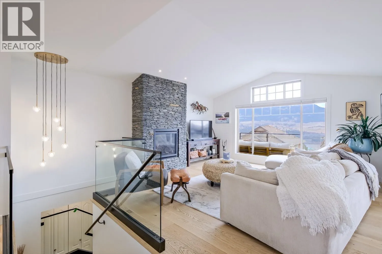 Beautifully updated home with vaulted ceilings and a bright open-concept main level, offering the perfect blend of style and functionality. The stunning kitchen renovation is the heart of the home, featuring custom cabinetry, all new appliances including a gas range and wine fridge, and an impressive 9' quartz waterfall island with abundant storage. The living area showcases the gorgeous oak hardwood, a striking stone gas fireplace, and dimmer lighting to create the perfect ambiance. Large windows fill the space with natural light, while new Hunter Douglas blinds with heat-blocking protection in the living room and primary bedroom enhance comfort and efficiency. Step outside to the front deck with peek-a-boo lake and mountain views, or enjoy the back deck with convenient stairs leading to the large private backyard, complete with a greenhouse (2025). The main home offers 3 beds/2 bath up, plus an additional bedroom on the lower level, providing flexible space for family/guests. A bright and spacious 1 bed suite with separate entrance offers excellent mortgage helper potential. This home has been thoughtfully maintained and upgraded, including new exterior paint (2024), gutter guards (2024), new water softener (2025), newer AC and hot water tank, and a freshly painted double garage (2025) with 220 power. The property also offers suite or RV parking for added convenience. A fantastic opportunity to own a move-in-ready home with income potential and beautiful surroundings! (id:27476)