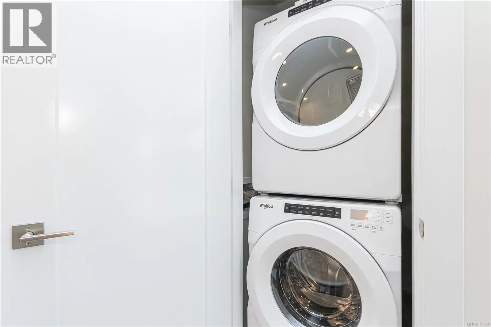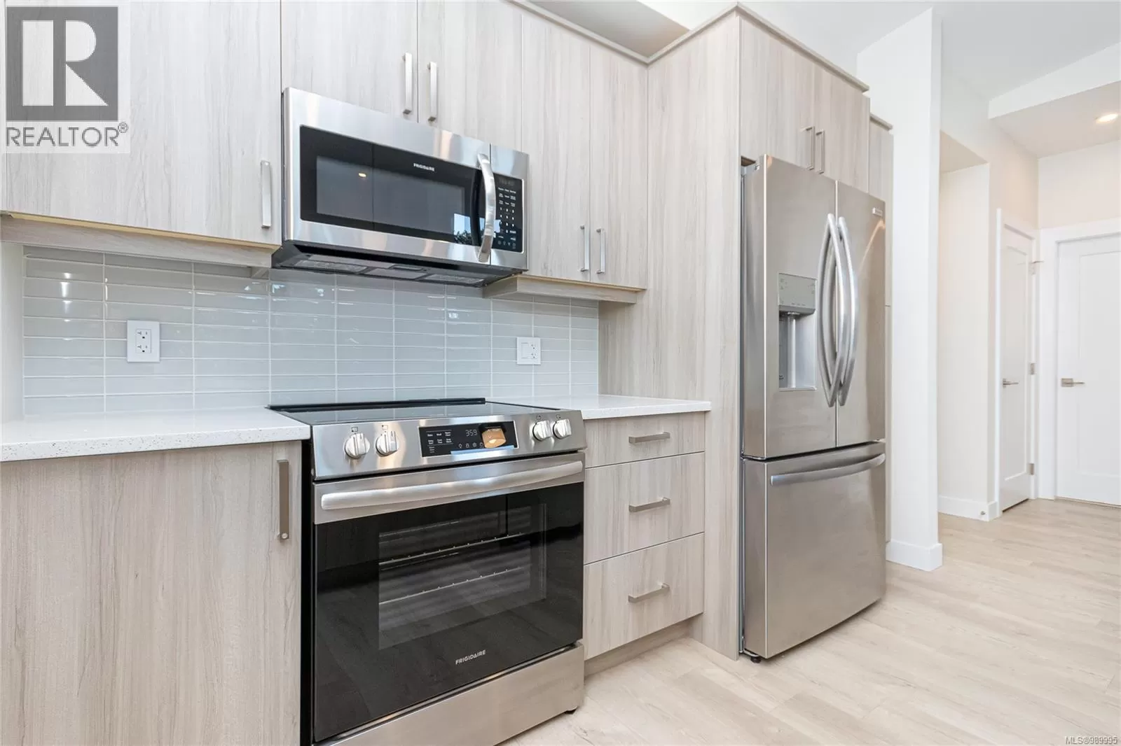 Discover top-floor living at its finest with soaring vaulted ceilings reaching over 12 feet in this exceptional home at Park Placeâa modern, boutique collection of just 24 high-quality residences now ready for you to move in. Tucked away on a quiet street yet steps from every convenience, this unbeatable location puts Belmont Market, Westshore Town Centre, Westhills, parks, cafés, and transit all within easy walking distance. What truly distinguishes Park Place is its rare focus on space and comfort. The thoughtfully designed two-bedroom suites average approximately 1,000 sq. ft., offering roomy layouts and large sundecks ideal for outdoor relaxation. Superior sound-mitigation construction enhances everyday privacy, creating a quiet, peaceful environment. Inside, the attention to detail is immediately evident. The beautifully appointed kitchen features quartz countertops, birch plywood cabinetry, under-cabinet lighting, and an upgraded stainless-steel appliance packageâall chosen for lasting quality and timeless style. A tiled entryway, durable laminate wood flooring, and an elegantly designed feature fireplace add warmth and sophistication throughout the living space. The building itself continues this commitment to thoughtful design, with a welcoming tiled foyer, secure interior storage lockers, and a fully fenced dog-run area for your four-legged family members. Practical features include secured, video-monitored parking and generous bike storage, providing convenience and peace of mind. With some pets and rentals permitted, Park Place is the perfect blend of lifestyle, flexibility, and exceptional construction quality, offering a standout opportunity in one of the Westshoreâs most desirable walkable locations. (id:27476)