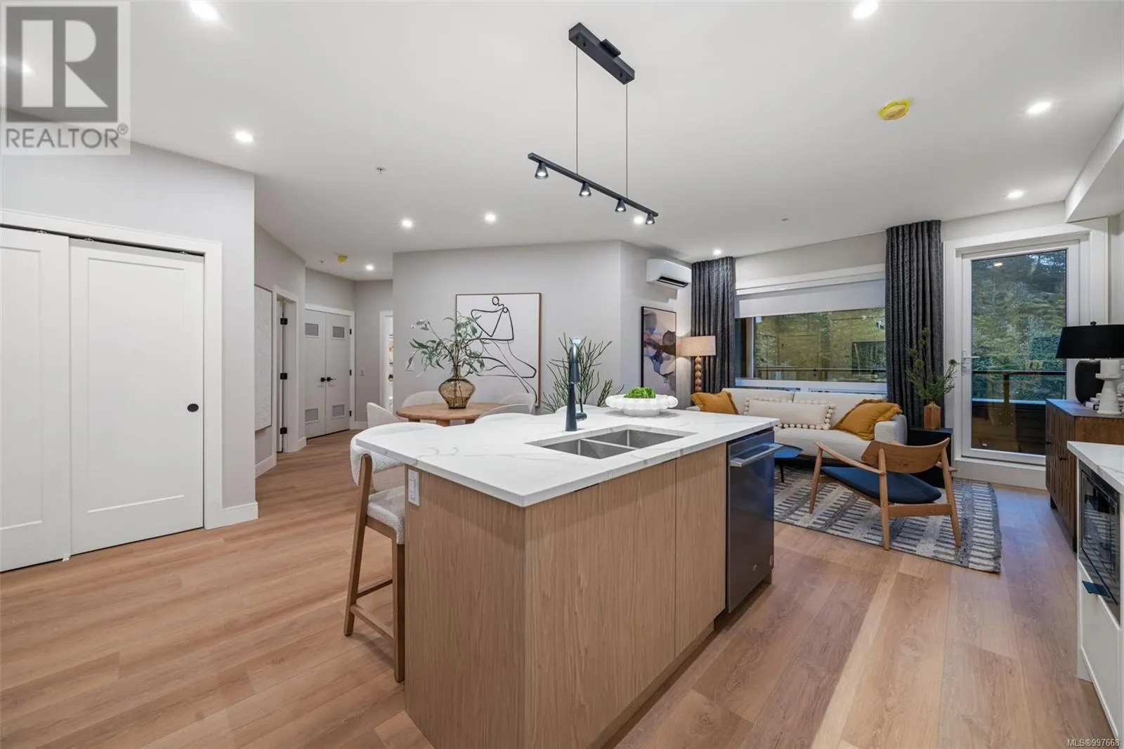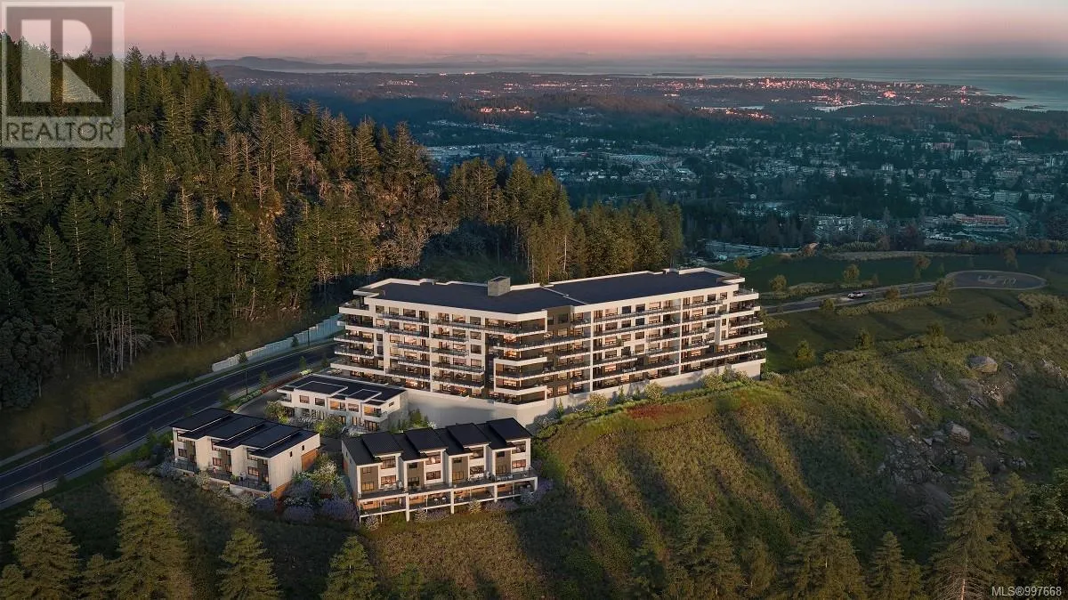 Now move-in ready! This spacious 2 bed 2 bath plus den condo is perfect for those looking for open-concept living with the flow of indoor & outdoor space. At 1100 square feet, this unique and thoughtfully designed floor plan includes a spacious den that is perfect for a home office or flex space. The dining area off the kitchen is great for entertaining friends or family dinner at home. Welcome to The Ridge at Vista Point, where breathtaking views of the Juan De Fuca Strait, the Olympic Mountains, downtown Victoria, and the Sooke Hills define luxury living. Nestled serenely on the south side of Skirt and Bear Mountain, this exquisitely designed complex offers some of the largest floor plans on the market, with oversized outdoor areas that are perfect for entertaining. Each residence includes a secure underground parking space, storage locker, multi-head ductless heat pump for efficient heating and cooling, a gas cooktop, high-quality vinyl flooring, and quartz countertops throughout. Building amenities feature a state-of-the-art gym, community gardens, bike wash, dog wash, and outdoor patio for lounging. Residents enjoy access to Bear Mountain's world-class offerings, including two championship golf courses, an exclusive gym and pool, fine dining, scenic hiking trails, and more. Conveniently located with easy access to the TC1 highway and just minutes from essential amenities, The Ridge at Vista Point provides unparalleled luxury living. Show Home open Saturdays from 1-3pm or call your realtor today to book a showing! (id:27476)