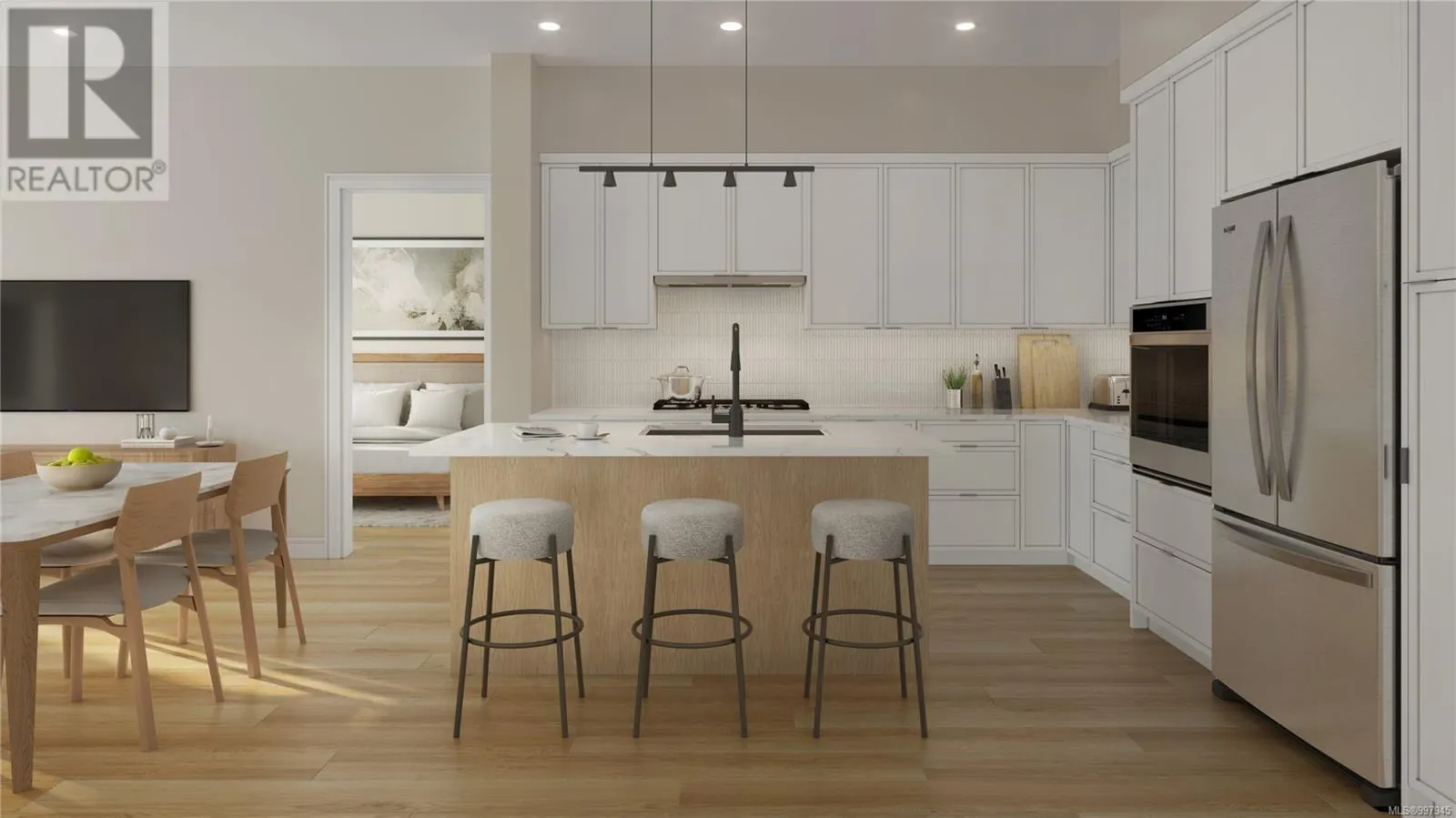 Now move-in ready! This stunning 2-bedroom plus den corner home offers over 1,100 sq. ft. of thoughtfully crafted living space, complemented by an expansive ~900 sq. ft. patio with breathtaking mountain views. Elevated by an upgraded package, this home boasts premium Fisher & Paykel appliances, in-floor radiant heating in the ensuite, and a sleek quartz backsplash in the kitchen. Enjoy the perfect blend of indoor and outdoor living in this luxurious retreat. Welcome to The Ridge at Vista Point, where breathtaking views of the Juan De Fuca Strait, the Olympic Mountains, downtown Victoria, and the Sooke Hills define luxury living. Nestled serenely on the south side of Skirt and Bear Mountain, this exquisitely designed complex offers some of the largest floor plans on the market, with oversized outdoor areas that are perfect for entertaining. Each residence includes a secure underground parking space, storage locker, multi-head ductless heat pump for efficient heating and cooling, a gas cooktop, high-quality vinyl flooring, and quartz countertops throughout. Building amenities feature a state-of-the-art gym, community gardens, bike wash, dog wash, and outdoor patio for lounging. Residents enjoy access to Bear Mountain's world-class offerings, including two championship golf courses, an exclusive gym and pool, fine dining, scenic hiking trails, and more. Conveniently located with easy access to the TC1 highway and just minutes from essential amenities, The Ridge at Vista Point provides unparalleled luxury living. Show home open Saturdays from 1-3pm. Hard hat tours available by appointment only, visit our Vista Point website for more information. (id:27476)