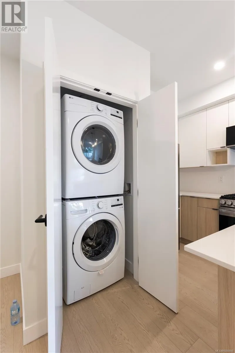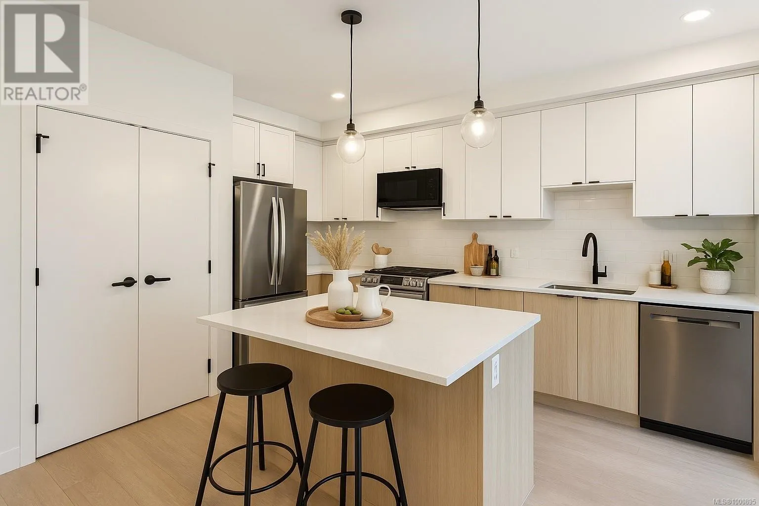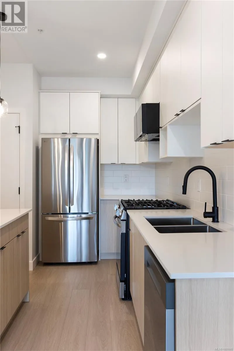 This stylish and efficient 1 bed / 1 bath 561 sq ft condo smartly laid-out interior space, plus a 42 sq ft patioâideal for relaxing or entertaining on warm days. Inside, natural light beams through complementing the contemporary finishes and bold matte black accents. The kitchen is equipped with quartz counters, modern two-tone cabinetry, and premium LG stainless steel appliances.Bonus heat pump for extra comfort. Peace of mind having a secured parking spot.Residents can enjoy access to a beautifully landscaped common area with green space, gas fire pits, BBQs, seating areas, and a playground. Perfectly situated in central Langford, youâre just moments away from schools, parks, trails, lakes, and all the shopping and dining you need. (id:27476)