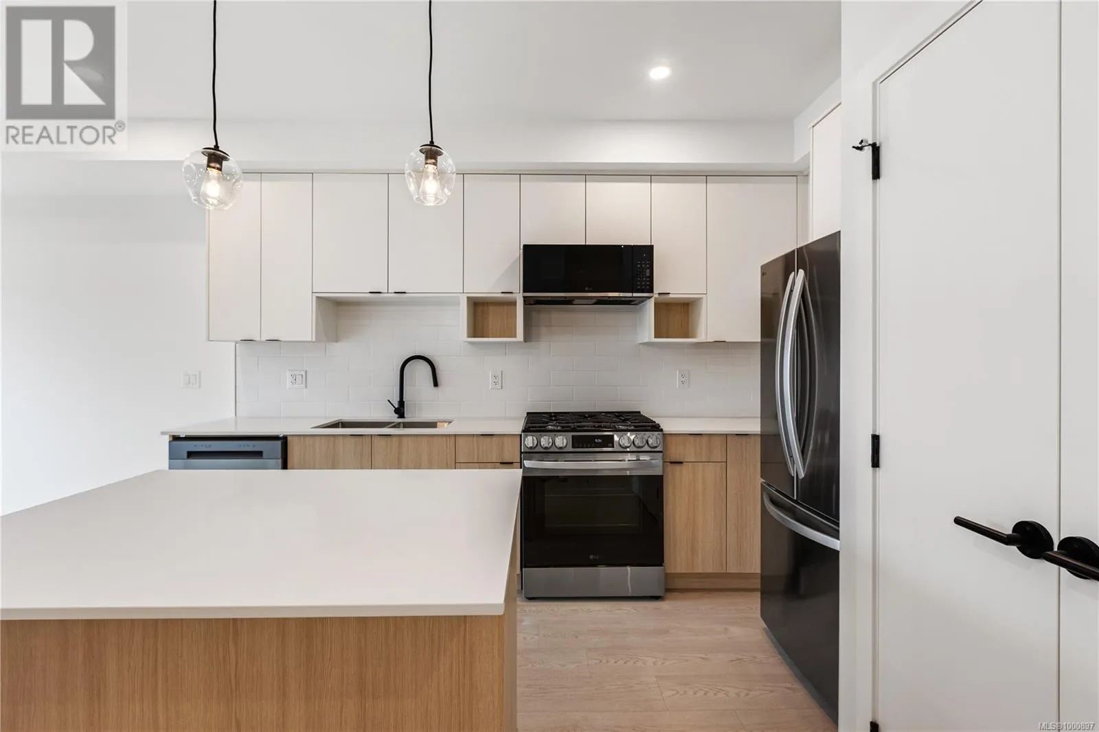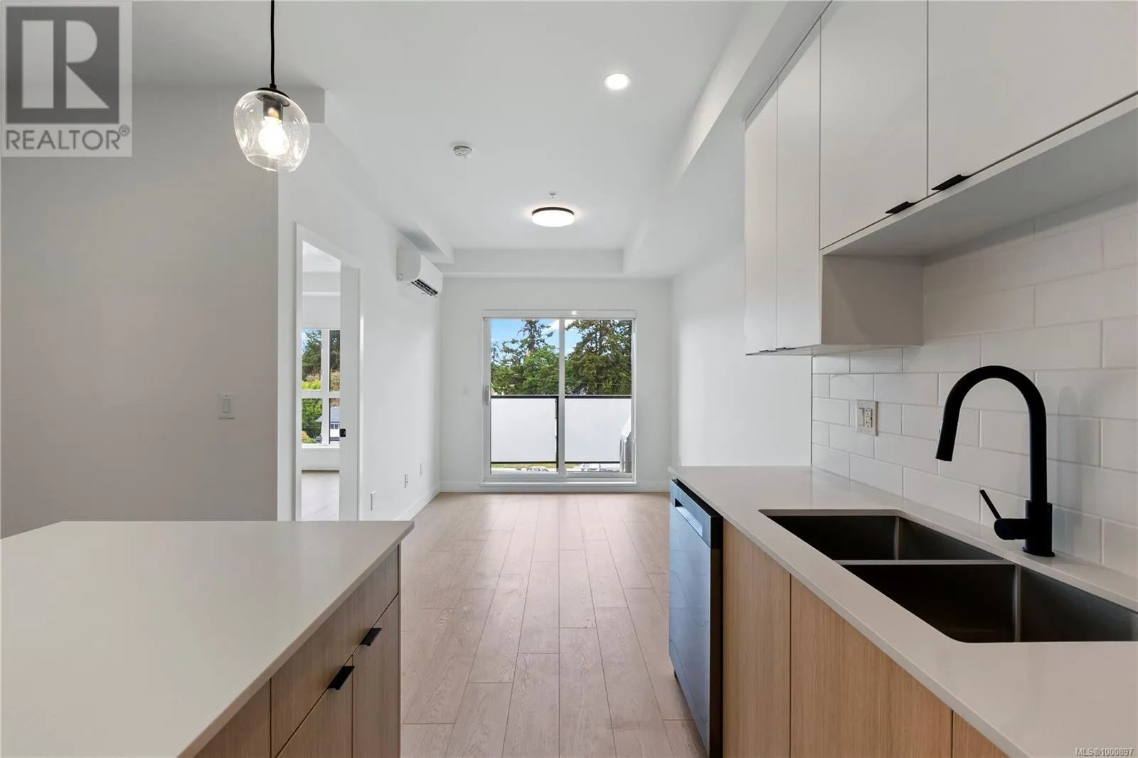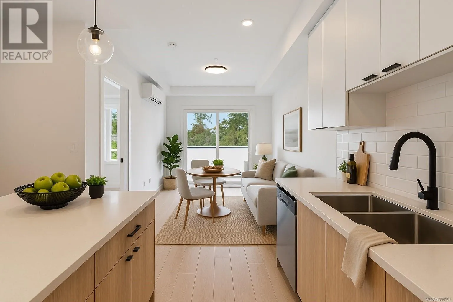 This thoughtfully designed 1 bed, 1 bath condo offers 564 sq ft of efficient living space, complemented by a 42 sq ft private patio ideal for outdoor enjoyment. Contemporary interiors feature an abundance of natural light, matte black accents, stylish fixtures, and a heat pump for year-round comfort. The modern kitchen is equipped with quartz countertops, two-tone cabinetry, and premium LG stainless steel appliances. A secured underground parking stall is included. Residents enjoy access to beautifully landscaped common areas complete with green space, gas fire pits, BBQs, seating areas, and a playground. Ideally located in central Langford, close to schools, parks, trails, lakes, and major amenities. (id:27476)