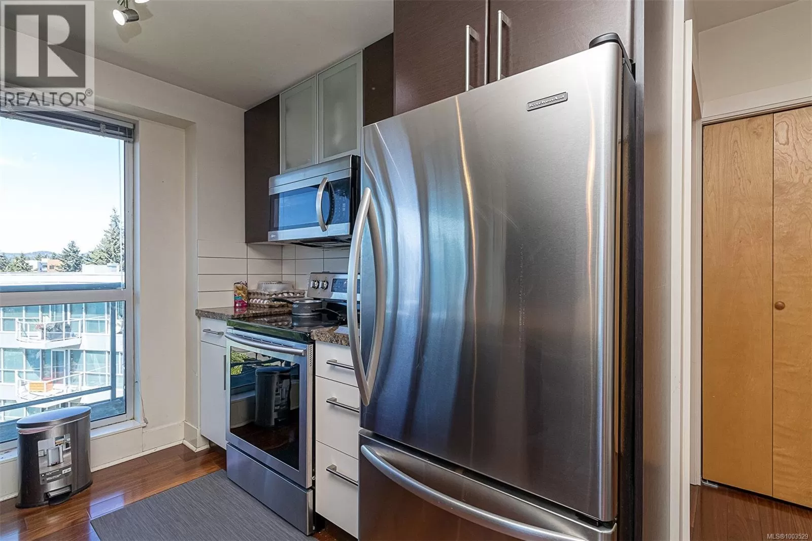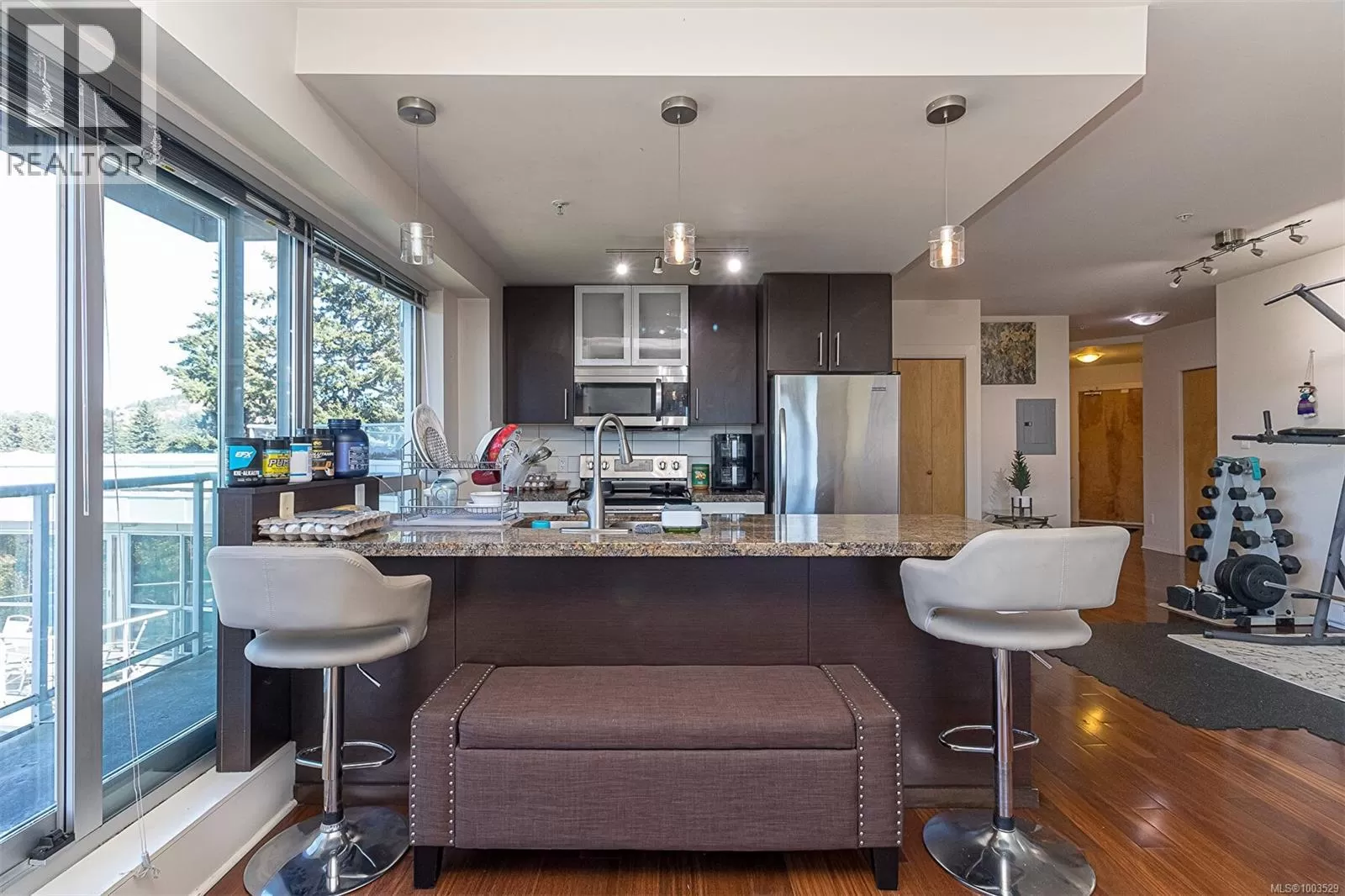 Beautiful and Spacious 2 bedrooms, 2 bathrooms, 2 parking spots, with around 1000 SQFT of living space and in great conditions. This spacious and bright condo is on the 6th floor with an easy elevator access to the unit and rooftop patio. It has stunning views throughout. Great open plan living, lots of natural lights, engineered hardwood floors, floors to ceiling windows, Spacious balcony, all appliances included, new high quality washer and dryer, H20 tank, granite counters, storage locker underground, 1 indoor and 1 outdoor parking, rooftop swimming pool and running track, with a nice seating and barbecue area overseeing the mountains of Langford. Close to all amenities, in the heart of Langford, near the RCMP detachment, few blocks away from the highway and Costco. This move-in ready is fully rentable, family-friendly unit is in pristine condition that ticks all boxes of any prudent Buyer. (id:27476)