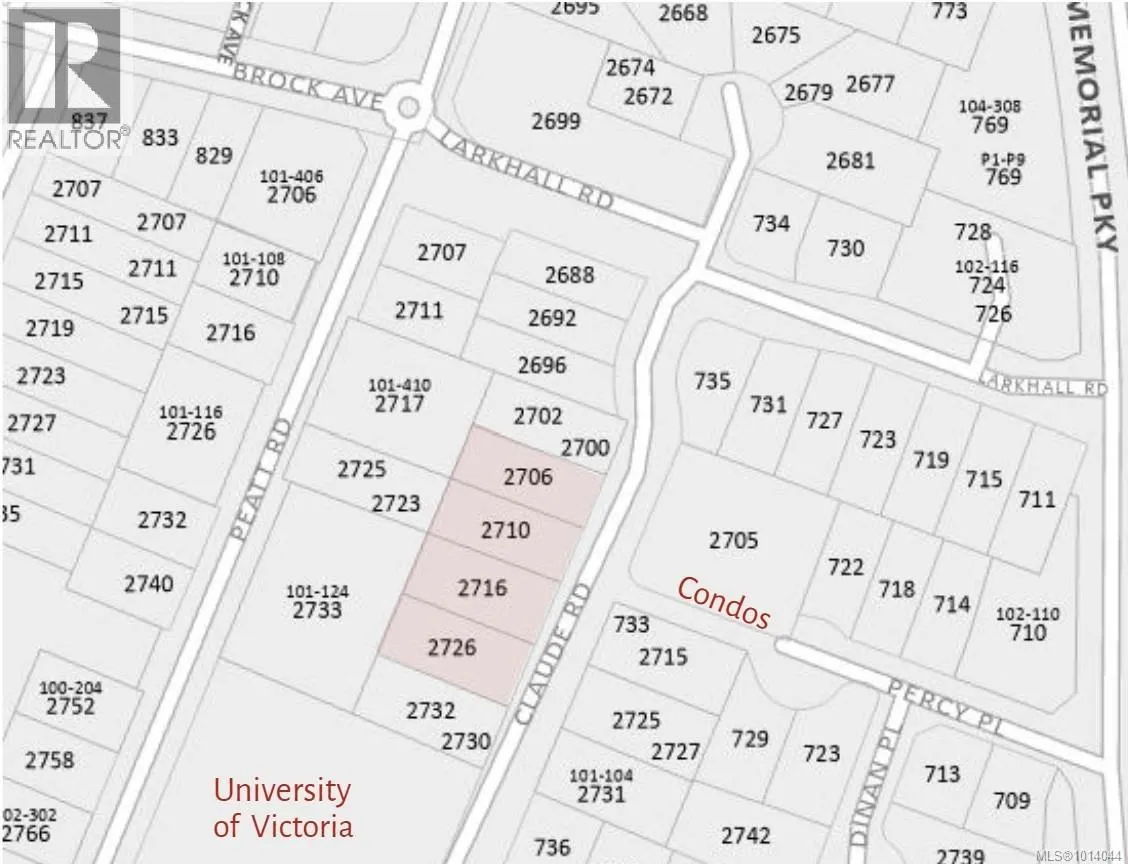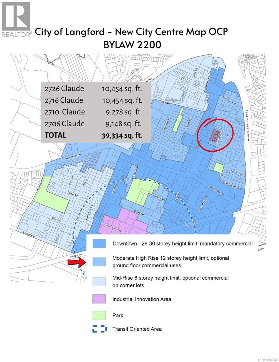 Exceptional DEVELOPMENT OPPORTUNITY A rare land assembly in Langfordâs thriving City Centre, offering developers the chance to capitalize on one of the regionâs most dynamic growth stories. 2706, 2710, 2716 & 2726 Claude Road together form an assembly of approx. 36,000+ sq. ft. With the adoption of the new City Centre Official Community Plan in June 2025, this area is designated âModerate High-Rise,â permitting buildings up to 12 storeys with optional ground-floor commercial. This significant policy update reflects Langford Councilâs vision for a vibrant, walkable, transit-oriented downtown where housing, services, and employment spaces converge. The Claude Road site is strategically located steps to shops, restaurants, schools, and major transit routes, while also being close to the University of Victoriaâs planned Langford expansion and recreational amenities. Langford remains one of the fastest-growing communities in British Columbia, attracting families, professionals, and retirees drawn by its affordability, quality of life, and bold urban vision. For developers, the opportunity is clear: four contiguous lots with confirmed lot sizes, clean assembly potential, and City Centre zoning already in place. With interest rates expected to decline and demand for new housing continuing to rise, this is a timely acquisition with excellent upside - position your project at the centre of Langfordâs future growth. (id:27476)