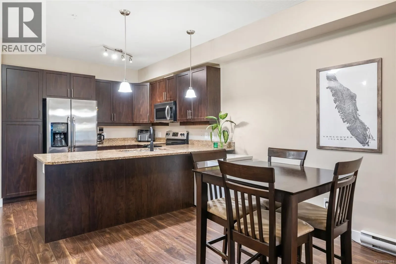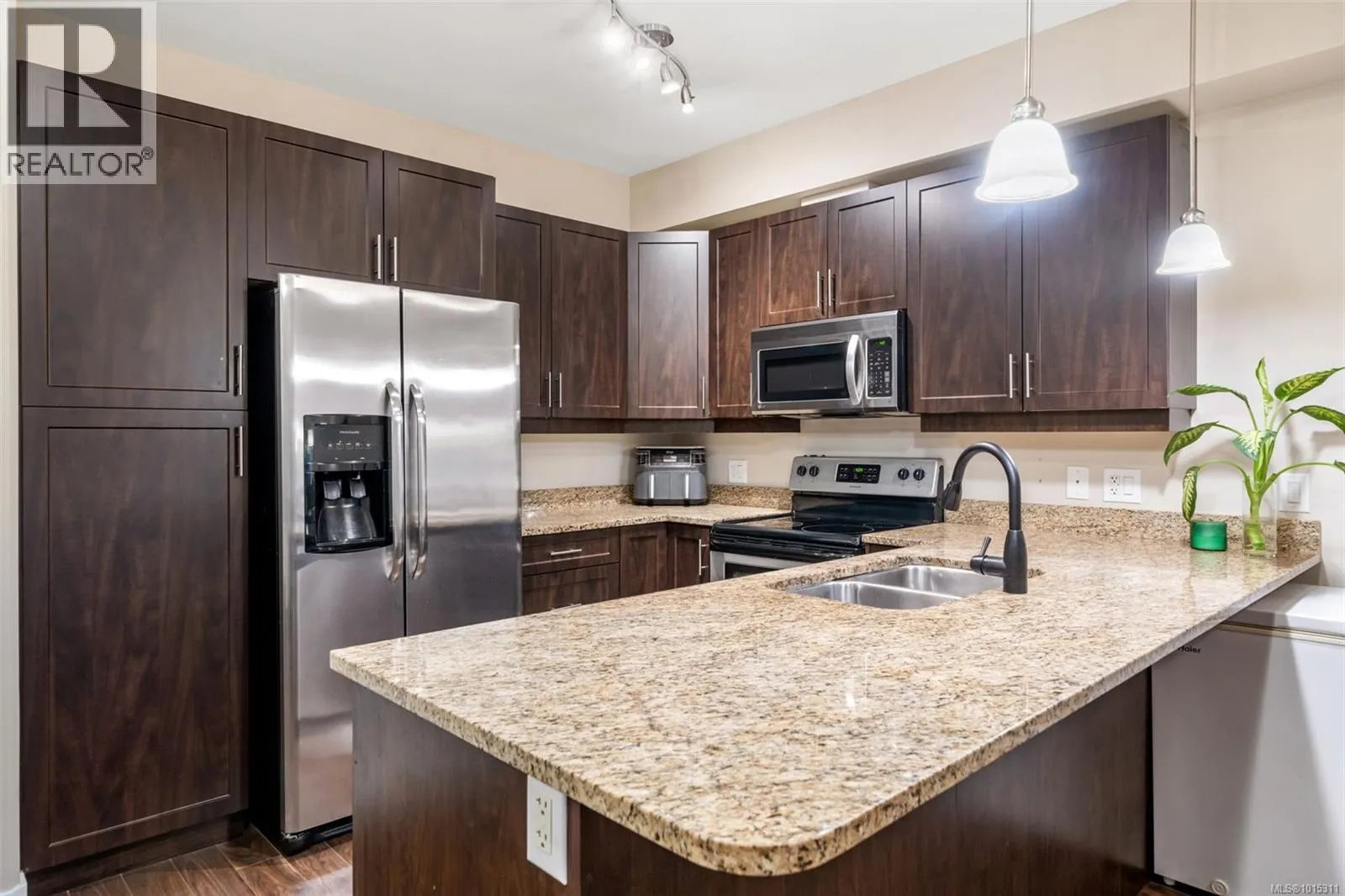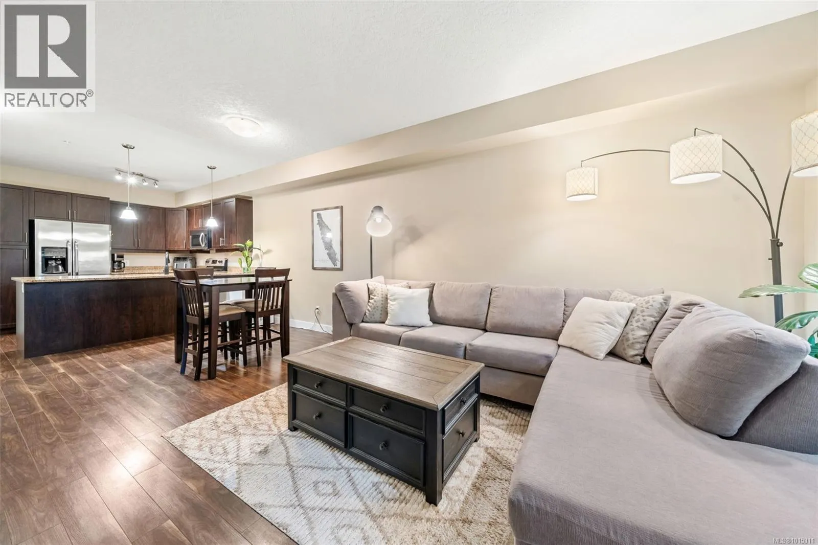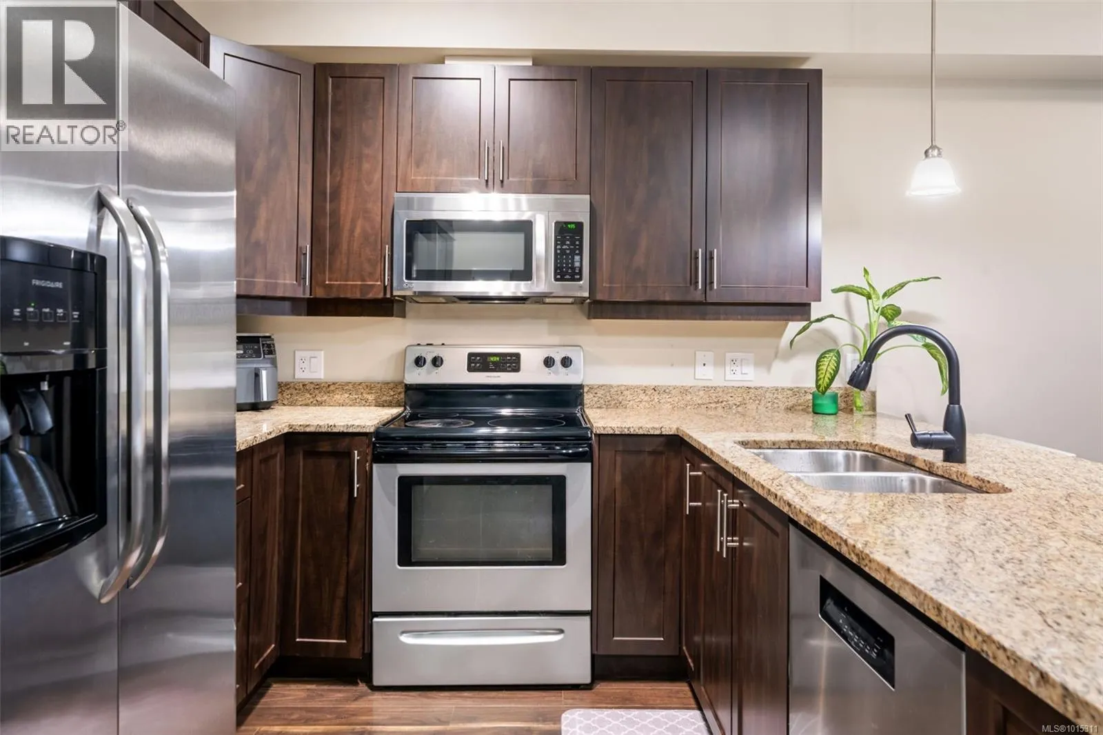 Welcome to Doma Living! Rarely available, this is the largest floor plan in the complex. Located on the quiet side of the building, step inside and be greeted by an open-concept entry that immediately feels like home. The kitchen boasts abundant cabinetry and counterspace, while the spacious living and dining areas are perfect for entertaining or relaxing. The balcony features a convenient gate with access to the grassy yard, perfect for dog lovers (up to 2 dogsâno size restriction)! The oversized primary bedroom is a true retreat, offering ample space for a king-size bed, with a walk-thru closet to the ensuite, while the second bedroom is ideal for a guest room or home office. A main bath off the entrance keeps flow and separation. Recent updates include an LG WashTower (2024) and brand new hot water tank (Sept 2025). Secure underground parking and storage included. Steps from shops, restaurants, transit, and close to the newly opened Camosun College and Royal Roads University campus! (id:27476)