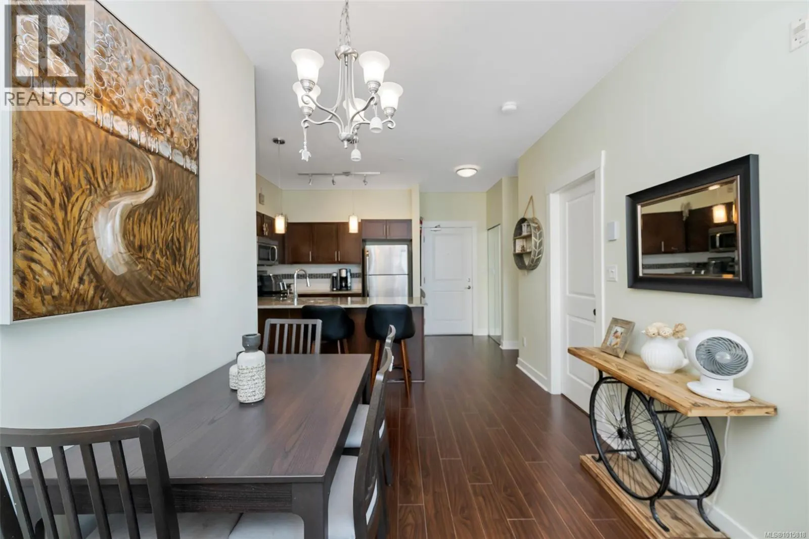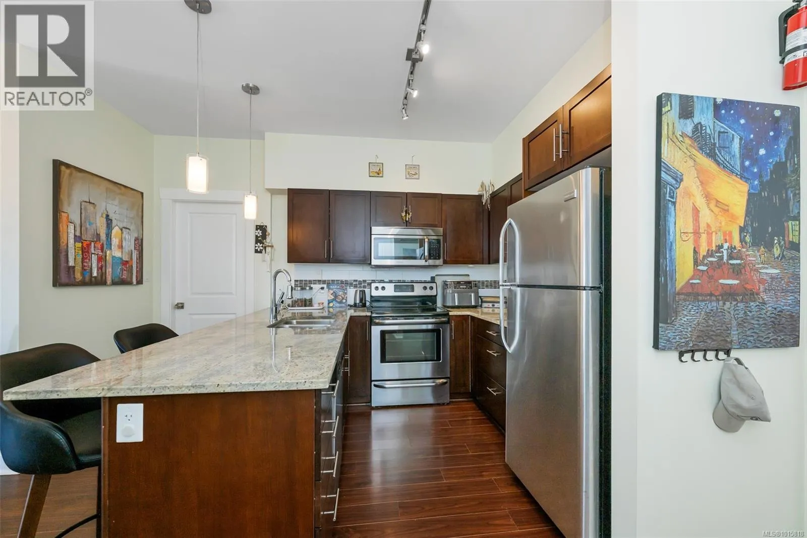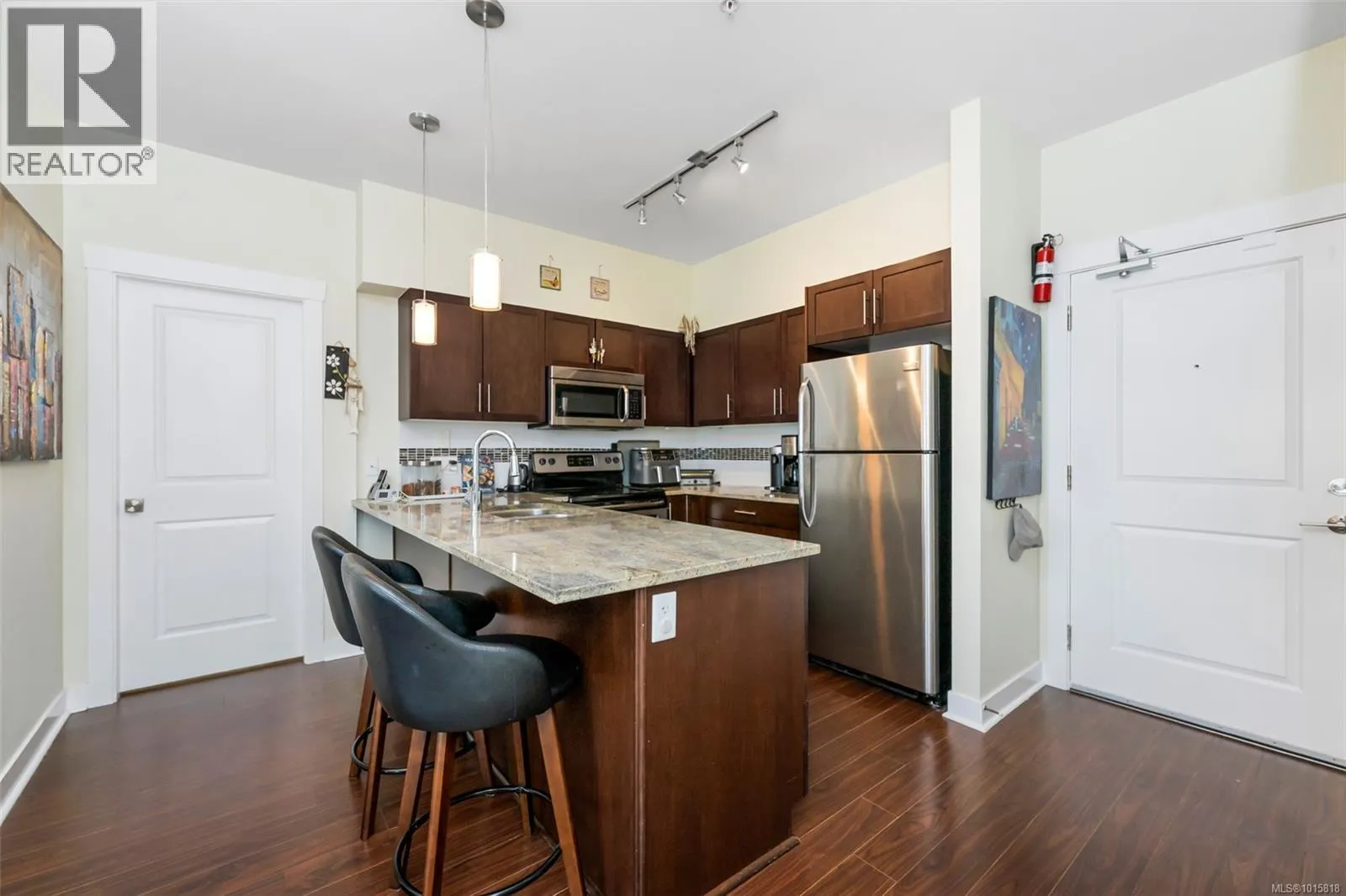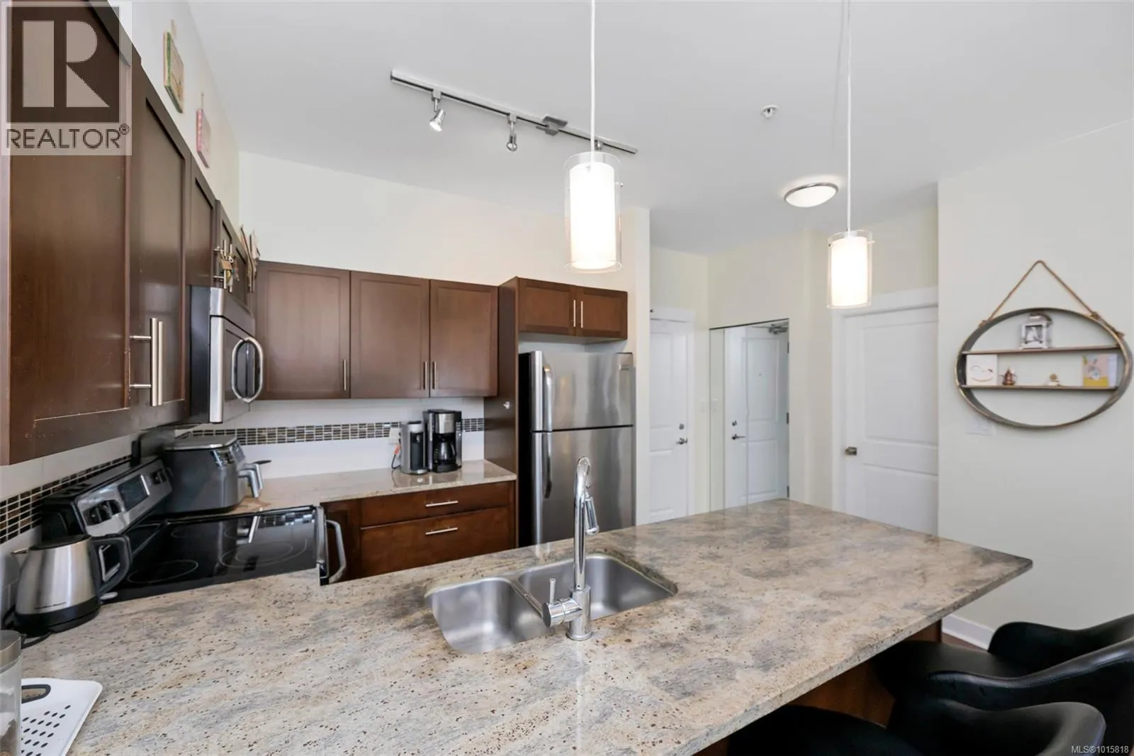 Welcome to top-floor living at The Granderson! This immaculate 2-bed, 2-bath suite offers a bright, open layout perfect for modern living. The kitchen shines with granite countertops and an eating bar, flowing seamlessly to a living area and sundeck overlooking Bear Mountain. The smart floor plan separates the bedrooms for maximum privacy. Your backyard is the famous Galloping Goose trail, and you're just a stroll away from the Royal Colwood Golf Course and the heart of downtown Langford. This central location puts you minutes from Westshore Town Centre, dining, and parks. The building is pet-friendly, rental-friendly, and allows BBQs. Secure underground parking and a separate storage locker complete this perfect package. Don't miss this fantastic opportunity for investors or first-time buyers! (id:27476)