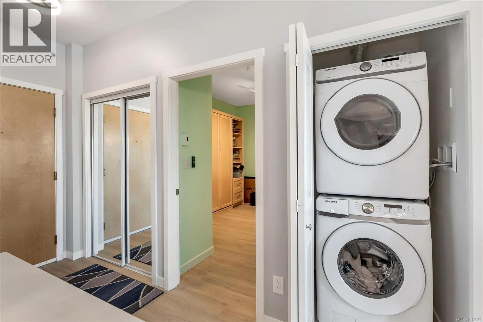 Bright and beautiful 2 bed, 2 bath condo in Pacific Trilogy Twoâa modern 6-storey building in the heart of downtown Langford. This like new home features a functional open-concept layout with 9-ft ceilings, a chefâs kitchen with quartz countertops and stainless appliances, and spacious living/dining areas with an electric fireplace and access to a sunny balconyâperfect for your morning coffee. The primary bedroom includes a 3-piece ensuite with built-in closet organizers. Comfort is ensured year-round with an efficient heat pump offering heating and air conditioning. Additional owner upgrades include heated tile floors in both bathrooms, custom Murphy bed, fresh paint, updated tile work, Lutron smart switches, and new LED lighting. Secure parking included with E/V rough in. This award-winning, pet-friendly building also offers a fitness centre, bike storage, and a 91 Walk Score -just minutes to shopping, restaurants, parks, and recreation. Vacant and available for immediate possession. (id:27476)