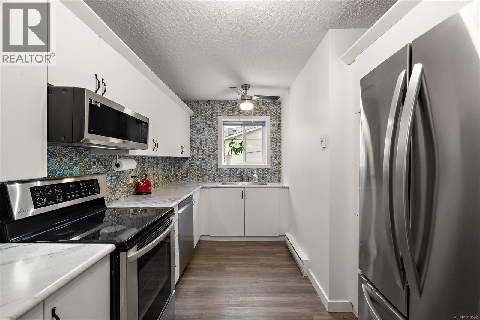 Welcome to this bright and inviting 3-bedroom, 2-bathroom townhome ideally located in the heart of Langford. Walk to your favorite coffee shops, local parks, shopping, schools, and the new university campusâall just minutes from your door. The main level offers an open-concept layout with a modernized kitchen, updated finishes, and a comfortable living and dining area. Upstairs, youâll find three spacious bedrooms, perfect for growing families or a home office setup.Enjoy your large patio for summer barbecues or morning coffee, along with parking and a well-managed, family-friendly complex. With move-in-ready comfort and unbeatable walkability, this home is an ideal choice for first-time buyers and young families looking to enjoy all that Langford has to offer. (id:27476)