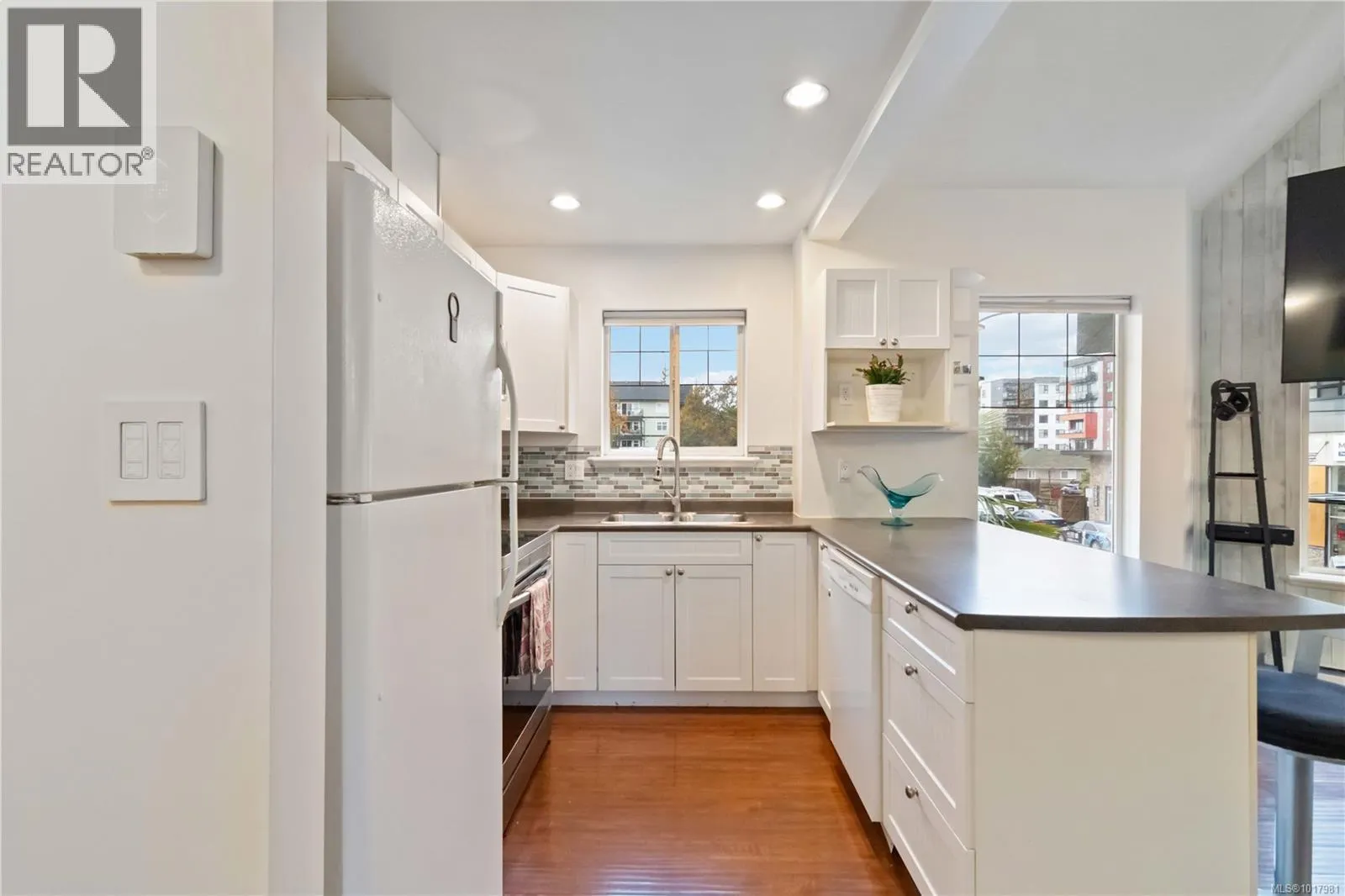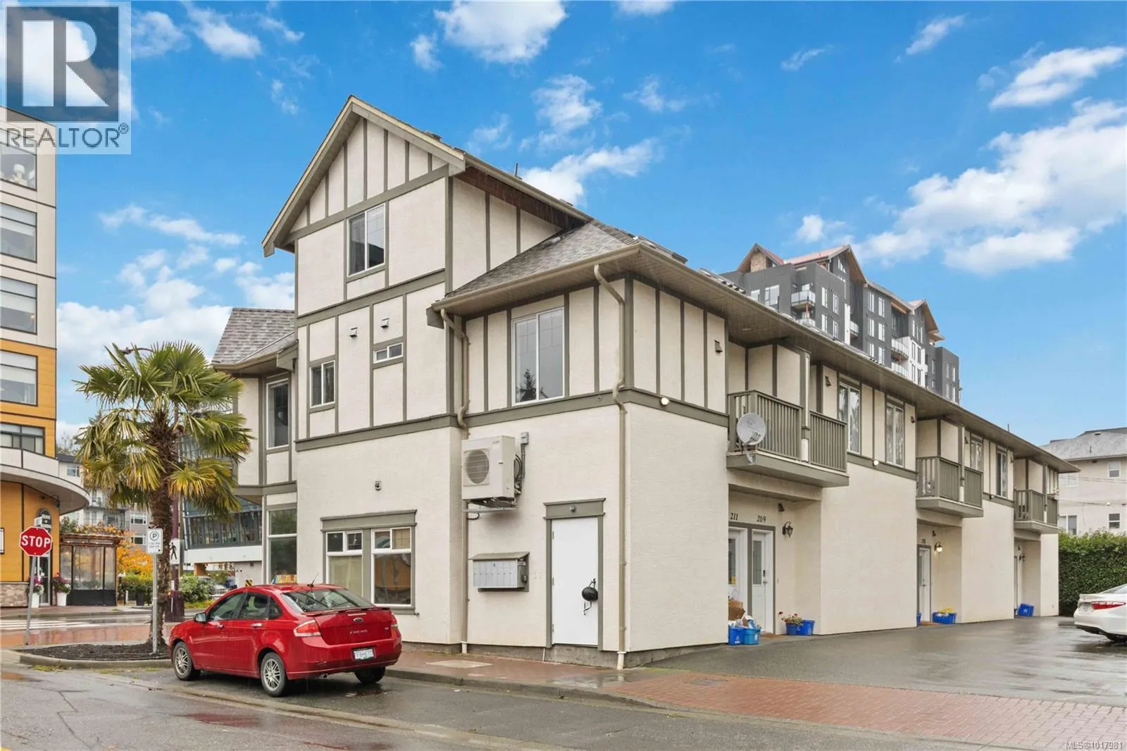 Brimming with charm and convenience, this 2-bedroom, 3-story townhome sits in the heart of Langfordâsteps from cafés, restaurants, and shopping. This bright corner unit has been freshly painted and features a new backsplash, hard surface floors, and an updated bathroom for a clean, move-in ready feel. The main level offers soaring vaulted ceilings, an eat-up kitchen bar, smart storage, a bedroom, and a full bathroom. Upstairs, the loft-style primary suite overlooks the living area below, creating a private retreat. Located directly across from the popular House of Boateng, this home boasts an unbeatable walk score, great transit options, parking, nearby schools, and easy commuter access. Stylish, low-maintenance, and full of lightâdiscover your next home where it all happens in Langford! (id:27476)