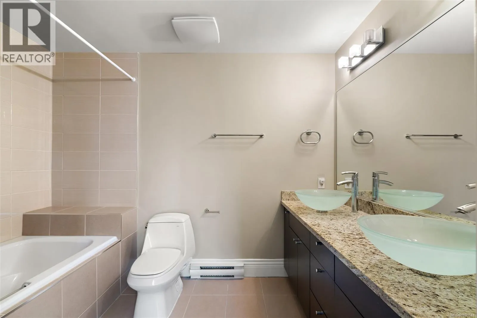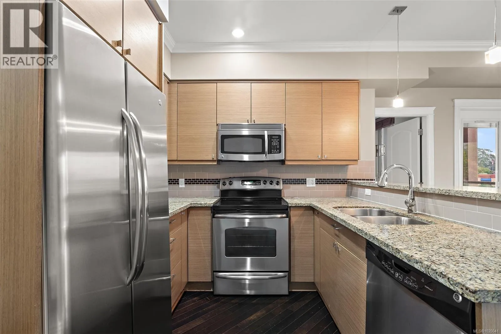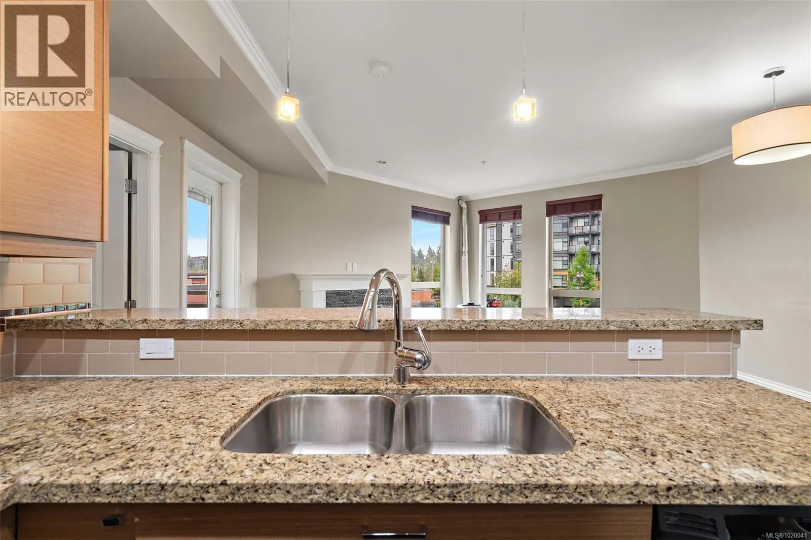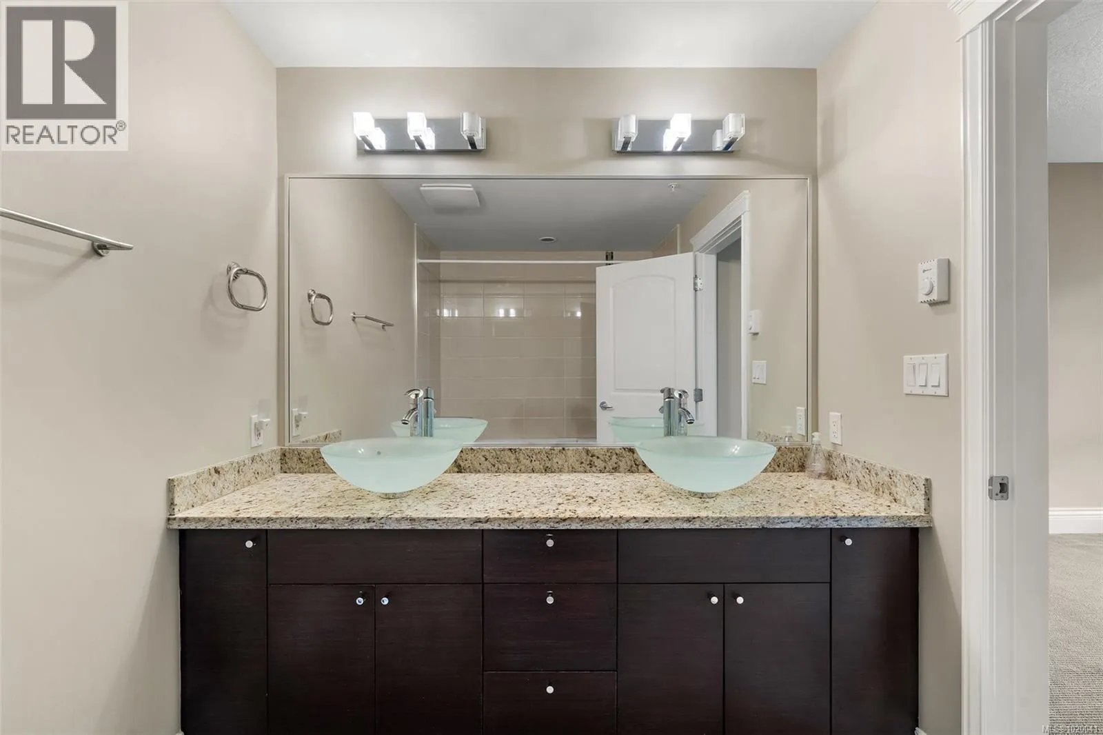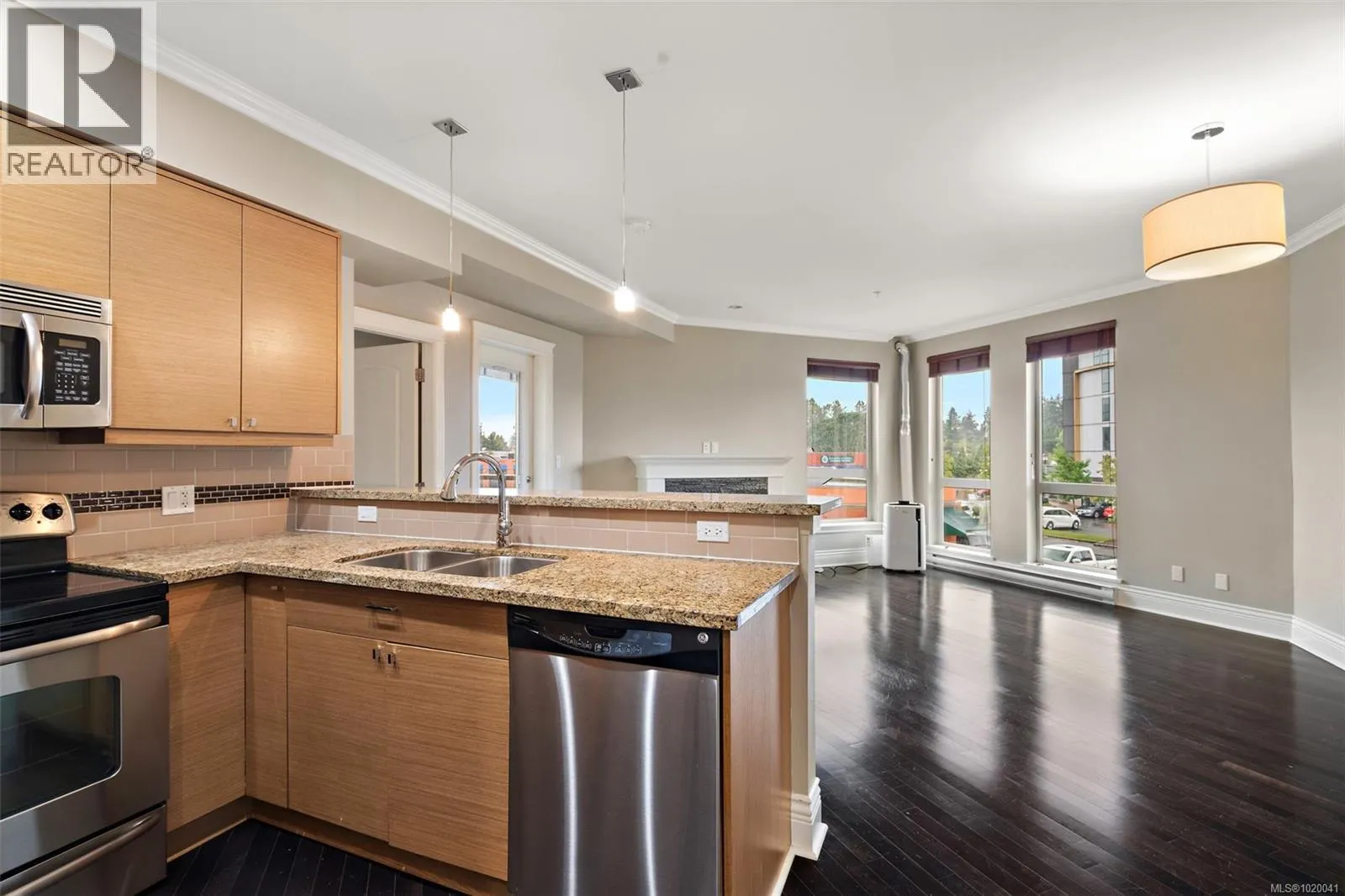 Discover this stunning 2-bedroom, 2-bath unit located in the heart of Langford. Comes with a secure underground parking stall and a storage unit, this home combines value, comfort, and convenience. Brand new dishwasher and microwave combination were just installed The 8 foot 9 inch-foot ceilings, with oversized windows flood the space with natural light, beautiful hardwood floors and carpeted bedrooms The kitchen features granite countertops, a stylish eating bar, an open dining and living areasâperfect for entertaining or simply relaxing at home. Unwind on your private balcony or retreat to the spacious primary bedroom that fits a king-size bed. A custom walk-in closet and ensuite with a tub make this suite a true retreat. Steps to all amenities , shopping, parks, and the new University (id:27476)