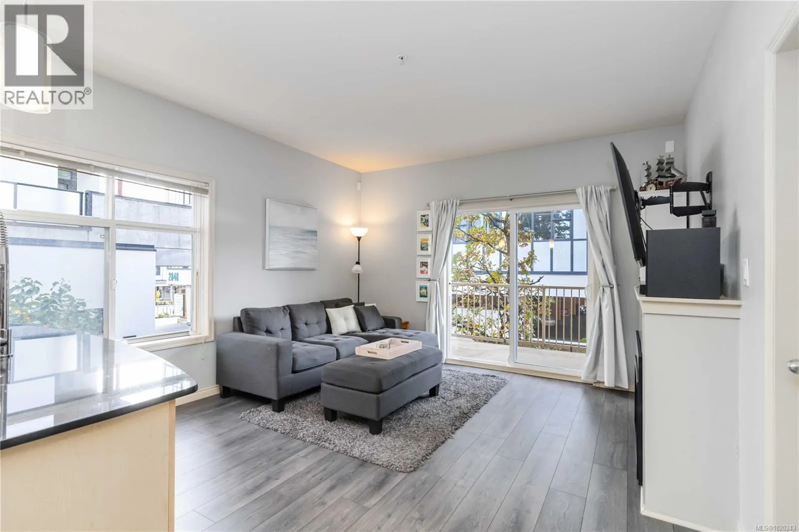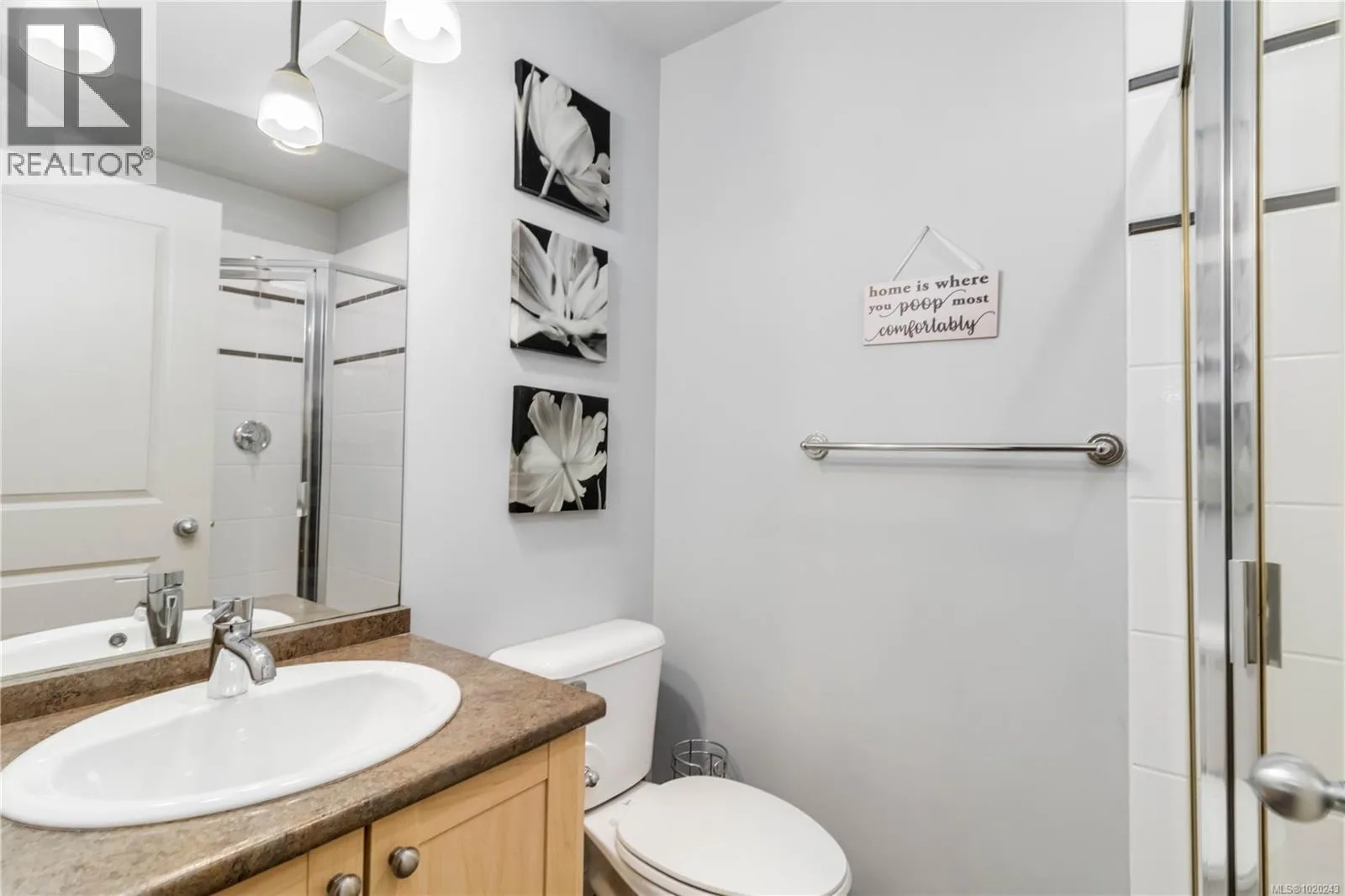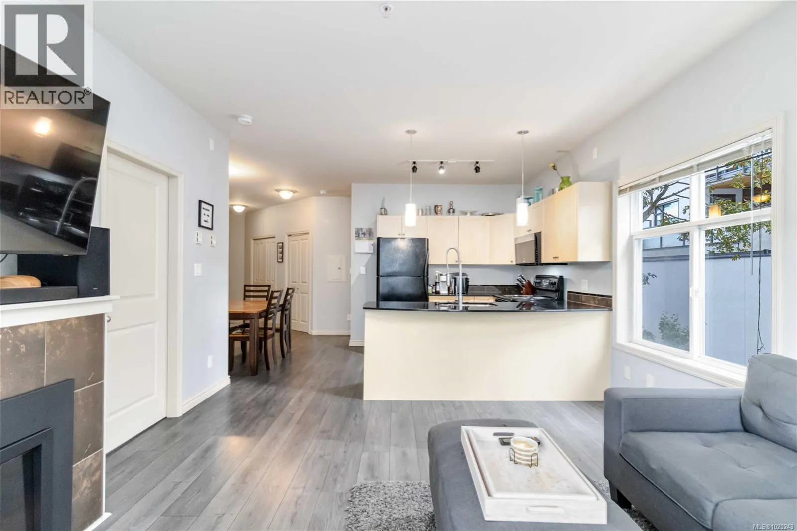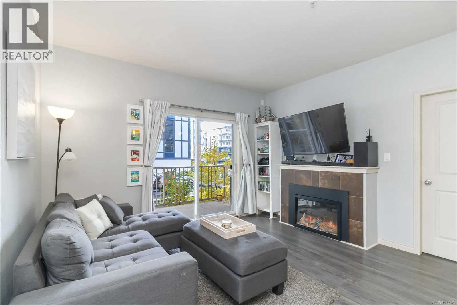 Corner unit in the heart of Langford! This bright and beautifully updated 2-bed/2-bath condo features brand new flooring, new in-suite laundry, fresh designer paint, and a stunning new fireplace. Built in 2006, the home offers sleek black granite countertops and an open-concept kitchen with a sit-up breakfast bar, complemented by 9 ft ceilings and excellent bedroom separation for added privacy. The spacious primary bedroom includes a full 4-piece ensuite with a soaker tub, while the second bedroom is served by a 3-piece bathroom. Enjoy the covered southwest-facing deckâperfect for afternoon sunâand the convenience of being just steps from Goldstream Village, bus routes, shopping, restaurants, and parks. Set in a well-maintained building with a small, close-knit strata and no size restrictions for dogs, this property offers comfort, community, and flexibility. Move-in ready and filled with natural light, this corner unit is a must-see! (id:27476)