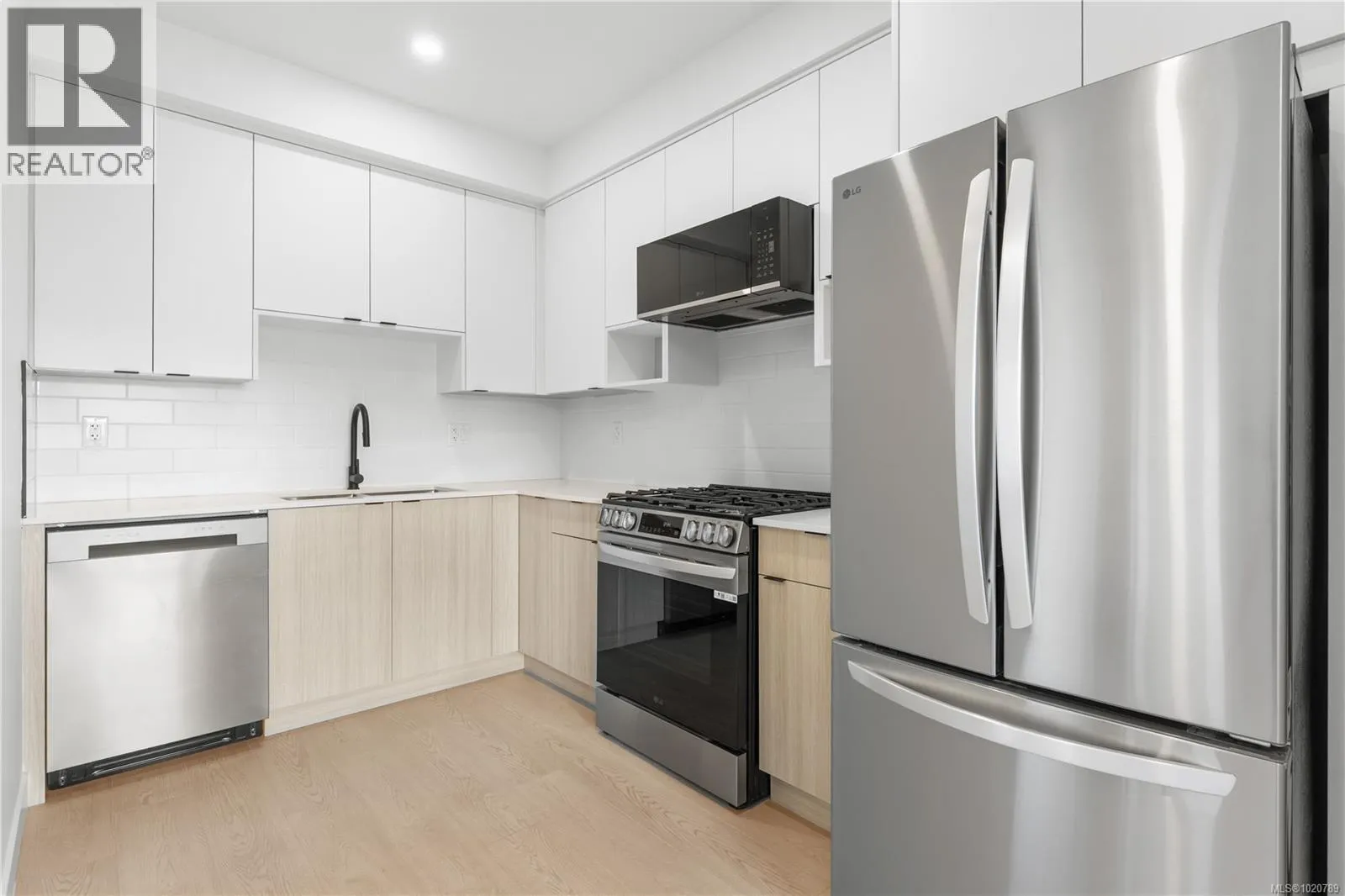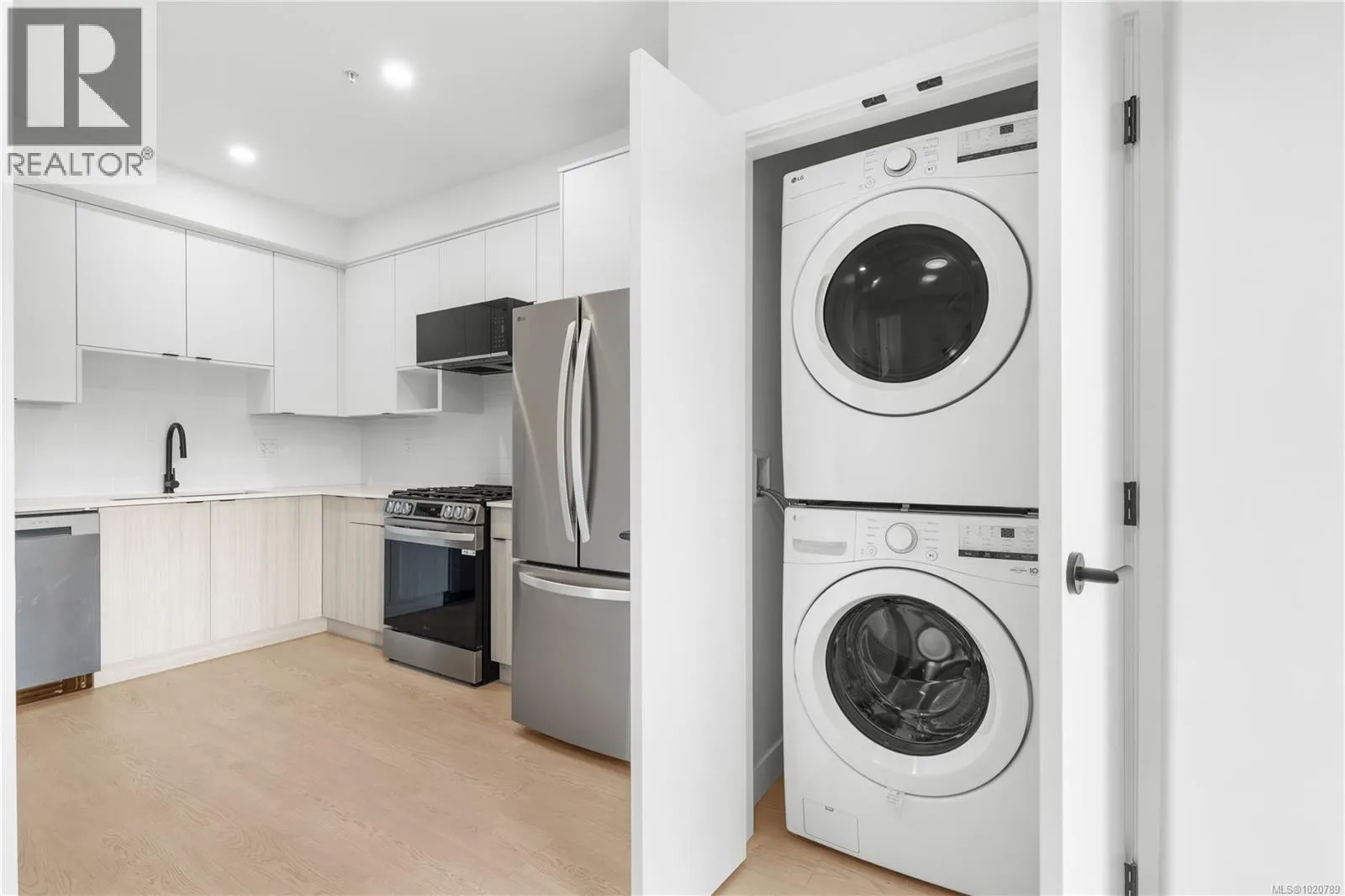 Welcome to Millstream Residences, built by renowned developer Landvision. This functional and thoughtfully designed 1 bedroom home offers 449 sqft of living space as well as a 56 sqft patio, perfect to enjoy during the warm summer months. The open living space features oversized windows that flood the space with tons of natural light, durable neutral flooring and matte black hardware and details throughout that anchor the home. The kitchen features SS LG appliances, quartz countertops and island and two-tone cabinetry with ample room for storage. The building features a large outdoor space where you can connect with your neighbours and enjoy the green spaces, seating, BBQâs and playground. Centrally located in the heart of Langford, you are just minutes from amazing amenities and recreation, schools, hiking trails, parks and lakes. (id:27476)