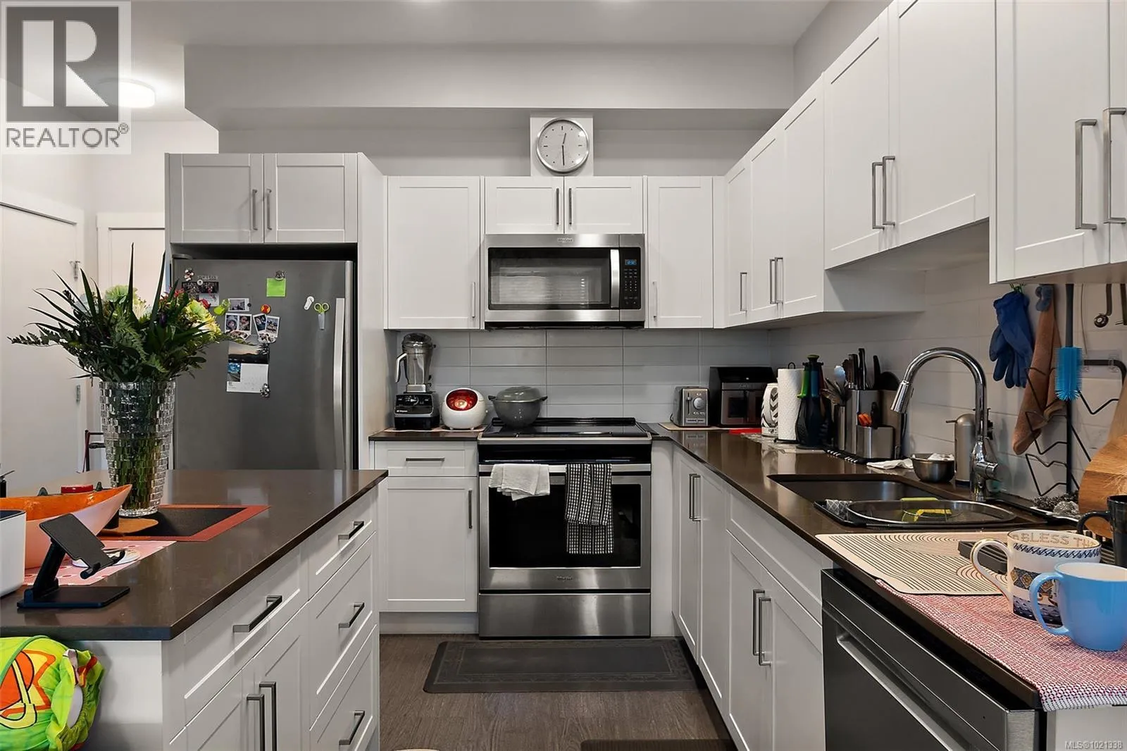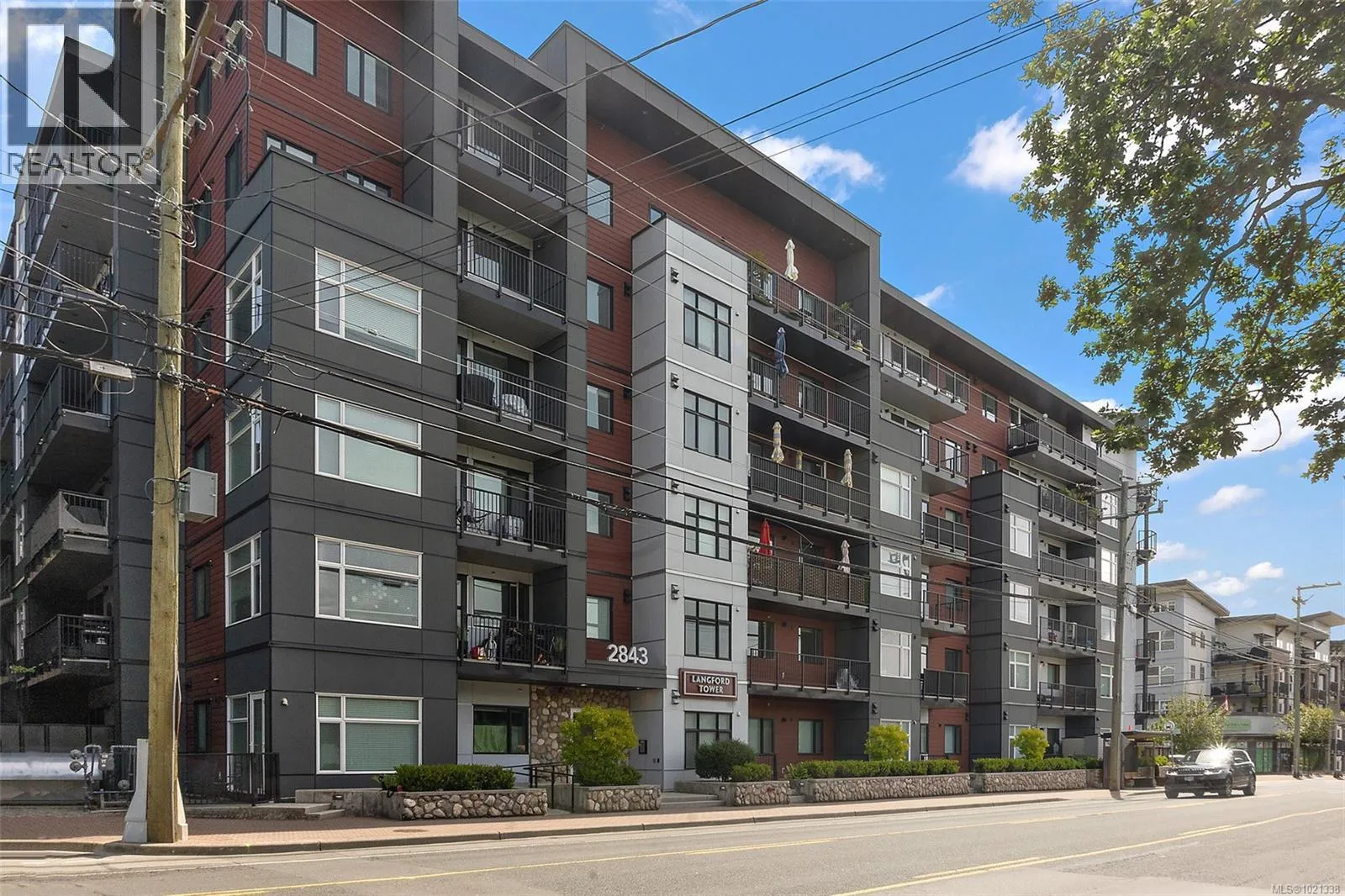 Built in 2020, Langford Towers delivers comfortable living in a well-managed, beautifully designed building. This top-floor unit has an excellent layout, with an open kitchen; two bedrooms on opposite sides of the living room; two bathrooms; and an extra area for den, office, or additional storage. Features include an ensuite and walk-in closet attached to the primary bedroom; in-suite laundry; east-facing balcony on the quiet side of the building; as well as secure, underground parking and bike room. The building has a tranquil outdoor courtyard to share with your neighbours and guests. This central location is within easy reach of big box stores as well as local favourites for meals out, like House of Boateng, Jones BBQ, and Floydâs Diner. A short drive will take you to Langford Lake, Royal Colwood Golf Club, Bear Mountain, Royal Roadâs campus, or Goldstream Provincial Park. This home will make a great option for new buyers, investors, or seniors looking to downsize. (id:27476)