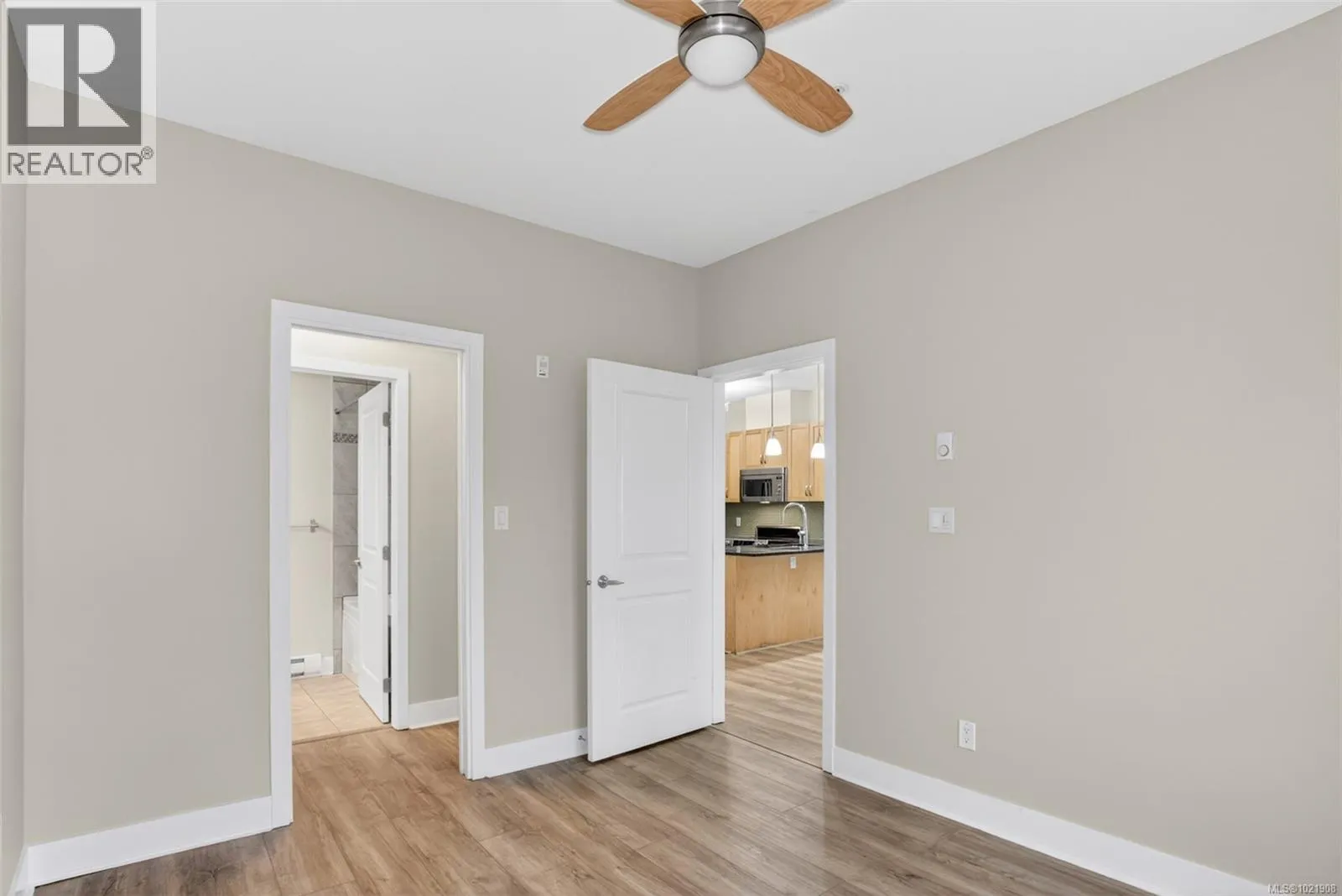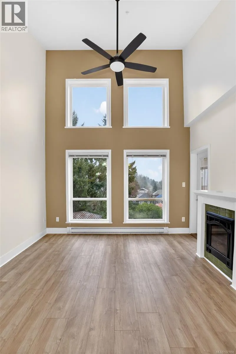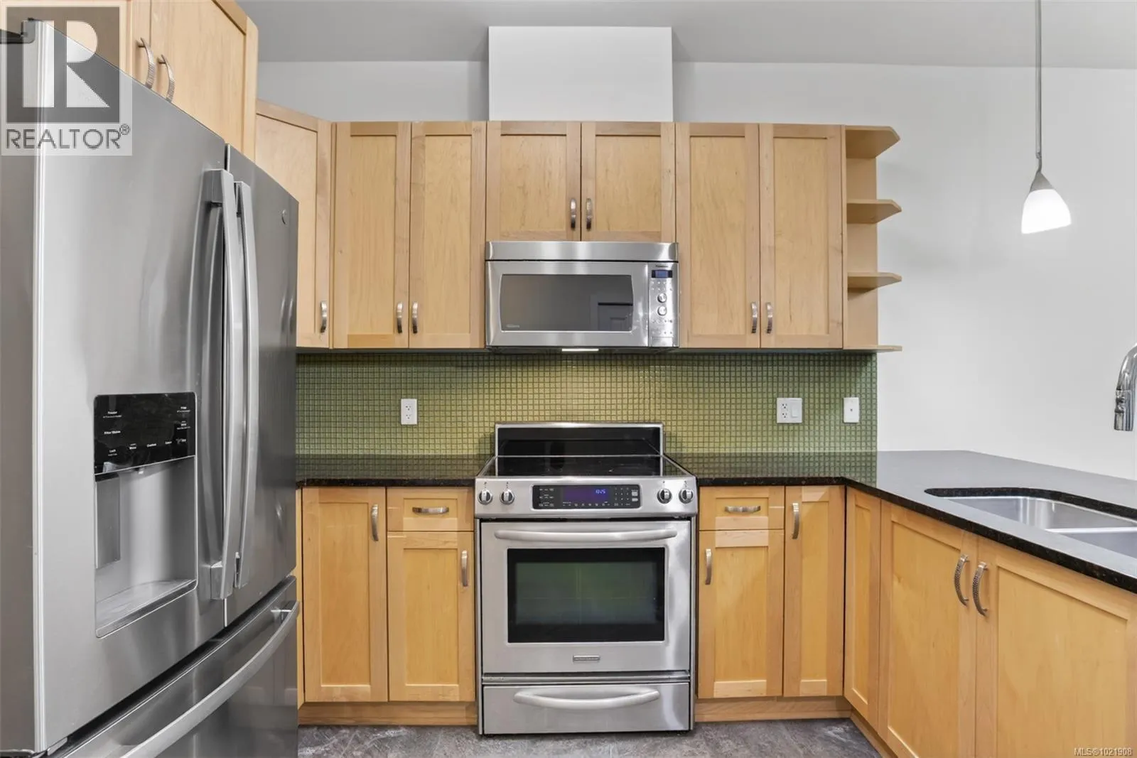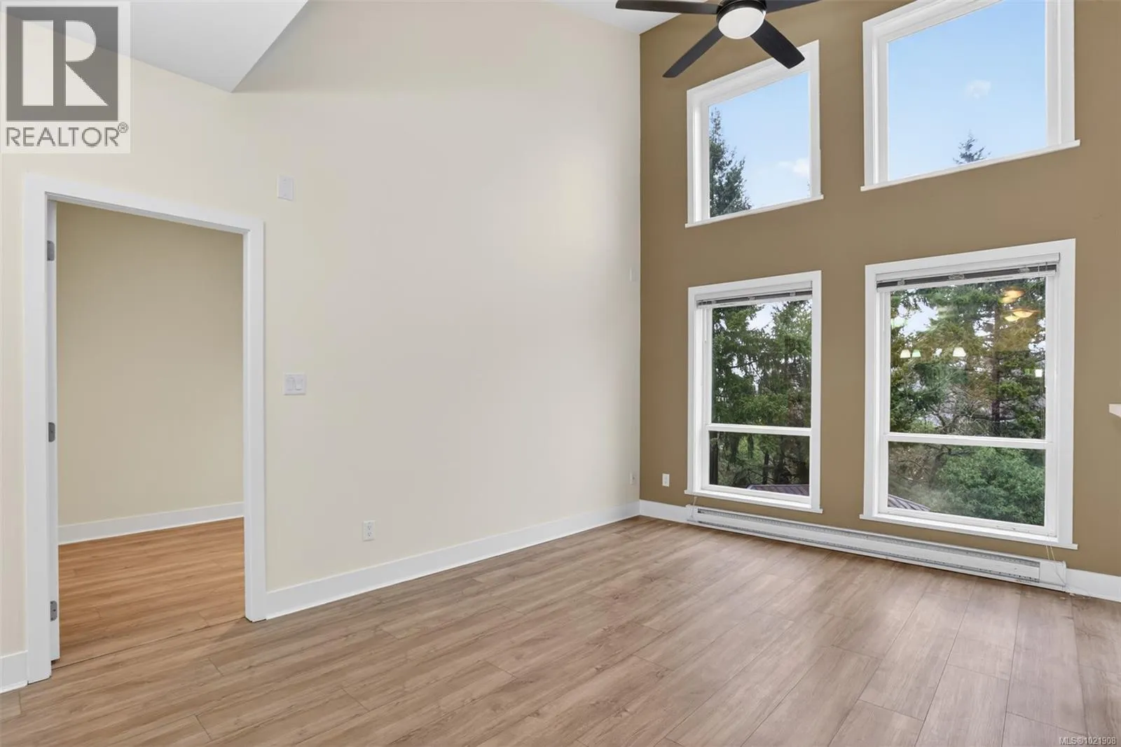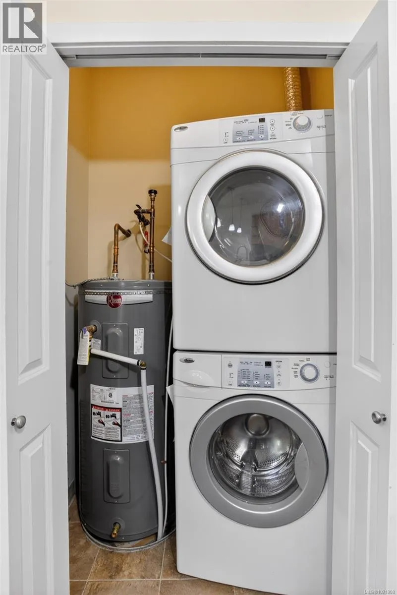 Welcome to Casa Bella, a sought-after condo community tucked away on a quiet street in the heart of Langford. This bright and spacious 2-bedroom, 2-bathroom top-floor unit offers a thoughtful layout with stylish finishes and an abundance of natural light. The open-concept kitchen features stainless steel appliances, quartz countertops, and a convenient eating bar, making it perfect for casual meals or entertaining. In the living room, dramatic vaulted ceilings rise from 9 to 15 feet, complemented by large windows that overlook the beautifully landscaped courtyard below. Step outside to your private balcony where you can enjoy peaceful views of the gardens, walking paths, and surrounding greenery. The primary bedroom includes a full ensuite with a deep soaker tub, ideal for winding down after a long day. The second bedroom is a flexible space that works well as a guest room or office (please note, no closet). In-suite laundry, secure underground parking, and a separate storage locker add to the convenience. Residents at Casa Bella enjoy access to a fully equipped fitness centre and a games room, all set within a park-like setting. With quick access to Millstream Road and Hwy 1, commuting is easy whether youâre heading downtown or up-island. Donât miss this opportunity to own a stylish top-floor condo in a well-managed and pet-friendly building. Book your showing today! (id:27476)