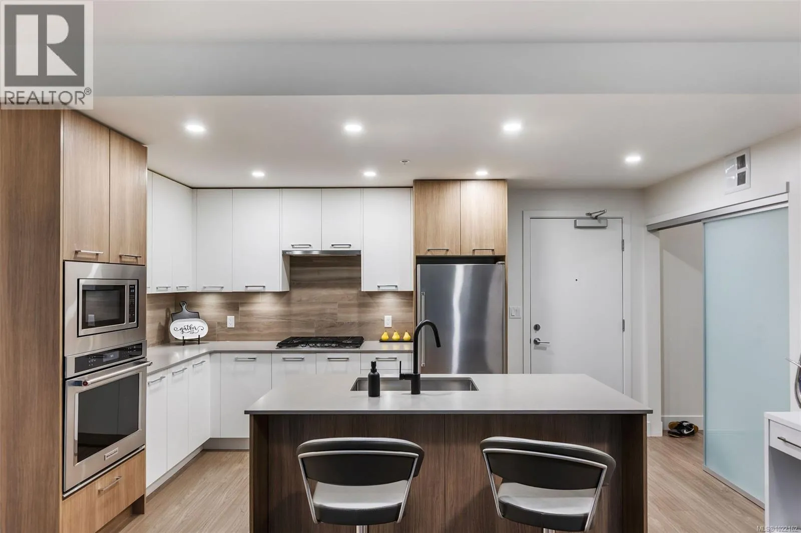 GORGEOUS mint-condition 2 BEDROOM + DEN condo overlooking the Galloping Goose Trail with 2 UNDERGROUND PARKING spots! Bright, sunny, and spacious with a smart, functional layout ideal for everyday living and entertaining. Open-concept floor plan with excellent natural light and seamless flow to a PRIVATE BALCONY, perfect for morning coffee or unwinding at the end of the day. Chef's kitchen features a large island, GAS STOVE, ample built-in cabinetry, and tons of prep space. Large primary bedroom with WALK-IN CLOSET plus IN-SUITE LAUNDRY! PET FRIENDLY building with a PRIVATE LOCKER, bike spaces, repair facilities + pet wash station. Outdoor BBQ patio and fire pit area plus a beautiful in-house party space. Unbeatable location next to Victor Chen park and right on the walking, biking, and running paths of the Galloping Goose Trail. Easy access to Costco and literally just steps to Belmont Market w/ Starbucks, grocery shopping, restaurants and transit. Book your private viewing today! (id:27476)